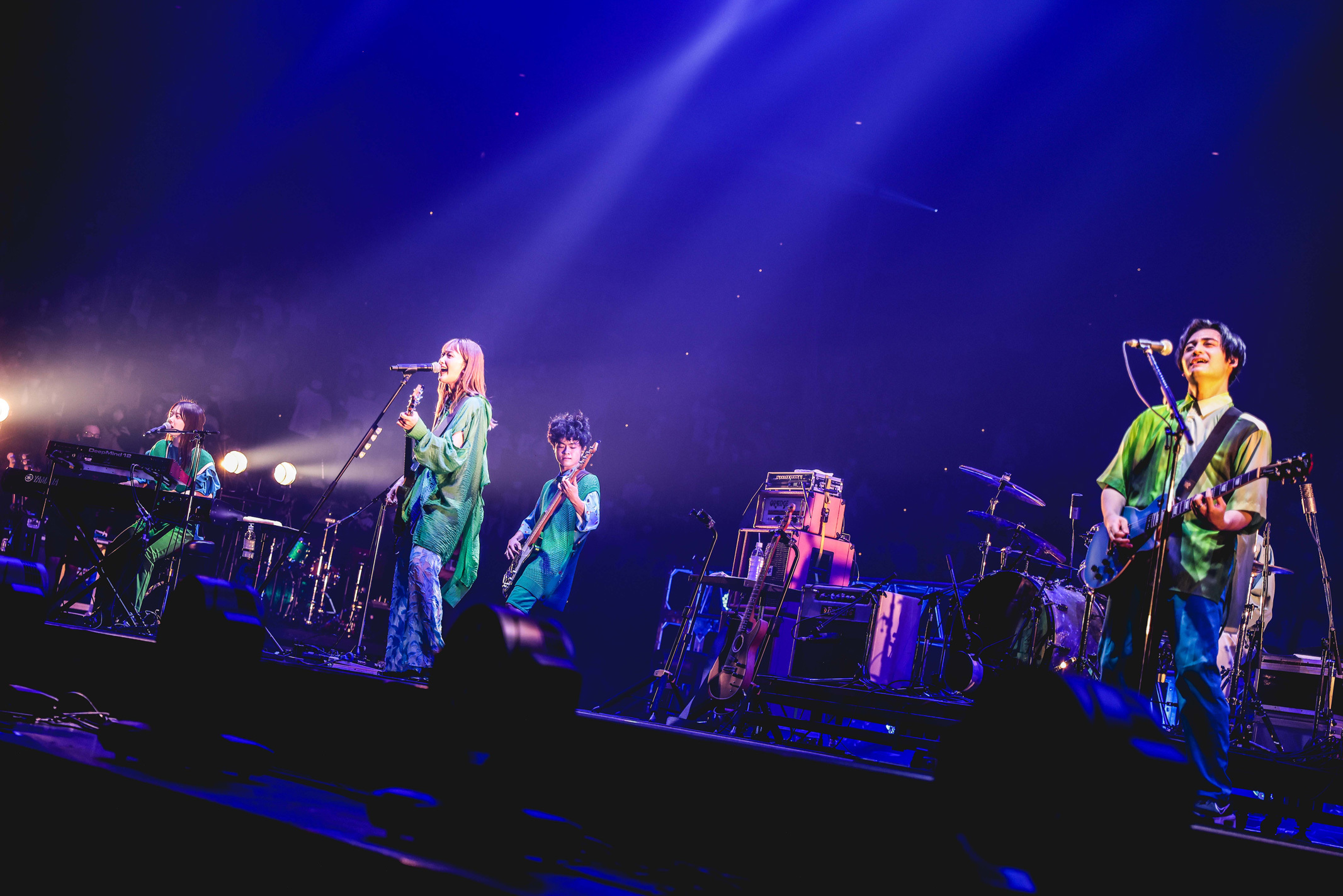 先日、武道館2DAYS公演を終え、新たなるステージへと走り出した緑黄色社会。大きな拍手で迎えられたメンバーの鮮やかなグリーン&ブルーの衣装がステージに映える。ライブの幕開けを華々しく飾るナンバー「始まりの歌」では、圧倒的な声量を誇る長屋春子(Vo.Gt)と小林壱誓(Gt)のツインボーカルがパワフルに大阪城ホールを包み込み、現在のバンドの勢いを感じさせる生命力漲るサウンドであっという間に広い会場をリョクシャ化!