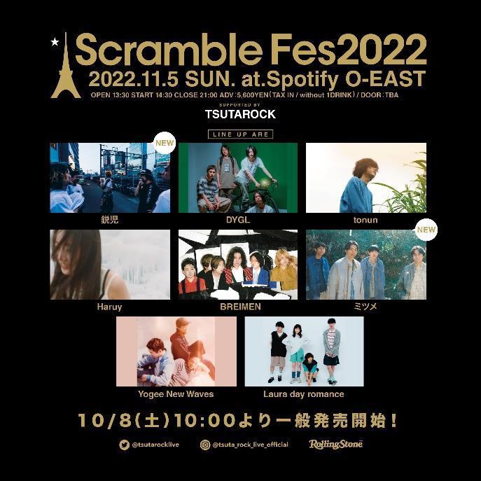 11月5日(土)にSpotify O-EASTにて開催される『Scramble Fes 2022』の全ラインナップが発表。最終追加アーティストには鋭児、ミツメの2組が決定した。同時に10月8日(土)10時より、各プレイガイドにて一般発売が開始される。
