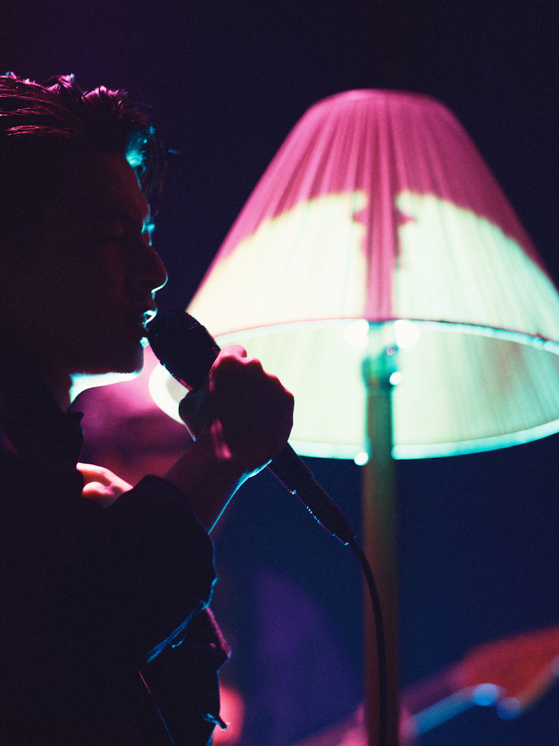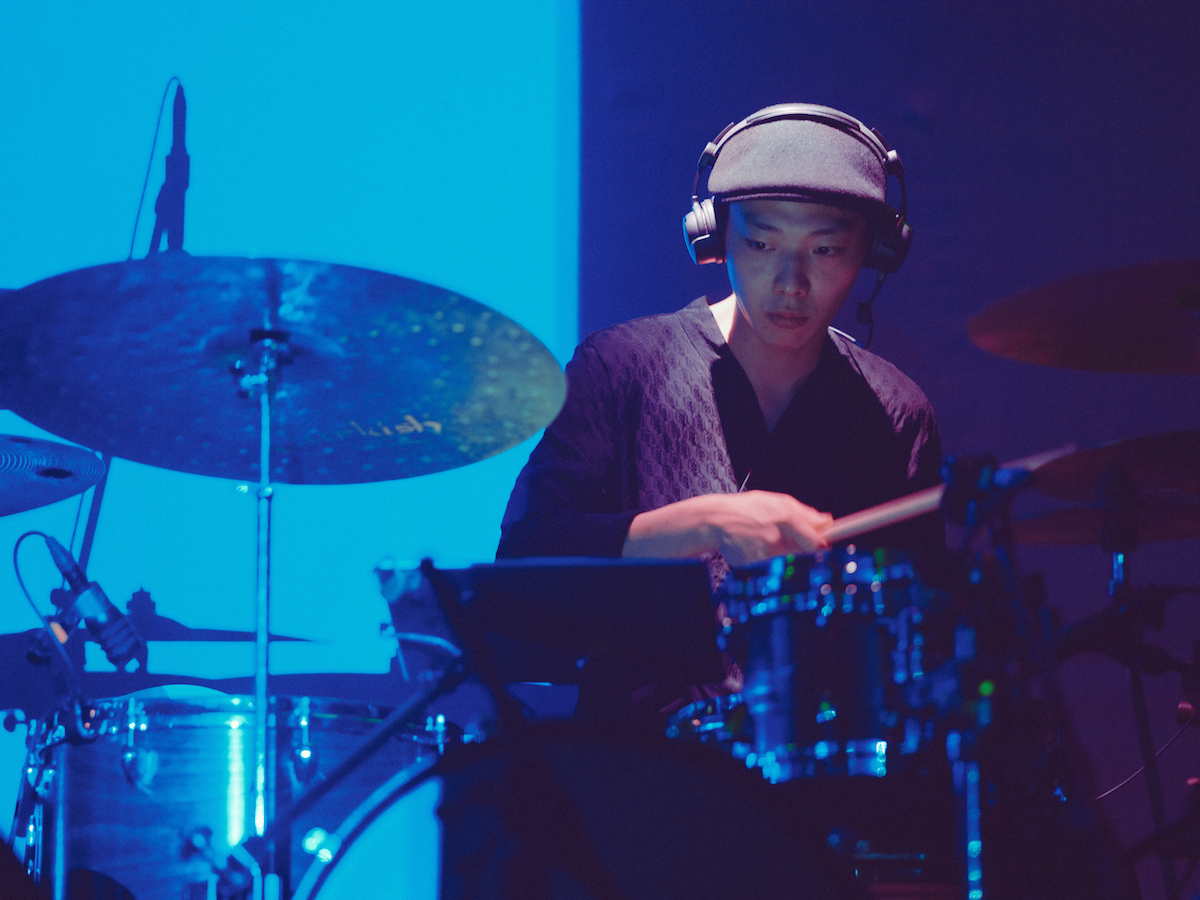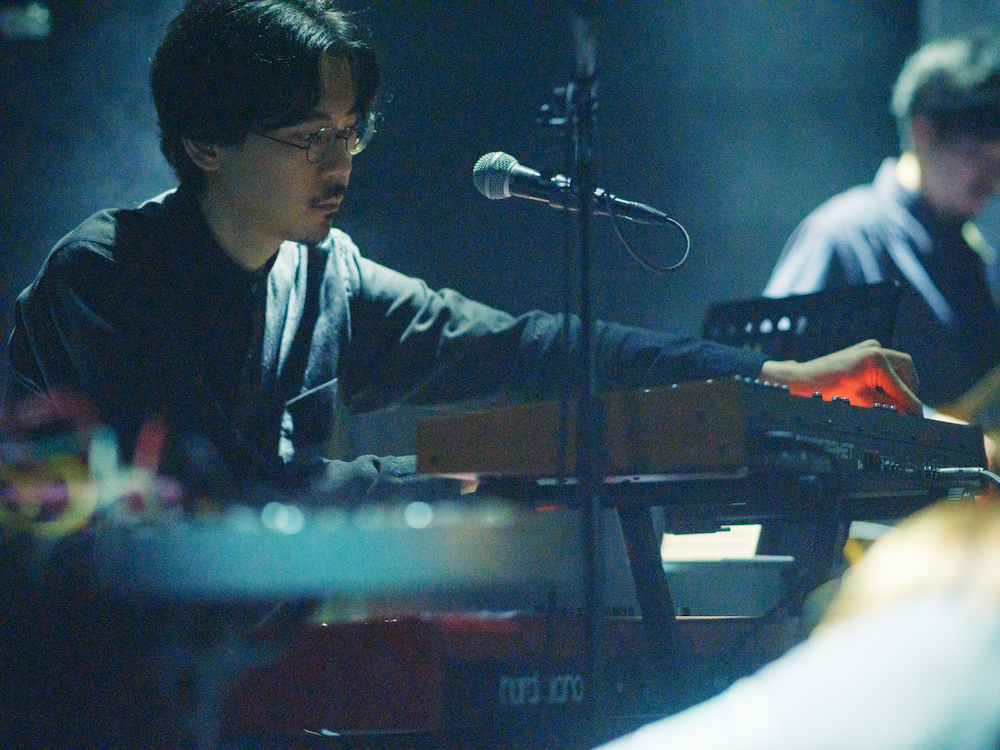 6人が位置に着くと長いインストが演奏される。ギターなのかシンセなのか判別し難い音が鳴り、民族楽器的な鳴り物を大井が操作し、Shaikh Sofian(Ba)のシンセベースがさらに空間を拡張。「狭い部屋 (Rearrange)」がさらにアップデートされている。映像は前回同様、ピンホールの同心円が大きくなるもの。椅子に座るミゾベの後ろに位置する岡田がまるで陰の支配者のように見えてしまうのだが、恐らく音響的にベストポジションなのだろう。続いて押し寄せる波のような森山のピアノリフが存在感を示す「独り」では、大井の特性であるジャストなビートとタイトな音色でライブアレンジの印象がこれまでと変わった。さらにパラノイアックな展開を見せていた「four eyes」が生音の精緻なハイハットワークや、グッとフィジカルに訴える明快なリズム、細井が出し続けているSE的なノイズによって、曲として生まれ変わっていた。そこでふと気づく。ミゾべのボーカルの安定感がすこぶる前進していることに。
