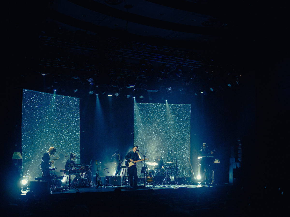 ライブアレンジならではのサックスの音色のようなギターのロングトーンに気が遠くなる「幸せ?」などは大井のジャストなリズムと森山のYMO好きがハマった感じが強い。非常に相性が良いと思えた。それまで定位置で歌っていたミゾべが前に出てきた「未来」、雪の映像が投影され紙吹雪が舞い降りてきた「三月」は、「未来」からの連続性を生み出す。