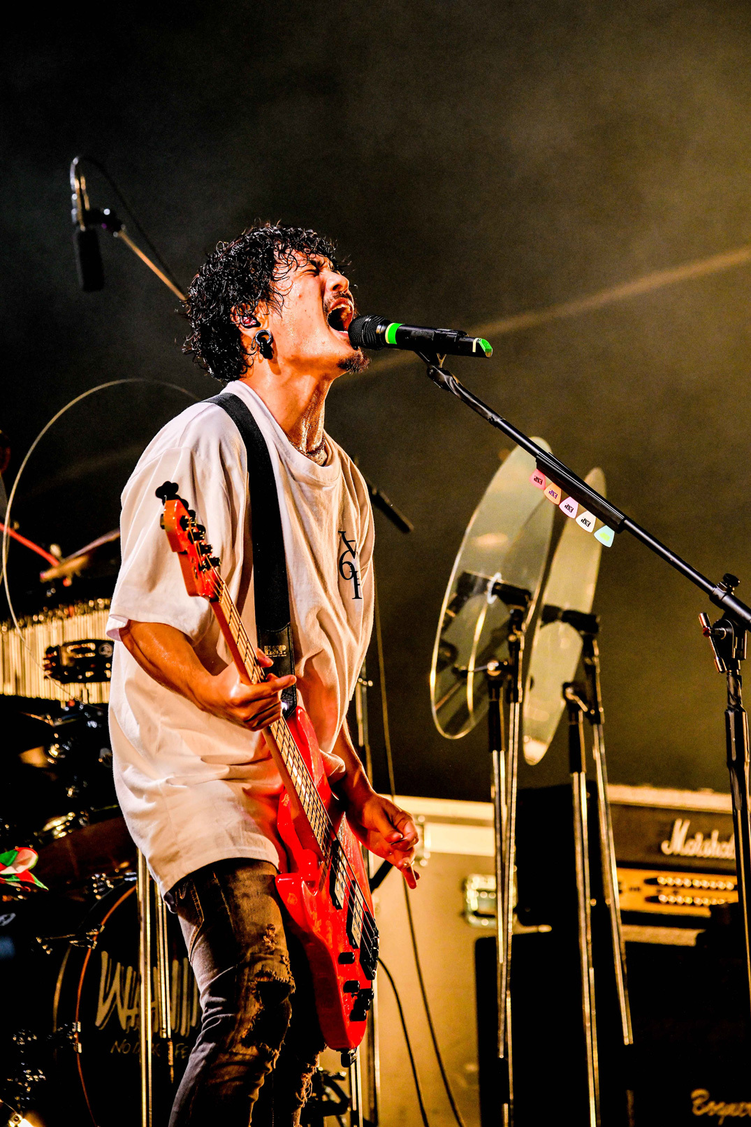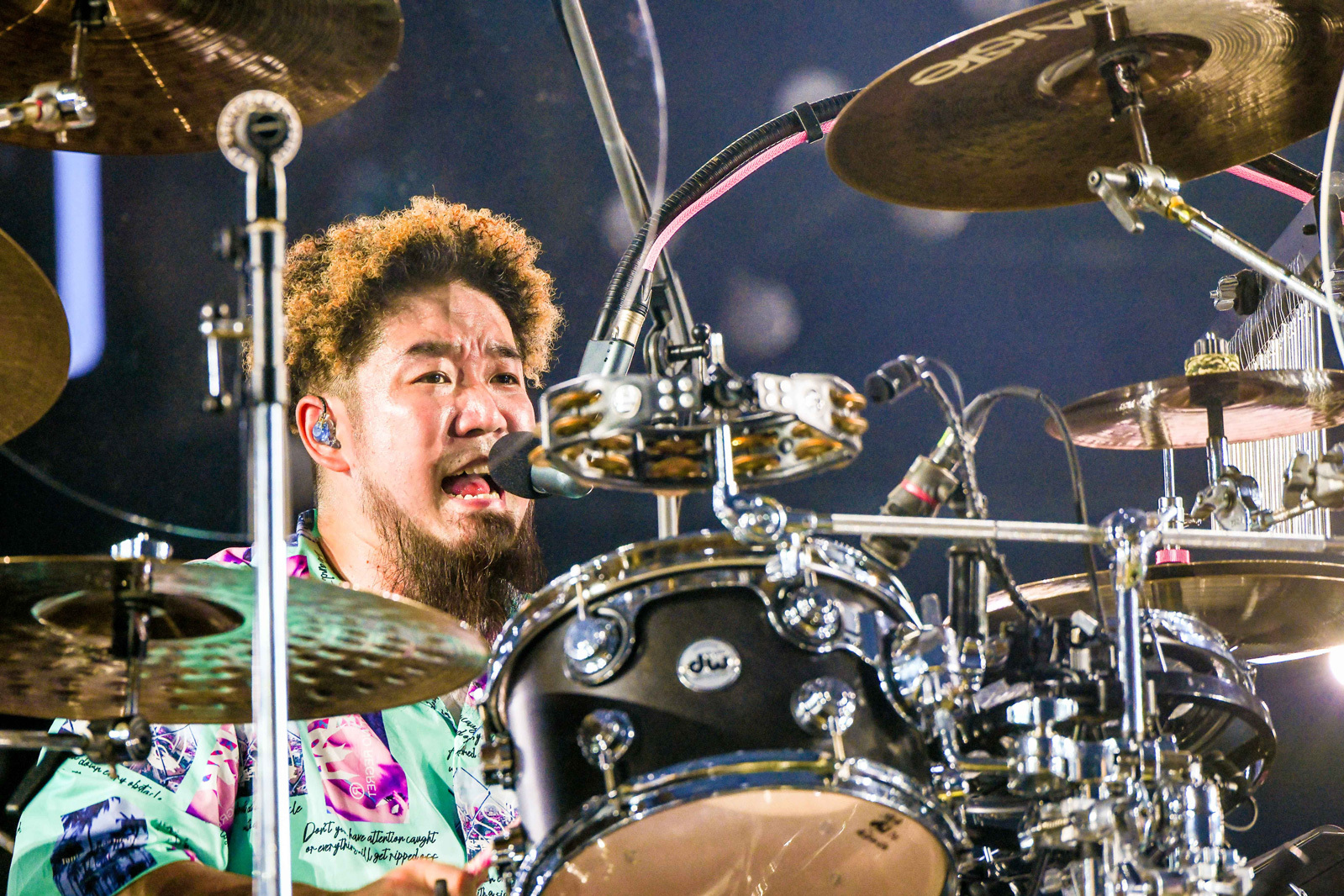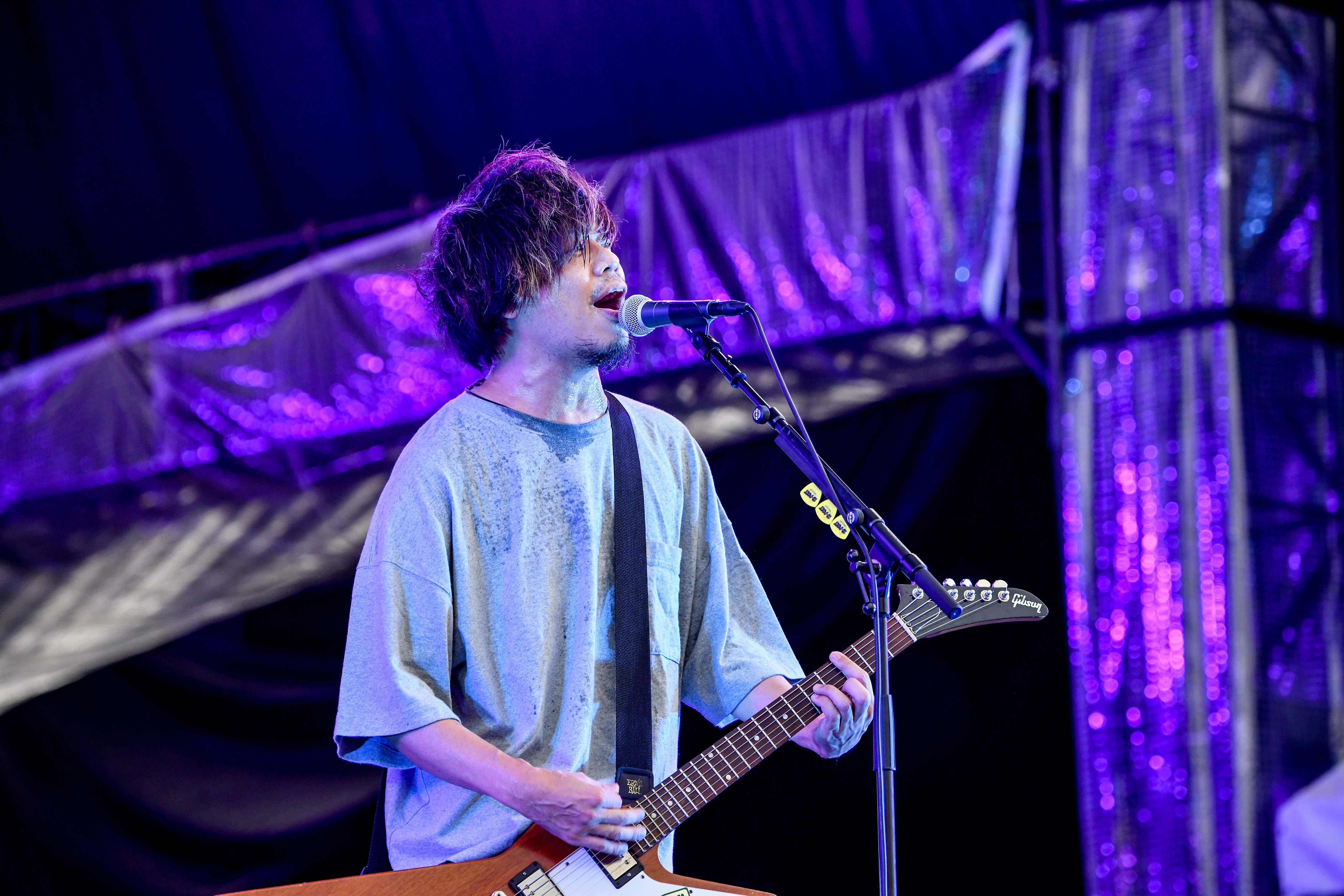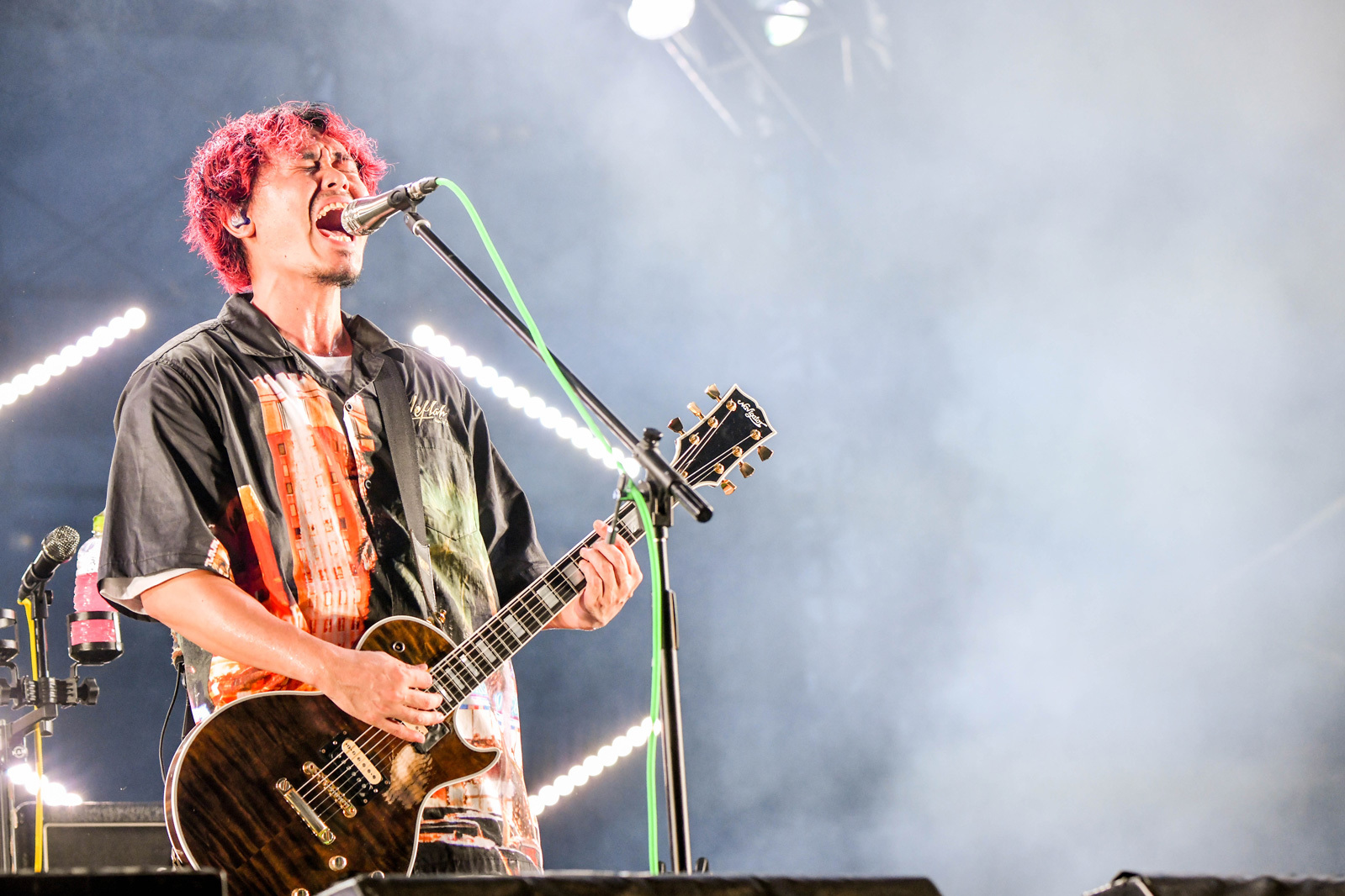 2曲目「カントリーロード」で、ギター関大地が回転横飛び→床に叩きつけられる、という自傷行為みたいなアクションを見せたり、3曲目「ファイト!!」で、ボーカル橋本学が歌いながら担いだ巨大なバンドフラッグを、ステージ前に落としてしまってスタッフに拾ってもらったり、序盤から飛ばしまくりのハルカミライ。「3年長かったな、みんなよく耐えたな。その分、最高な日になってるんじゃない? 俺はなってるね、間違いなく」。ラストの「To Bring BACK MEMORIES」を終えると「あと1分あるっぽいな」ともう一回「ファイト!!」を演奏、さらに「あと30秒? 「Bring~」だな」と「To Bring BACK MEMORIES」もリプレイした。