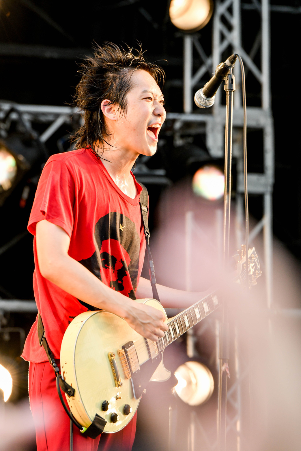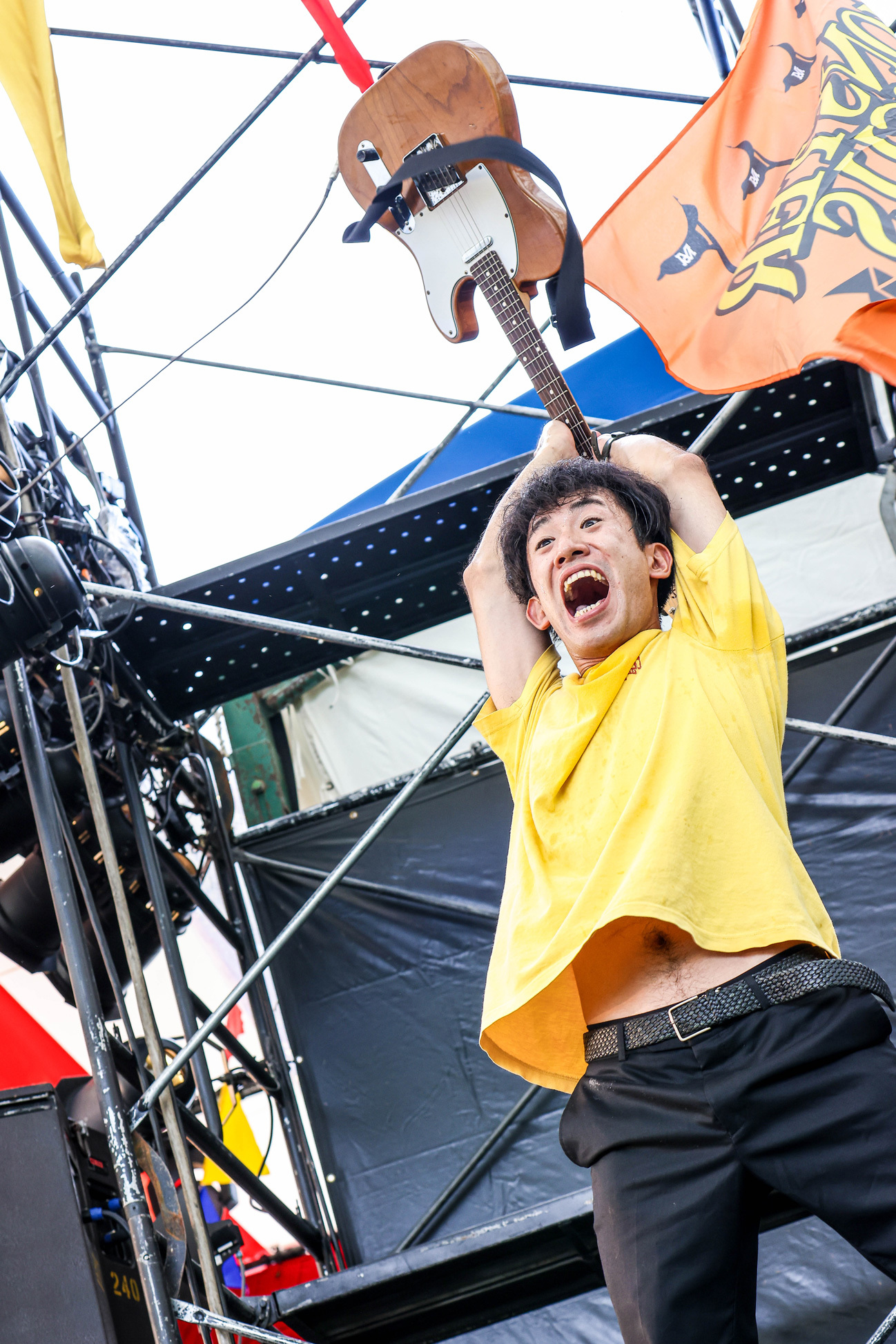 サウンドチェックでは本編でやらない曲を演奏する、だからファンはそこから観なきゃいけないのでおなじみのヤバイTシャツ屋さん、この日のリハでは「貴志駅周辺なんもない」に加えて、打首獄門同好会の「日本の米は世界一」をプレイ。咄嗟のアドリブだったようで、ちょっと演奏してすぐストップ、「あかん、打ち合わせもなしにやったら」「うん、リハーサルのリハーサルが必要や」などと言い合うメンバー。本番は、こやまたくやの「盛り上げるのに25分もいらないんですけど! 1曲で充分なんですけど!」という言葉からの「ハッピーウェディング前ソング」でスタートした。
