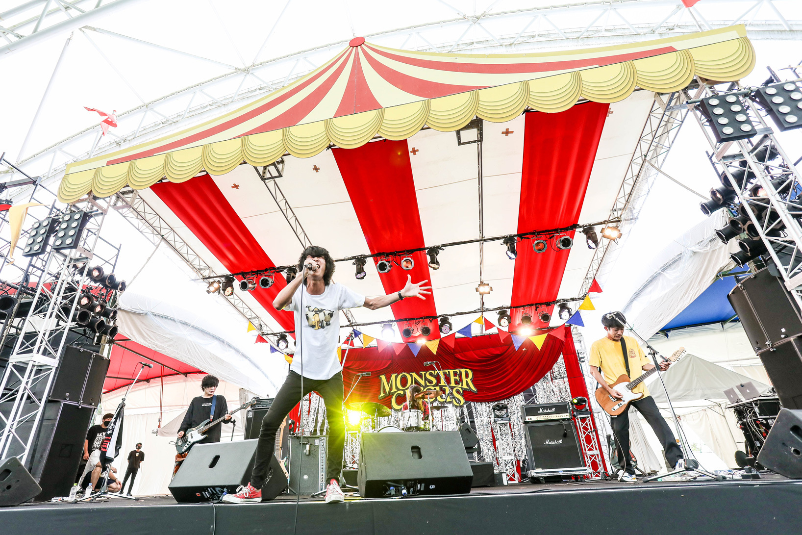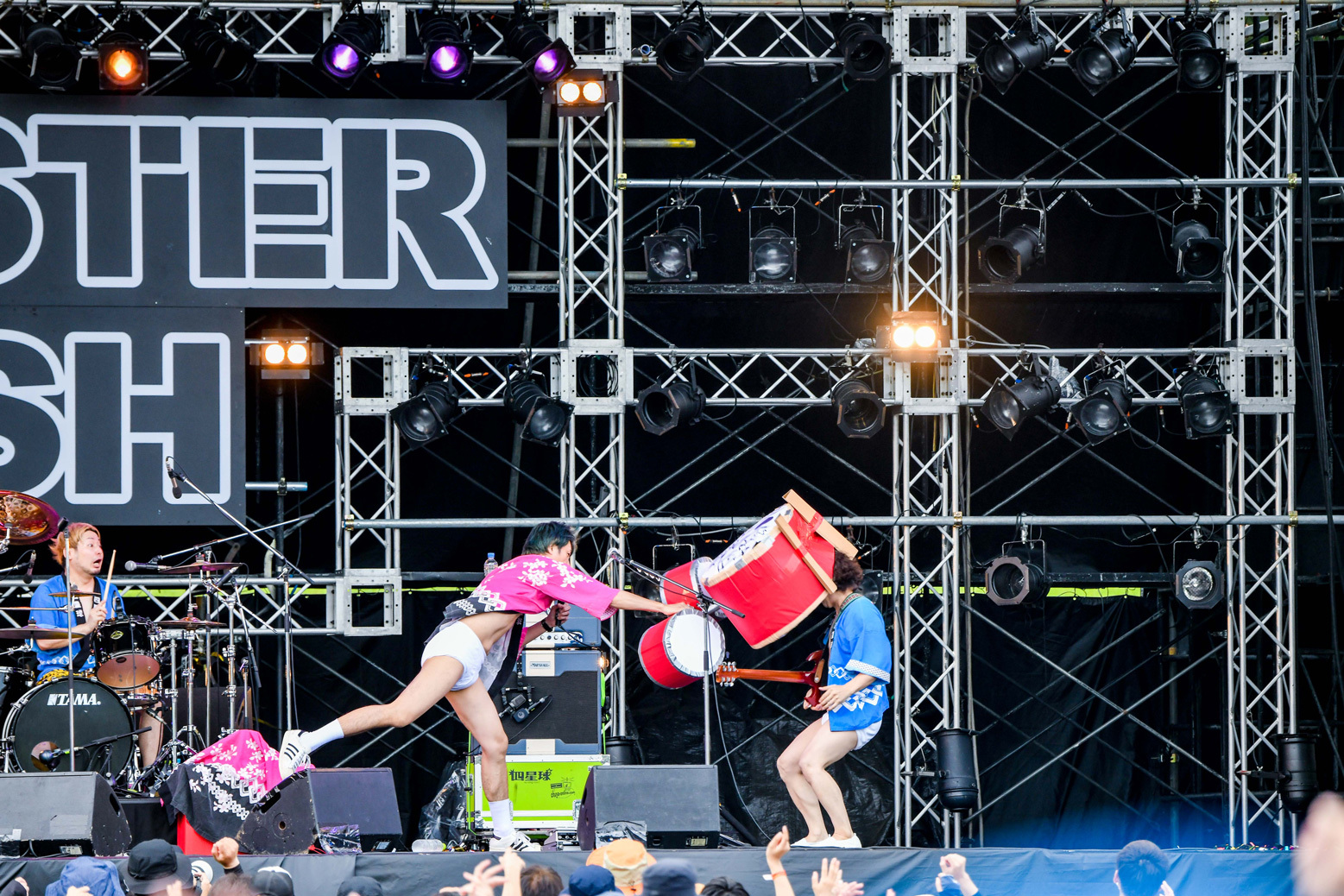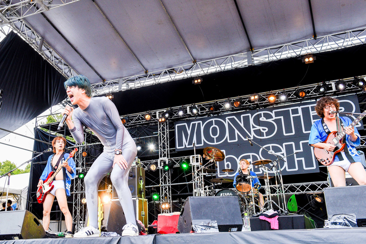 定家氏はそう話したが、言わずもがな四国は徳島在住のバンドであり、今や『モンバス』の顔とも言える彼ら。2008年に初出場してから毎年出場しているが、彼らもホームだからこそ気合いは充分。ギターまさやんお手製の段ボールで作ったドラムセットで、何の筋書きも無くただただメンバー同士で殴りあったりする姿を観ていると、意味なんか無くても、とにかく観客に衝撃を与えたいという気概を感じる。ここからたくさんの演者が登場するが、観客たちが週明け職場や学校や家庭で思わず思い出し笑いをしてしまう、そんなライブを魅せつけてくれた。