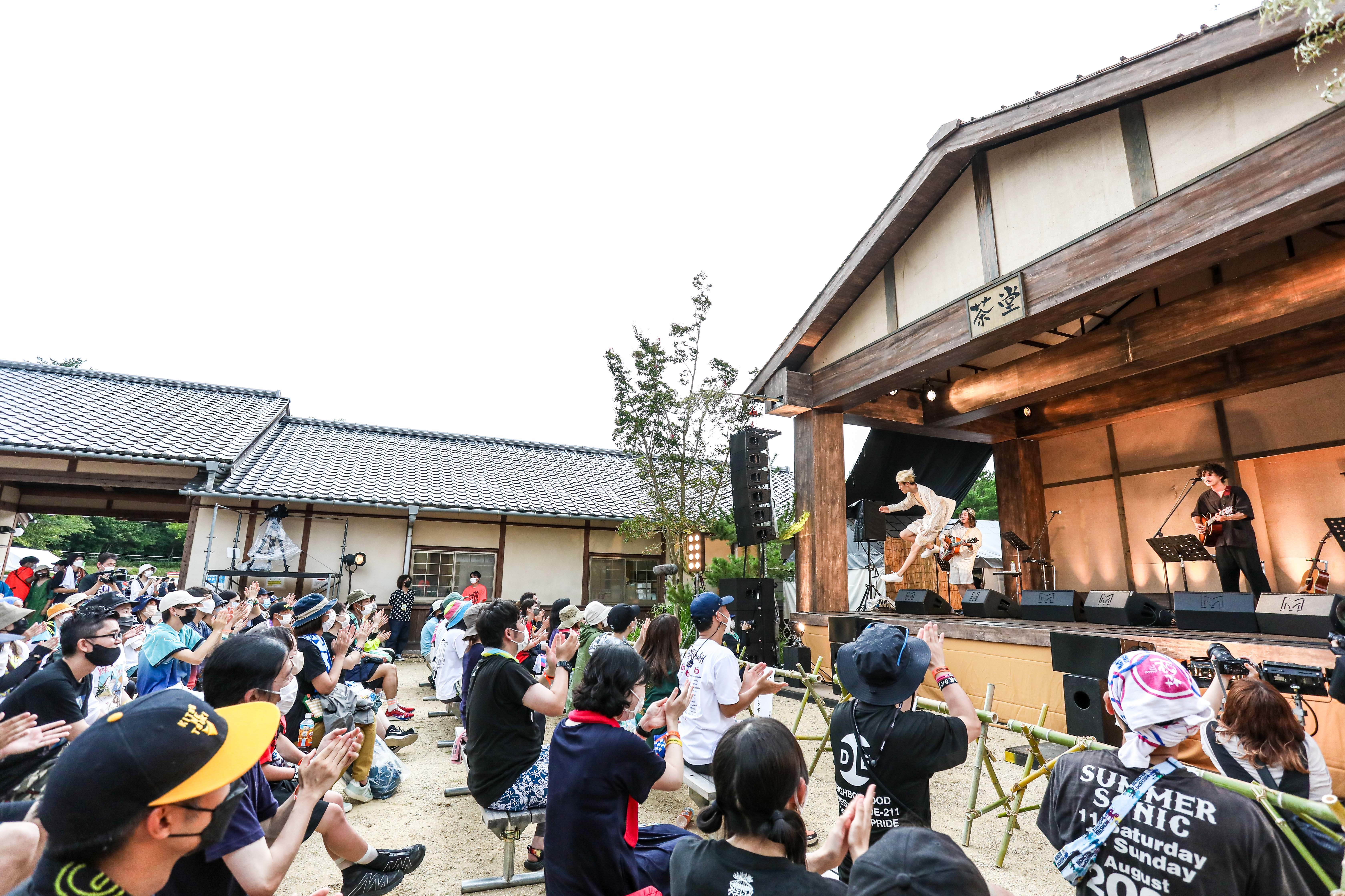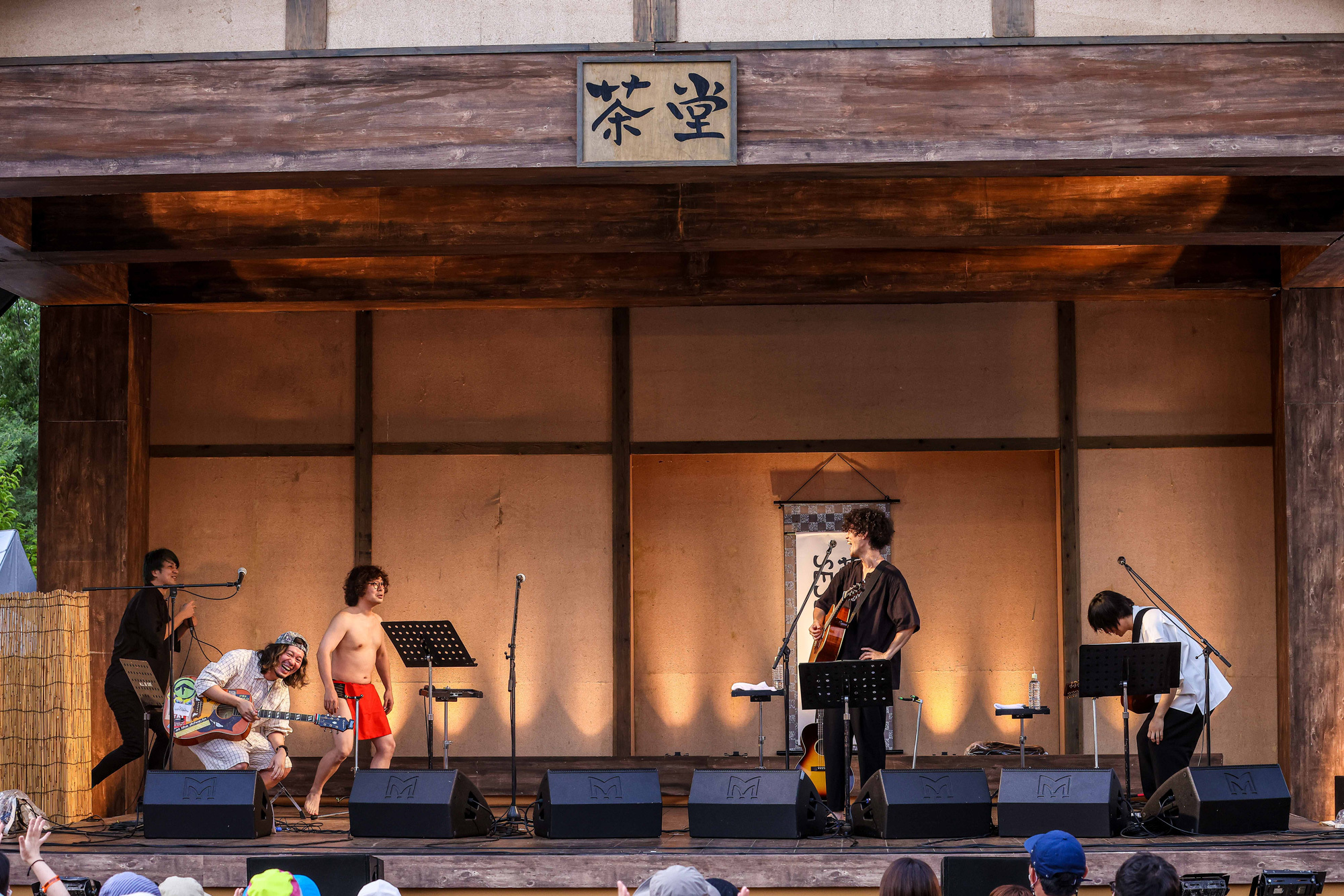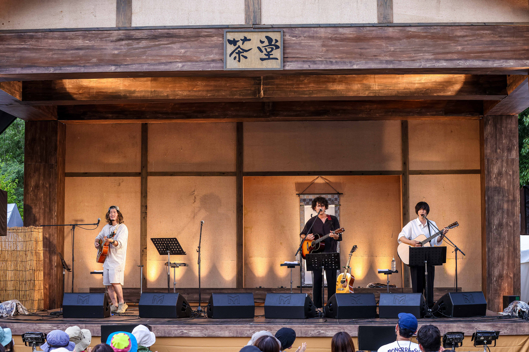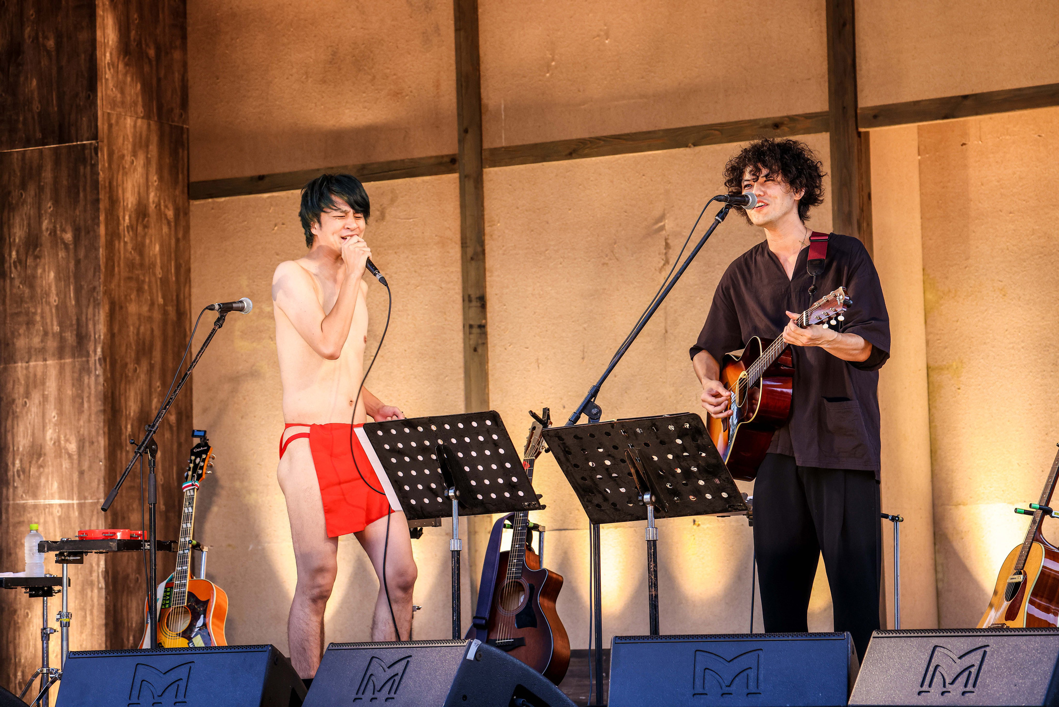 そんな座席あるステージながらDJセットで登場したのは、the telephonesから石毛輝とノブ。緩やかな茶堂をあっという間に賑わうディスコに早変わりさせたエネルギーはとてつもなかった。電気グルーヴ「虹」なども流れ、来年からDJステージもできたらなと願うくらいに楽しかった。そんな石毛&ノブのほか、林萌々子(Hump Back)、内澤崇仁(androp)、yamaも参加した菅原卓郎 SESSION2022。菅原、石毛、ノブと同い年であり、菅原と初絡みの四星球・北島が登場したのも『モンバス』ならではのブッキング。他出演者が紹介される度に毎回、北島がふんどし姿で登場するお約束も生まれたりと普段は絶対に観られないステージであった。