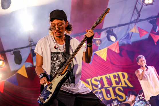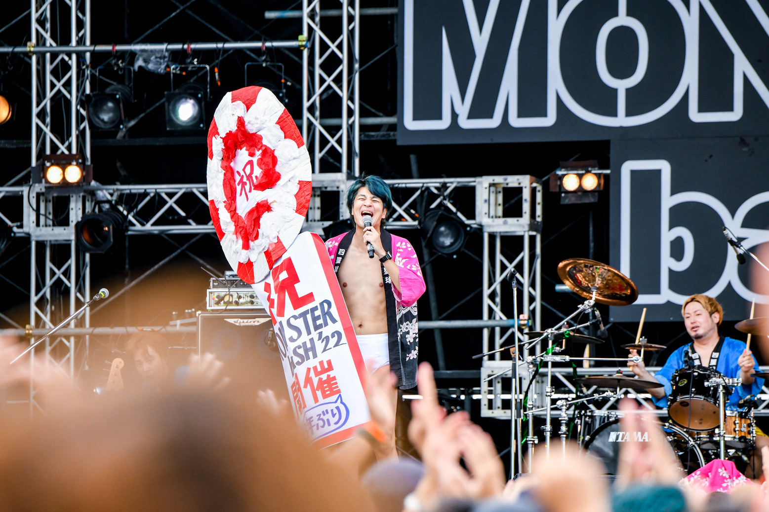 普段は照明演出を駆使したショーを行っているが、そういう作戦が効かない朝イチの野外であっても、堂々たるパフォーマンスをやれるバンドであることを立証した、神はサイコロを振らない。20分の持ち時間を短距離走のように駆け抜け、鮮烈な『モンバス』初出演を飾ったハンブレッダーズ。GENが「呼んでもらえたのは、ここにいるみなさんのおかげです!」と感謝の意を示し、ラストの「Just」の前に「困難な世の中ですけど、音楽を片手になんとか生き抜いていきましょう!」と呼びかけた04 Limited Sazabys。