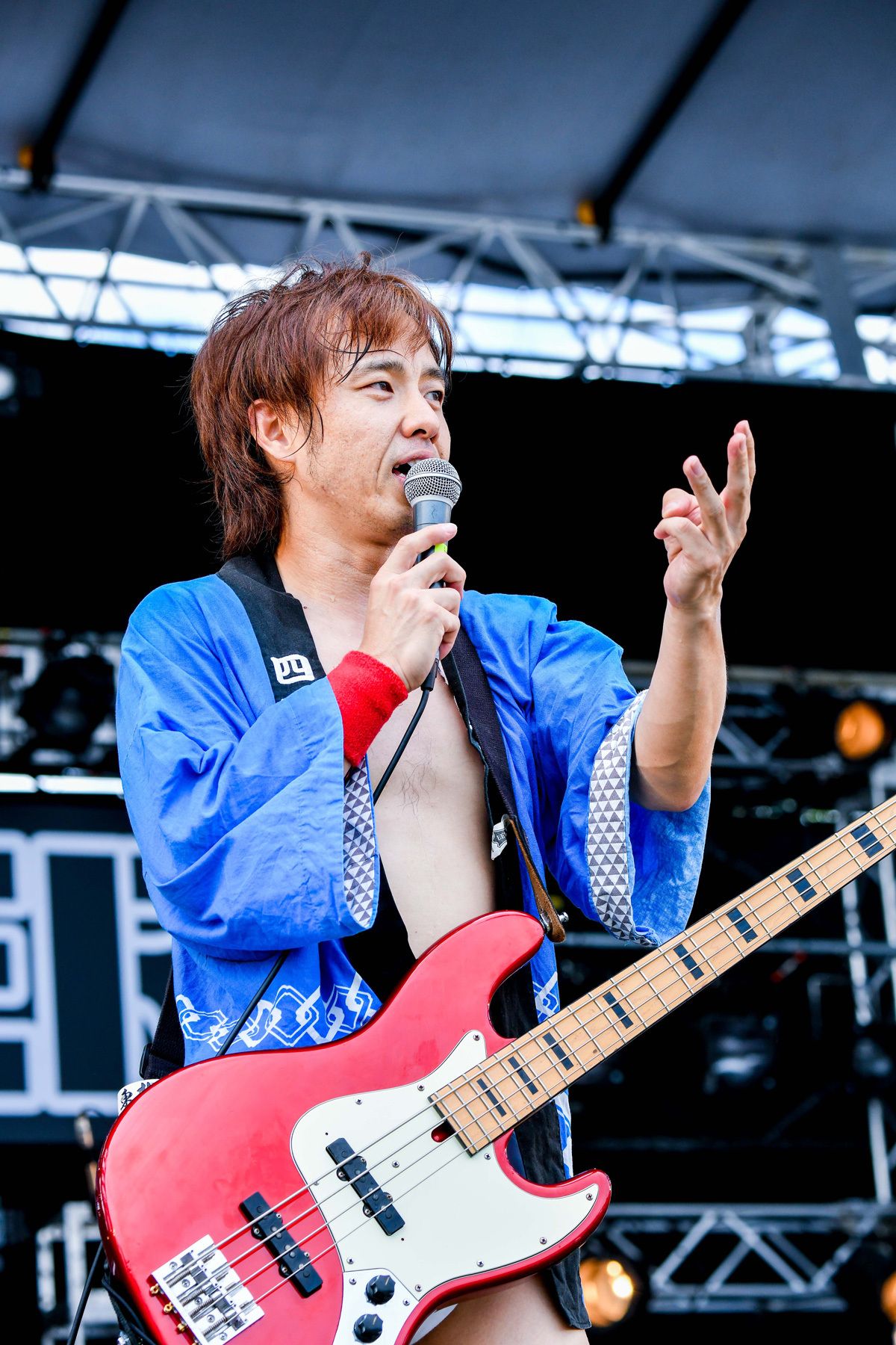 14時45分にSTAGE龍神に登場した打首獄門同好会は、全員お遍路さん姿で、まさにそのお遍路さんがテーマの「88」(2009年の作品)が1曲目。大澤会長、出て来るなりイヤモニがトラブってきこえなくなったり、「筋肉マイフレンド」をやる前にオーディエンスと共にスクワットを行ったりするたびに、「いやあ、ありがたいなあ、ありがたいなあ」とくり返す。中盤から後半では、「時間がない時はどうすればいいか、とある四国のバンドが我々に教えてくれました」と、四星球の「時間がない時の××」シリーズに倣って、「鬼の副長HIZIKATA feat.ぼく、獄門くん」「きのこたけのこ戦争」「島国DNA」を1コーラスずつ披露、大拍手を浴びた。