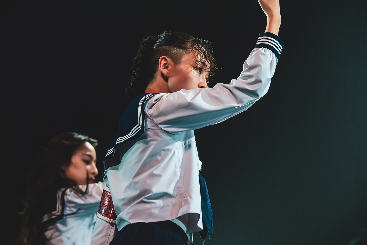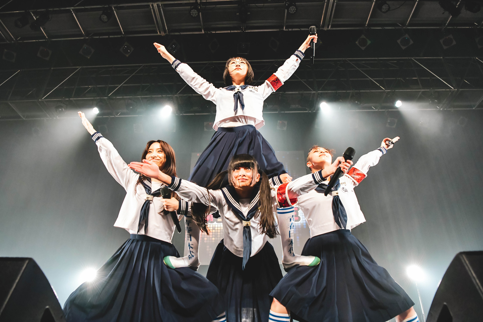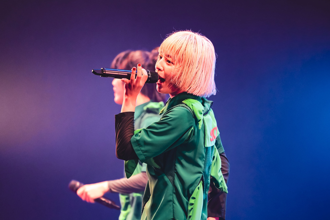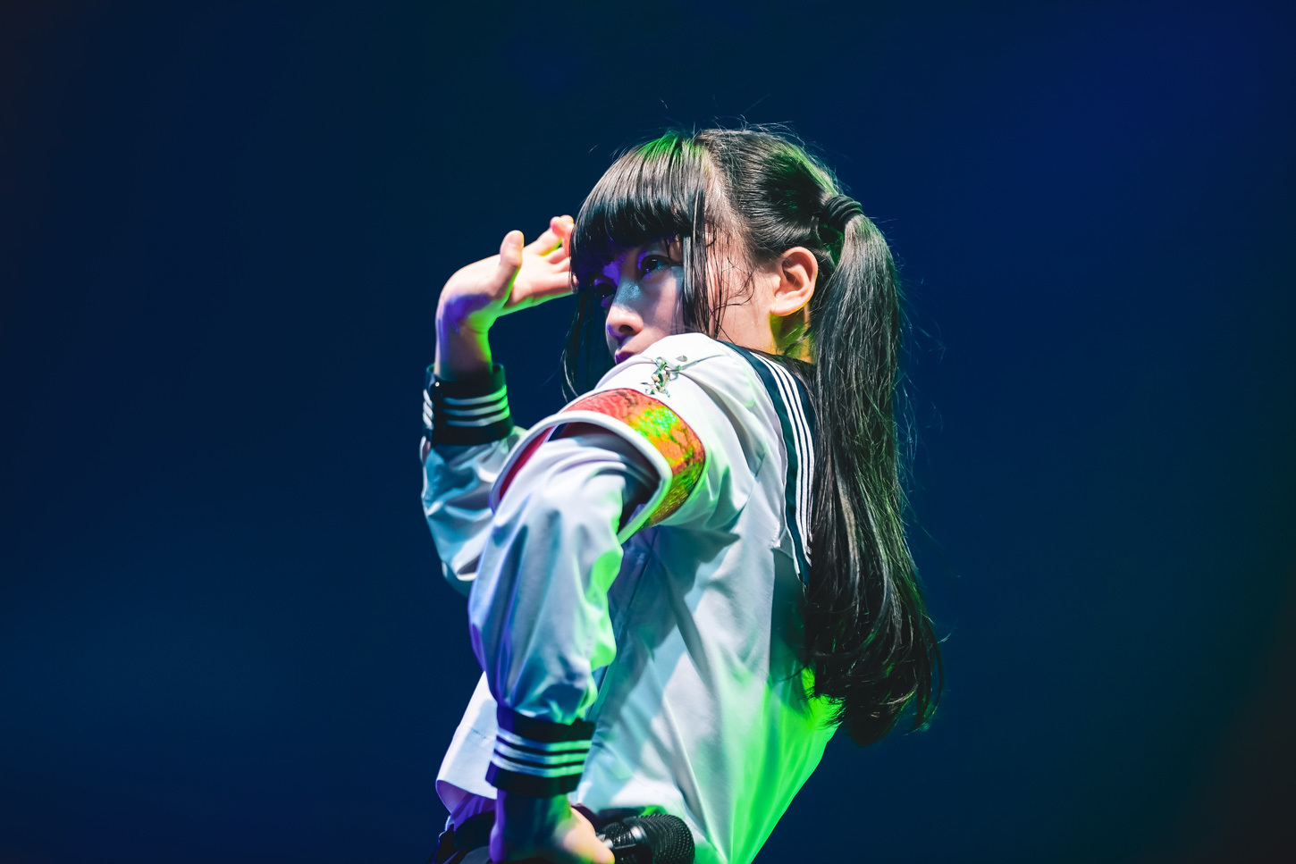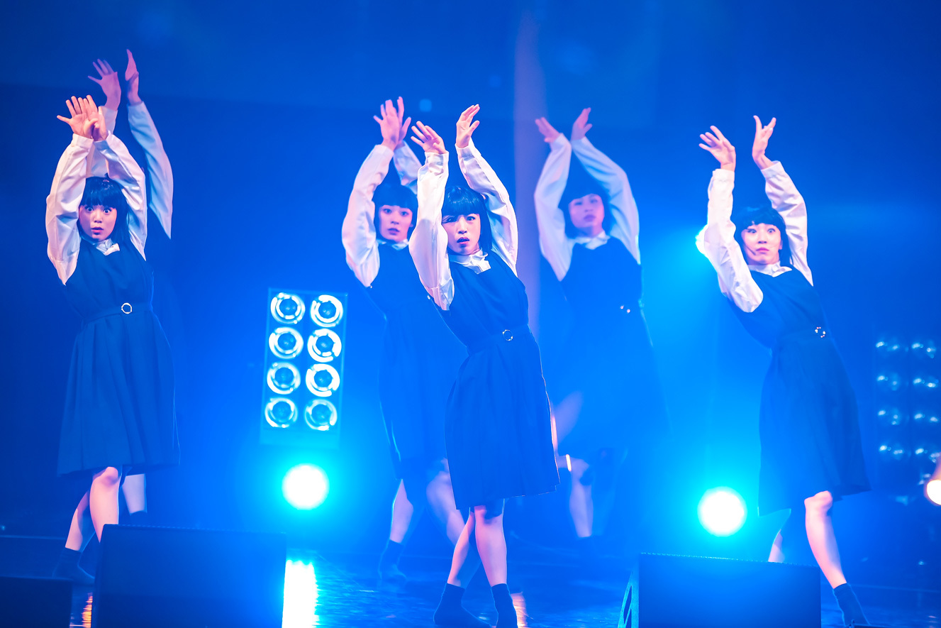 1曲目「最終人類」でも、SUZUKAが肩車から3人に倒れこむようになるなど、アクロバティックな動きをみせて観客を沸かせた。さらに「先生、告白したら犯罪ですか」の語りかけから始まる「恋ゲバ」、手首を曲げて膝を外向きにして折り曲げながら前後に動く特徴的なダンスがクセになる「オトナブルー」などで、会場を一気に新しい学校のリーダーズの世界観で染めあげた。MCではMIZYUから「なんてったってSUZUKAは?」と振られ、SUZUKAは「大阪出身やで、おま! 大きい声で言わせてください。たー、だい、ま!」とリズムにのって地元凱旋を報告。
