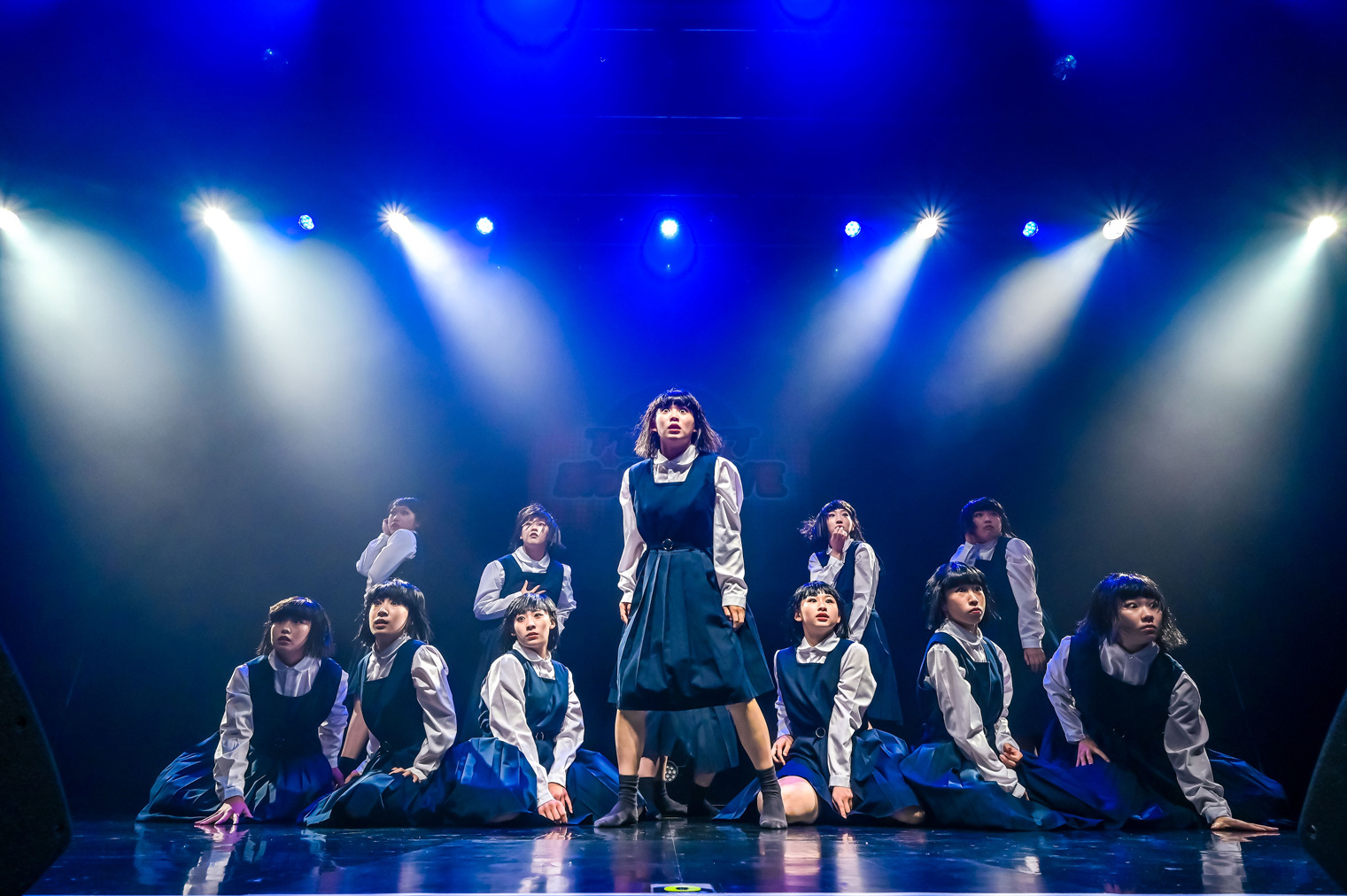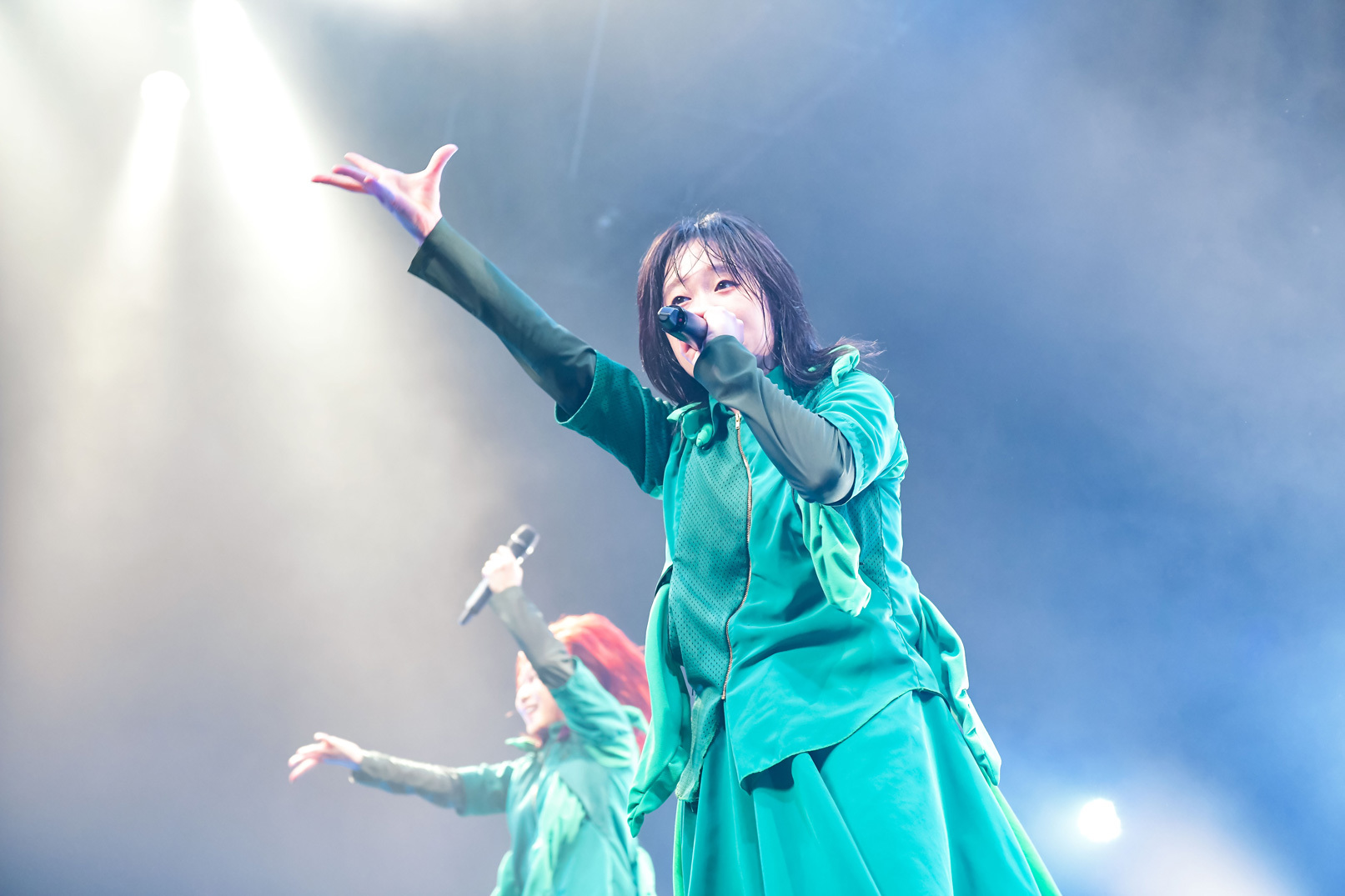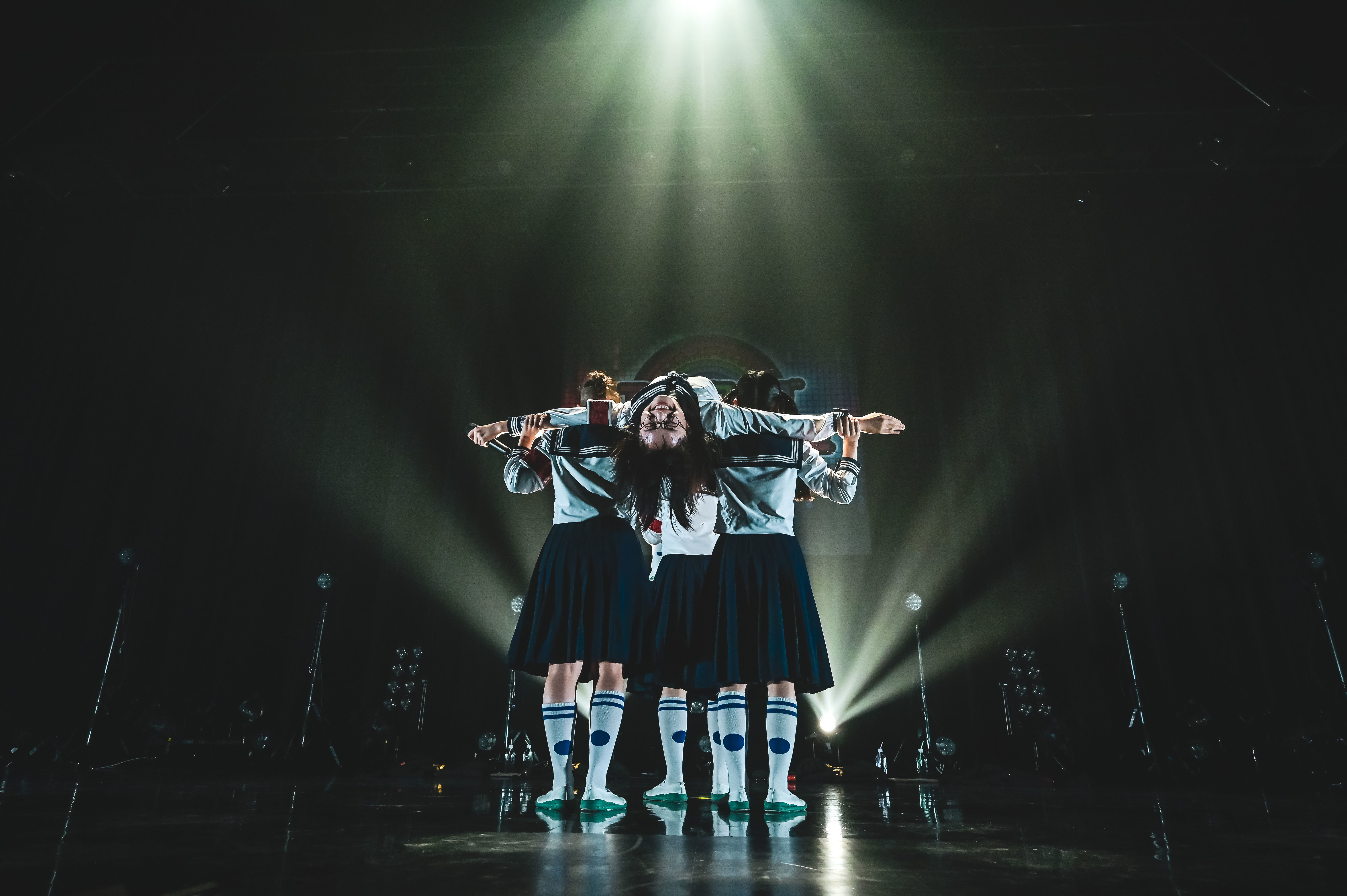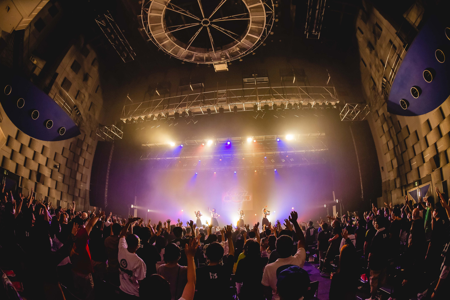 1曲目「最終人類」でも、SUZUKAが肩車から3人に倒れこむようになるなど、アクロバティックな動きをみせて観客を沸かせた。さらに「先生、告白したら犯罪ですか」の語りかけから始まる「恋ゲバ」、手首を曲げて膝を外向きにして折り曲げながら前後に動く特徴的なダンスがクセになる「オトナブルー」などで、会場を一気に新しい学校のリーダーズの世界観で染めあげた。MCではMIZYUから「なんてったってSUZUKAは?」と振られ、SUZUKAは「大阪出身やで、おま! 大きい声で言わせてください。たー、だい、ま!」とリズムにのって地元凱旋を報告。