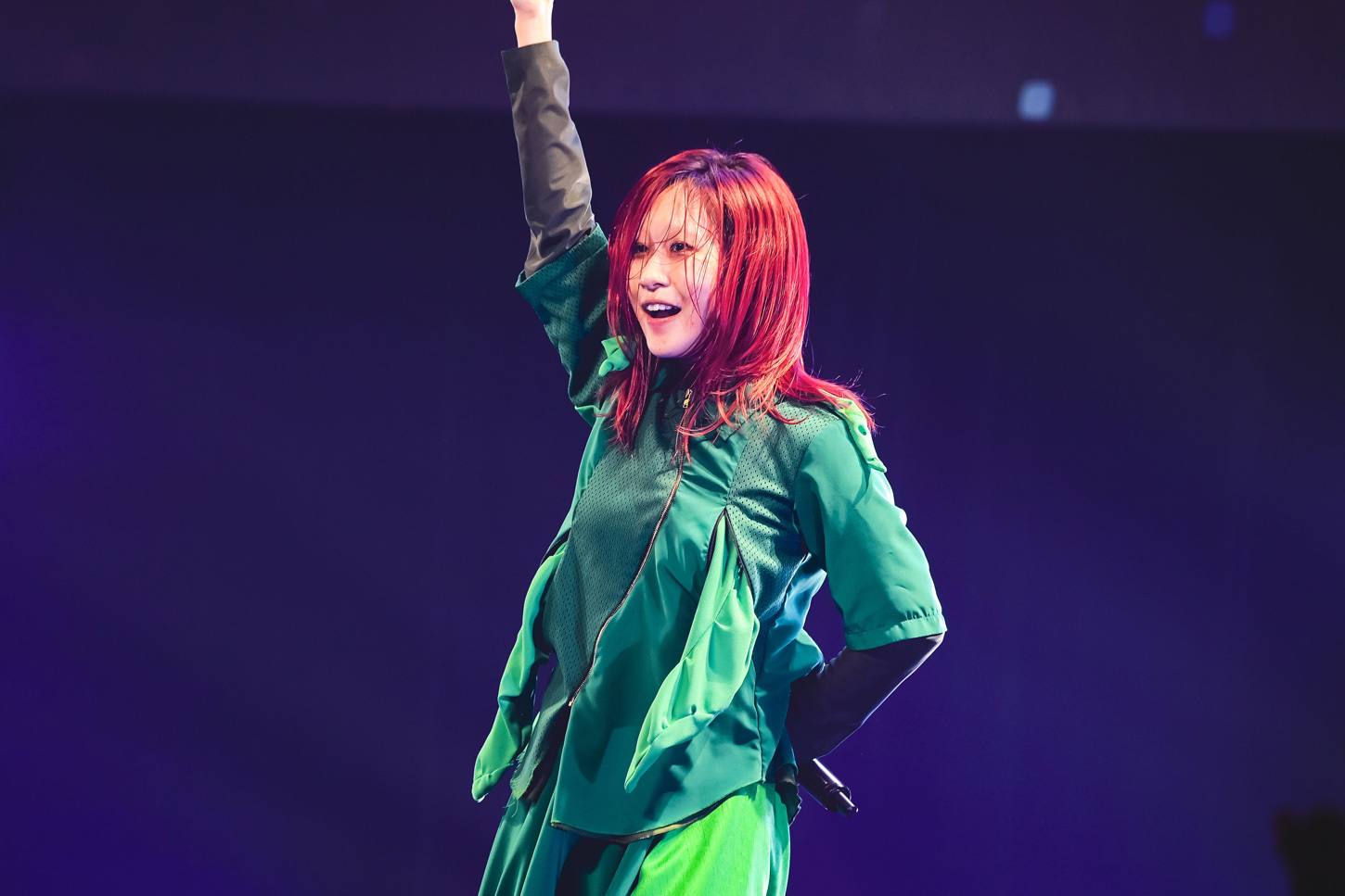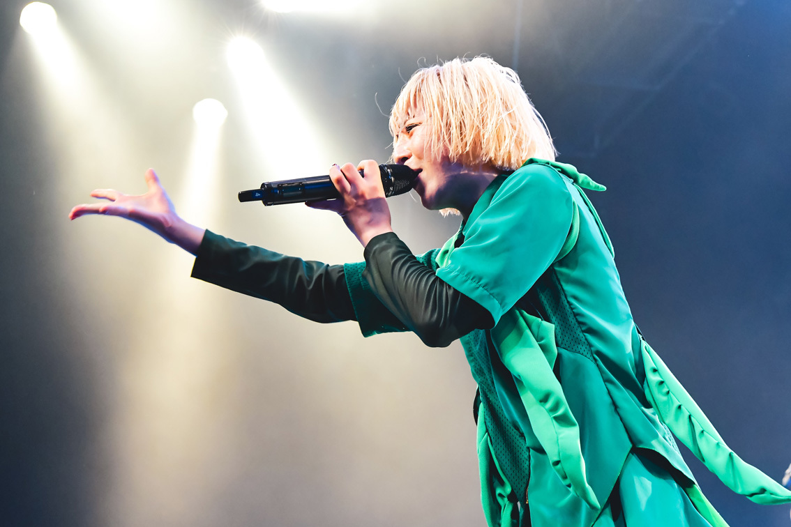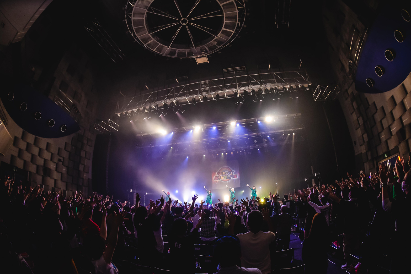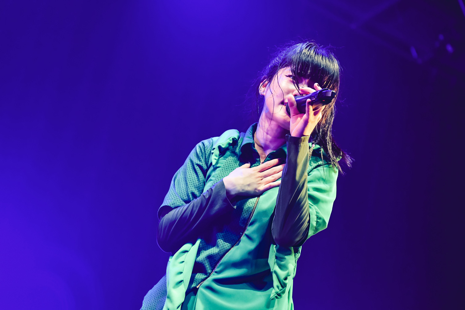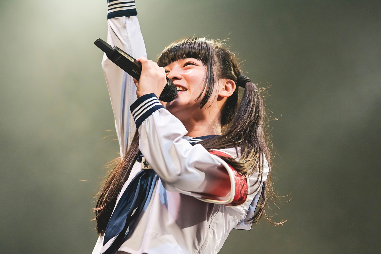 1曲目「最終人類」でも、SUZUKAが肩車から3人に倒れこむようになるなど、アクロバティックな動きをみせて観客を沸かせた。さらに「先生、告白したら犯罪ですか」の語りかけから始まる「恋ゲバ」、手首を曲げて膝を外向きにして折り曲げながら前後に動く特徴的なダンスがクセになる「オトナブルー」などで、会場を一気に新しい学校のリーダーズの世界観で染めあげた。MCではMIZYUから「なんてったってSUZUKAは?」と振られ、SUZUKAは「大阪出身やで、おま! 大きい声で言わせてください。たー、だい、ま!」とリズムにのって地元凱旋を報告。