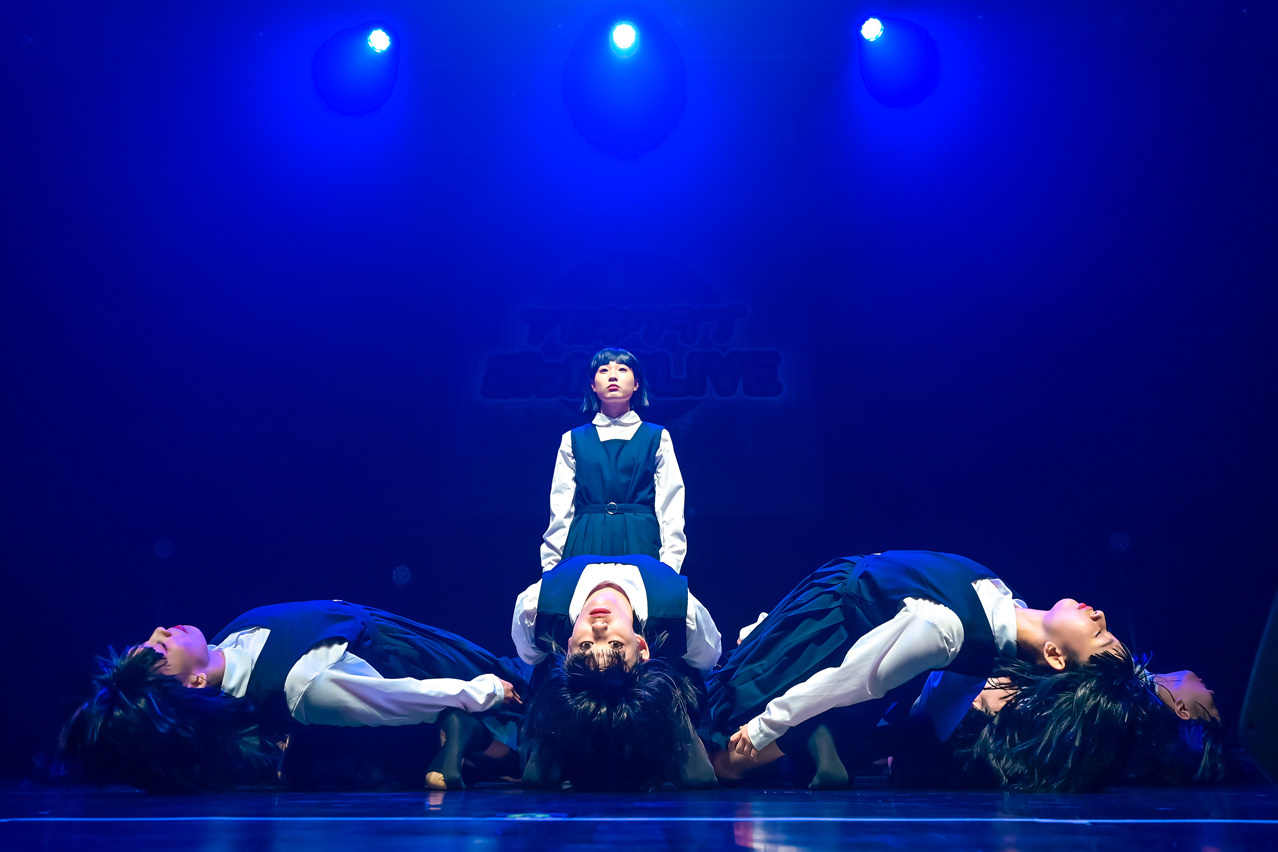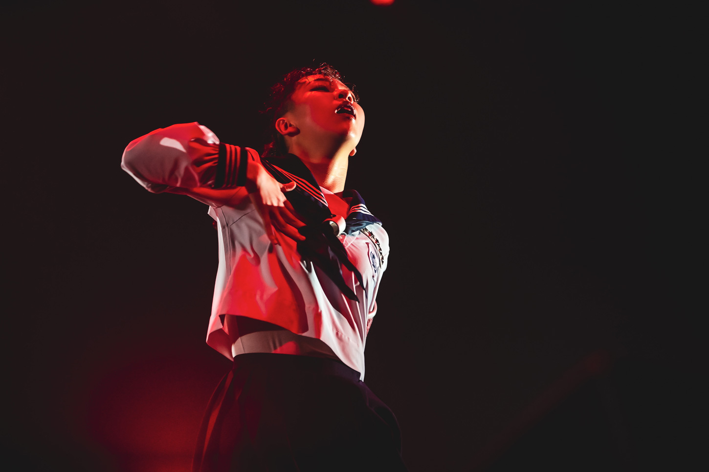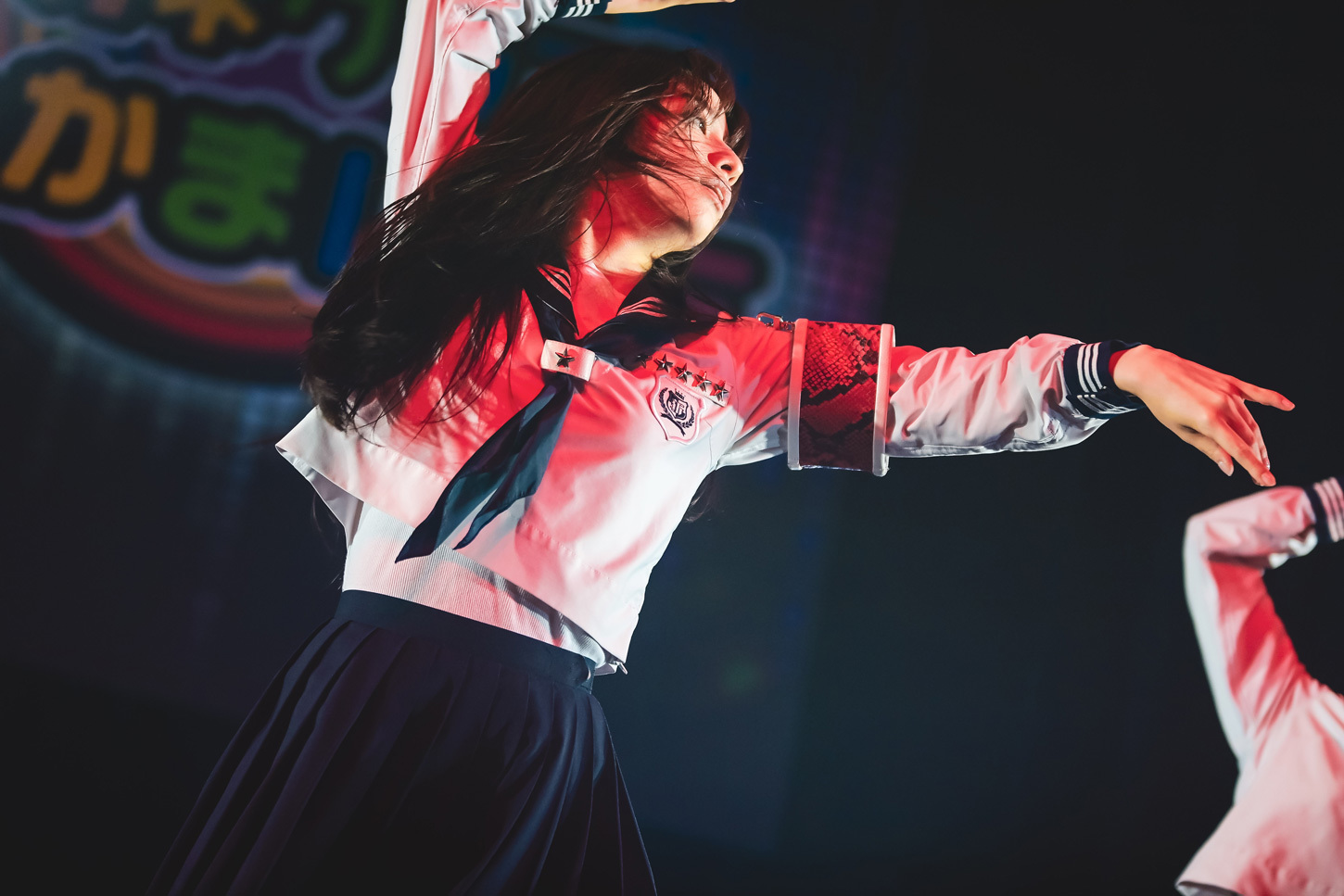 その後も、MIZYUによる頭頂を土台とした逆立ちやメンバー同士が殴り合っているように見える振付などがある「Pineapple Kryptonight Spesial Mix(original〜Remix)」ほか、中毒性たっぷりのサウンドとメンバー考案のダンスが展開。途中、学ラン姿に衣装チェンジし、SUZUKAは「かっこいいだろう? ワイルドだろう?」と人気芸人のフレーズを口にして笑わせる、お茶目な一面も。