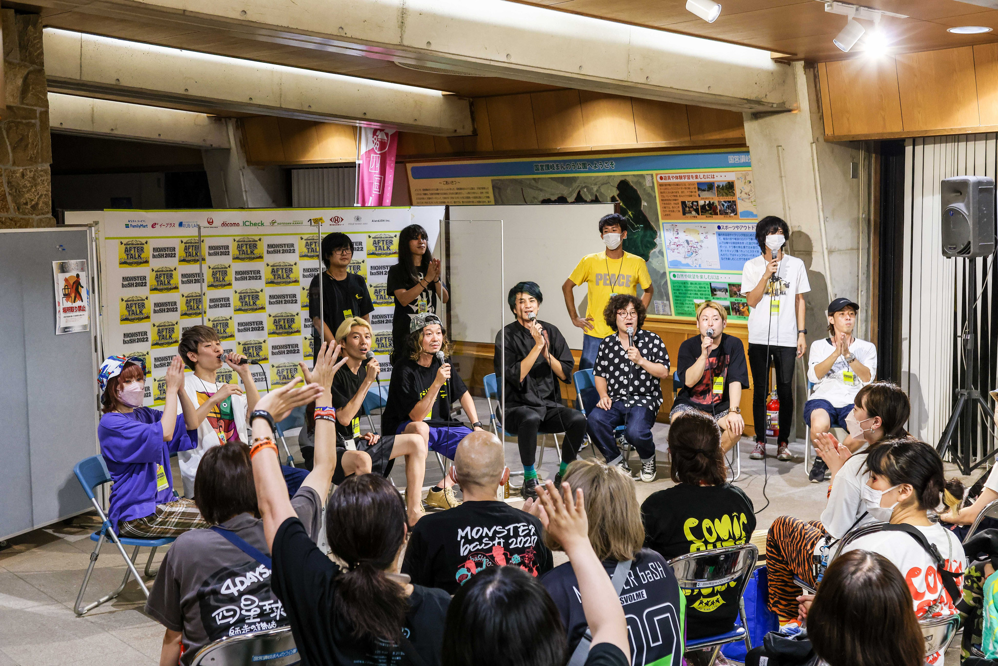 初日もこの日も、終演後に、エントランス広場のVIPエリアを使って、トークイベントが行われた。初日のホストは四星球。この2日目のホストはLONGMAN、ゲストはBLUE ENCOUNTの田邊駿一、四星球、古墳シスターズだった。