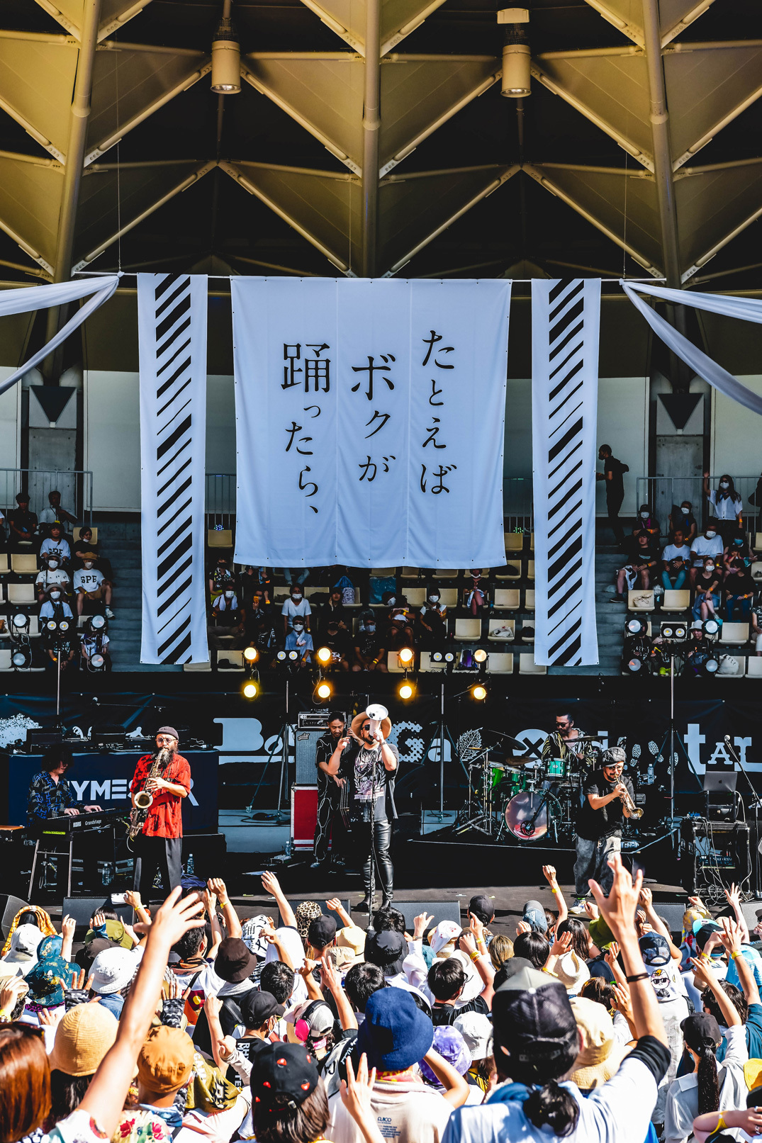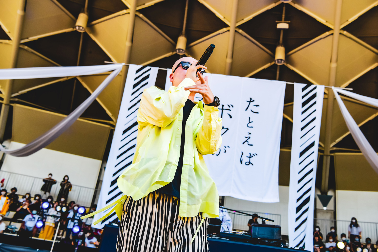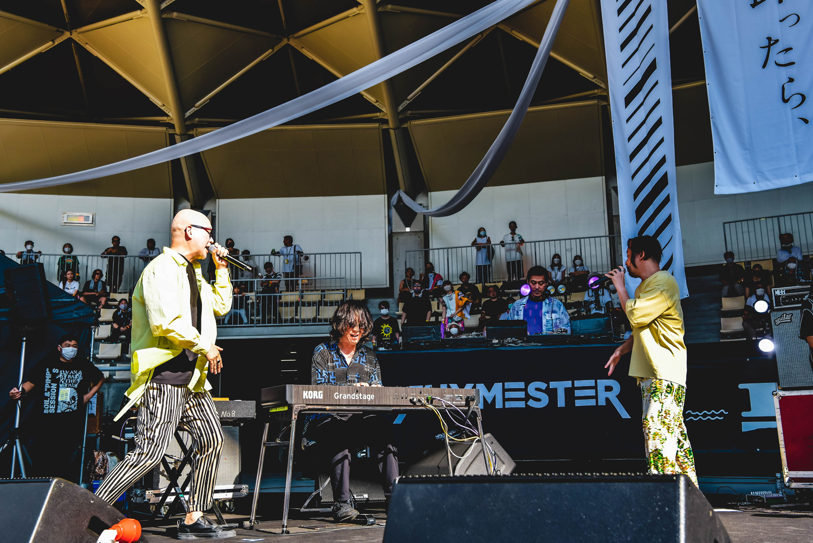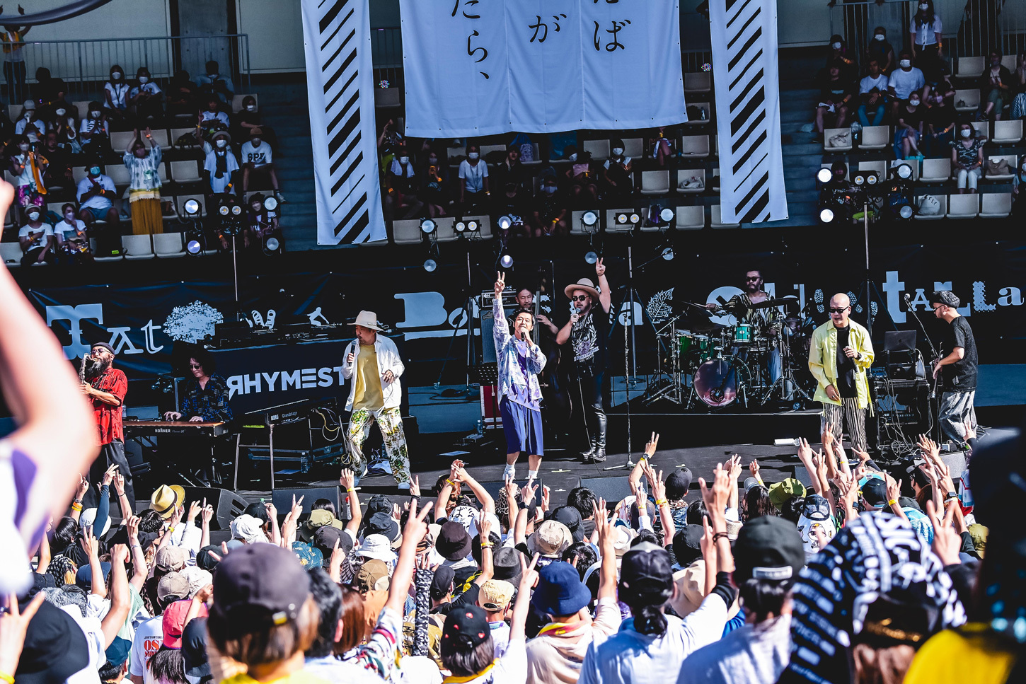 そして、もうひとつの魅力がここでしか見られないセッション。まずは、RHYMESTERが野外音楽堂のステージに登場。宇多丸が「みんな、いろんなことあってここに集まっていると思います。この状況がまだまだ続くかもしれないけれど、いつでも何度でも人は立ち上がれるという歌から」という言葉から「ONCE AGAIN」を投下。さらに、「メンツみただけでわかってんなこのフェスってね。大阪の代表格だよね」と評しつつ、DJとマイク2本で会場をこれでもかと沸かせ、「KING OF STAGE」の異名にふさわしい圧巻のステージをみせつけた。