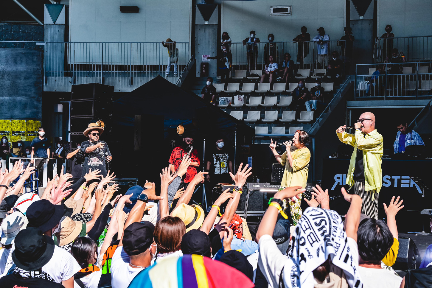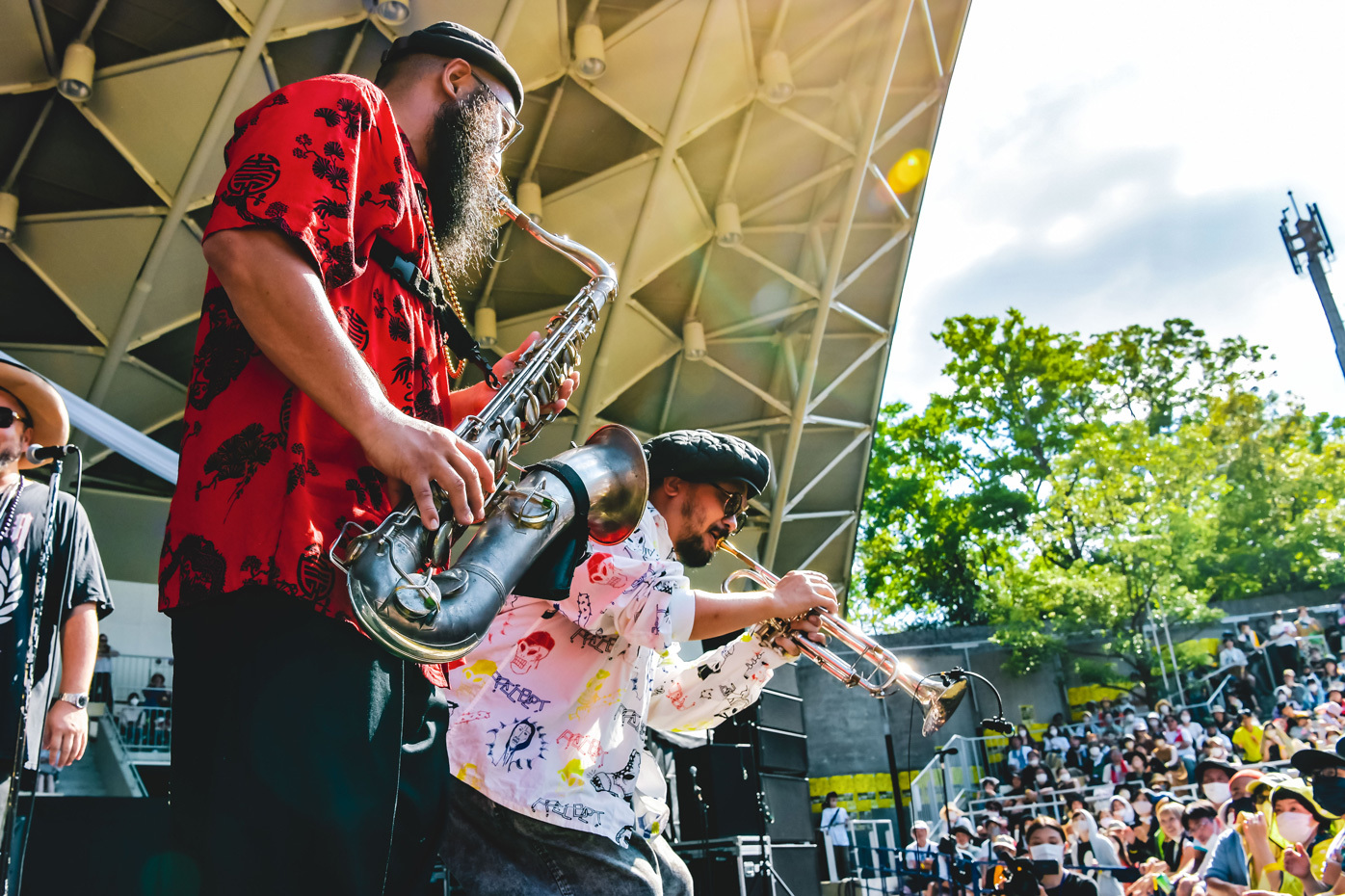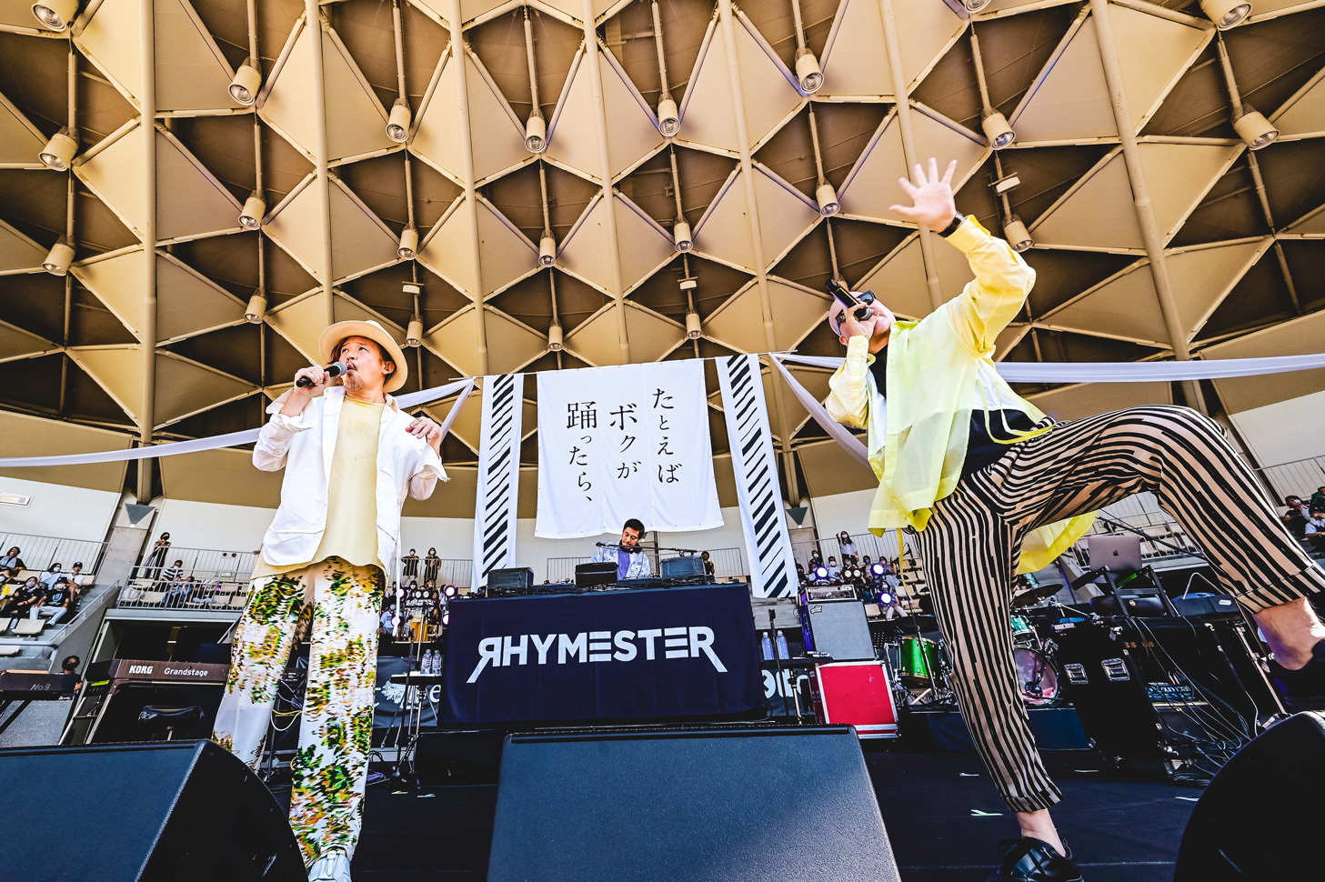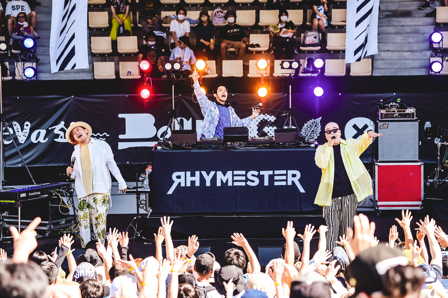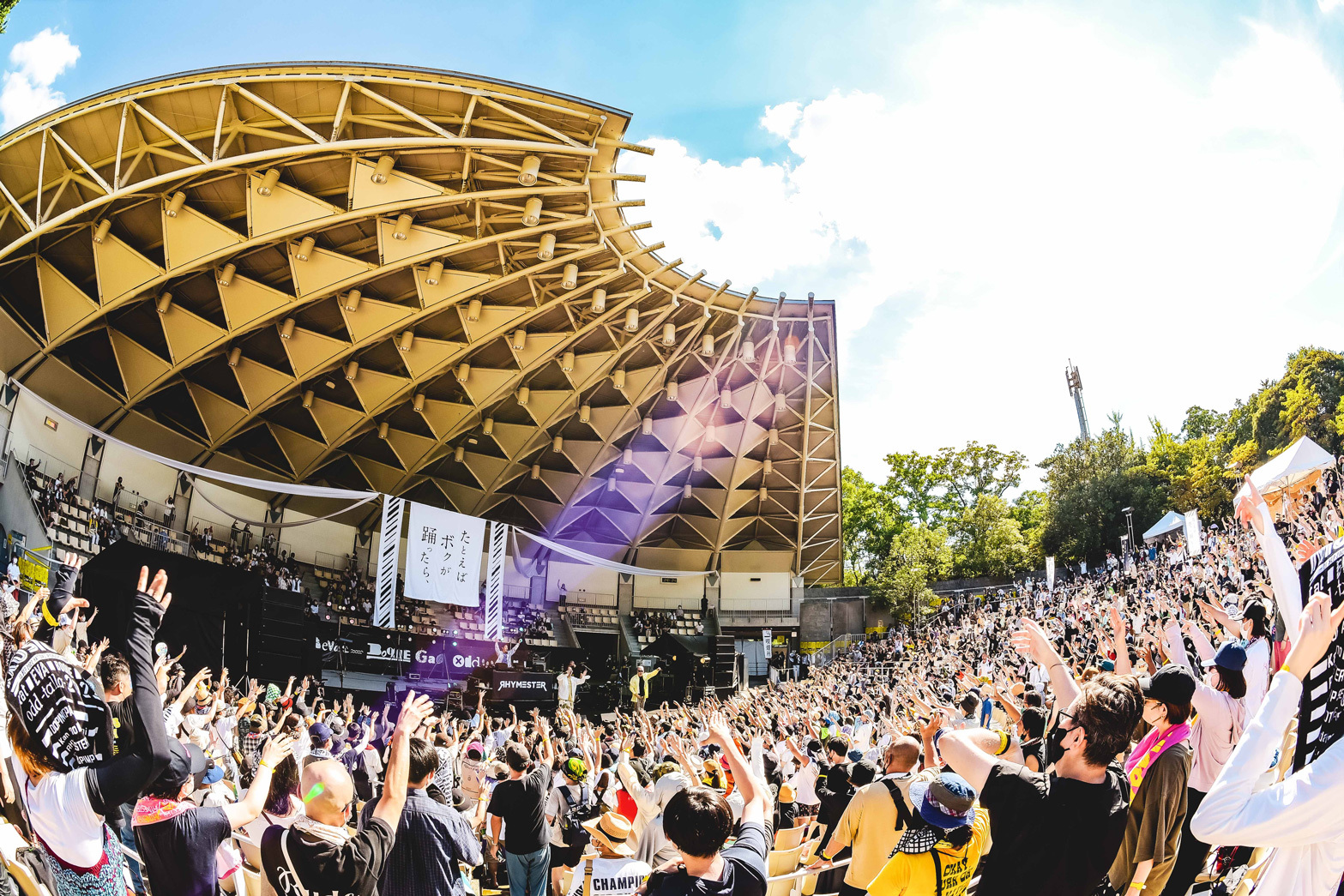 そして、もうひとつの魅力がここでしか見られないセッション。まずは、RHYMESTERが野外音楽堂のステージに登場。宇多丸が「みんな、いろんなことあってここに集まっていると思います。この状況がまだまだ続くかもしれないけれど、いつでも何度でも人は立ち上がれるという歌から」という言葉から「ONCE AGAIN」を投下。さらに、「メンツみただけでわかってんなこのフェスってね。大阪の代表格だよね」と評しつつ、DJとマイク2本で会場をこれでもかと沸かせ、「KING OF STAGE」の異名にふさわしい圧巻のステージをみせつけた。