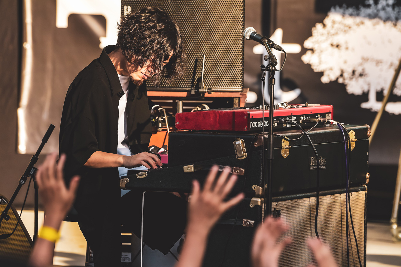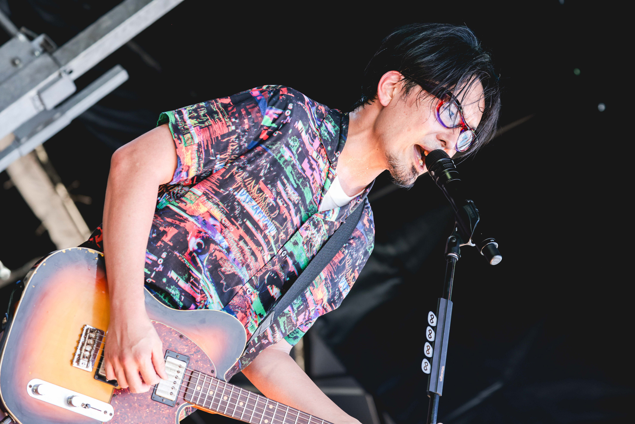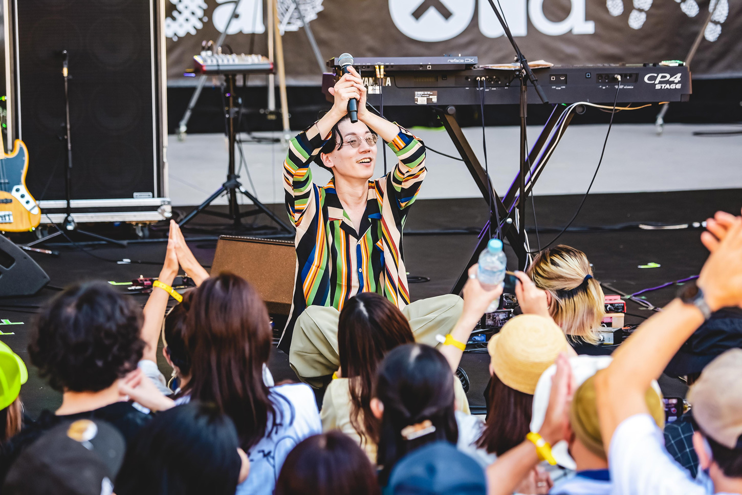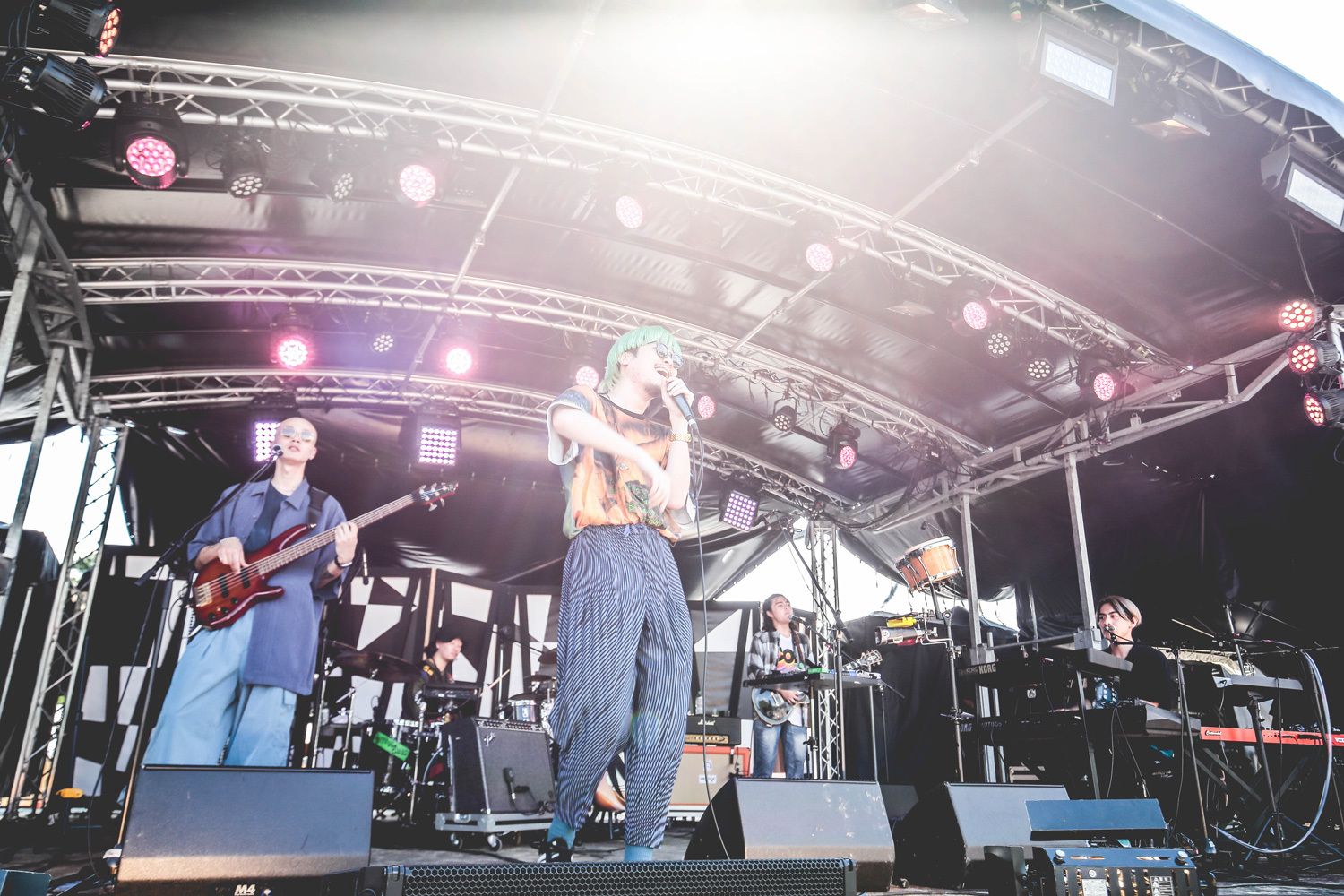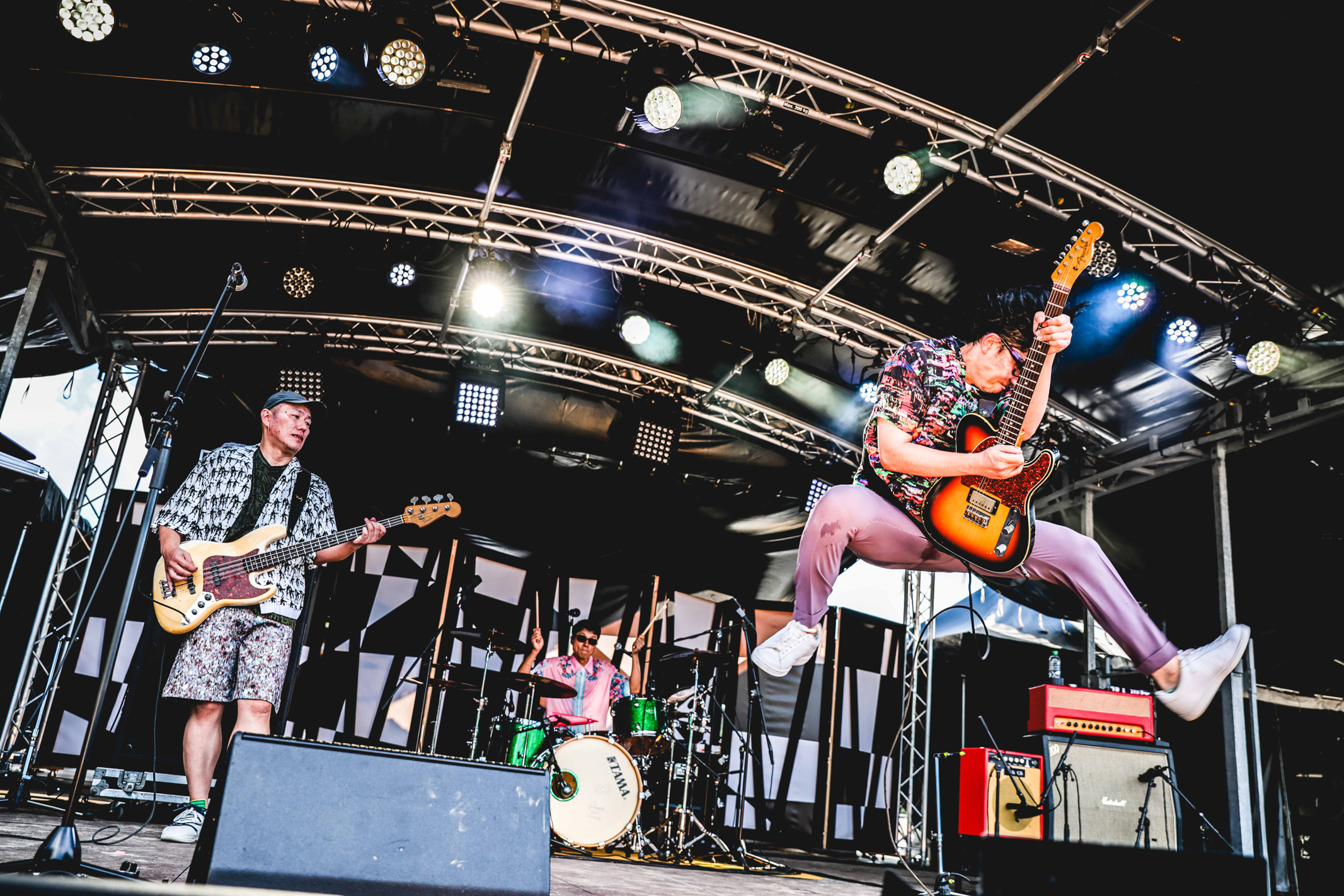 特設ステージでは、Kroiがファンキーにぶっとい音をぶちかまして踊らせる。内田怜央(Gt.Vo)は「外でこんなに美味しいもの食べて、最高に踊って気持ちよくかえってください。こんな天気に会う曲を」と投げかけ「熱海」で会場の熱気はぐんぐん上昇。今度は「あとラスト4曲……ラスト4曲って言うことなかなかないよね(笑)」と内田。