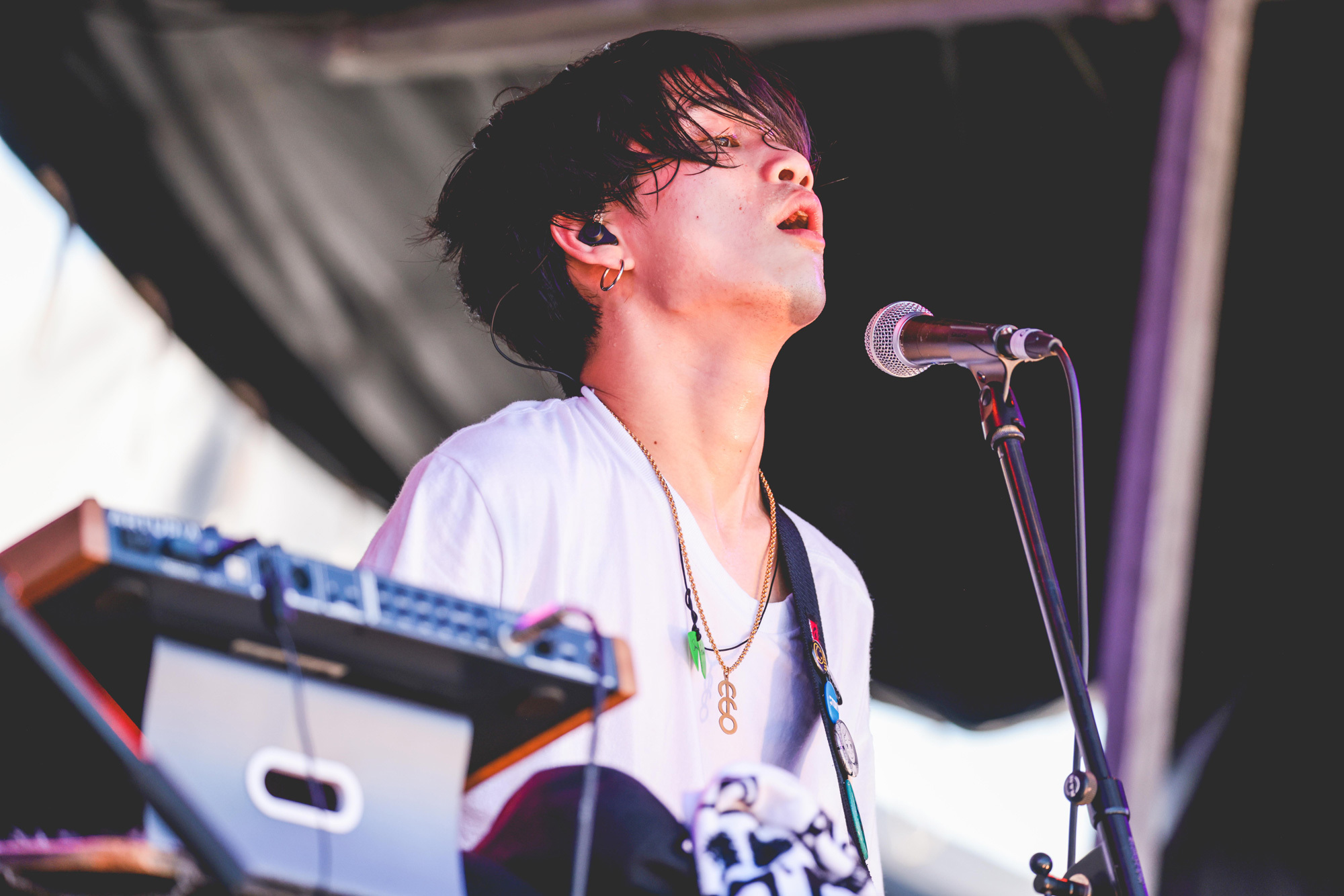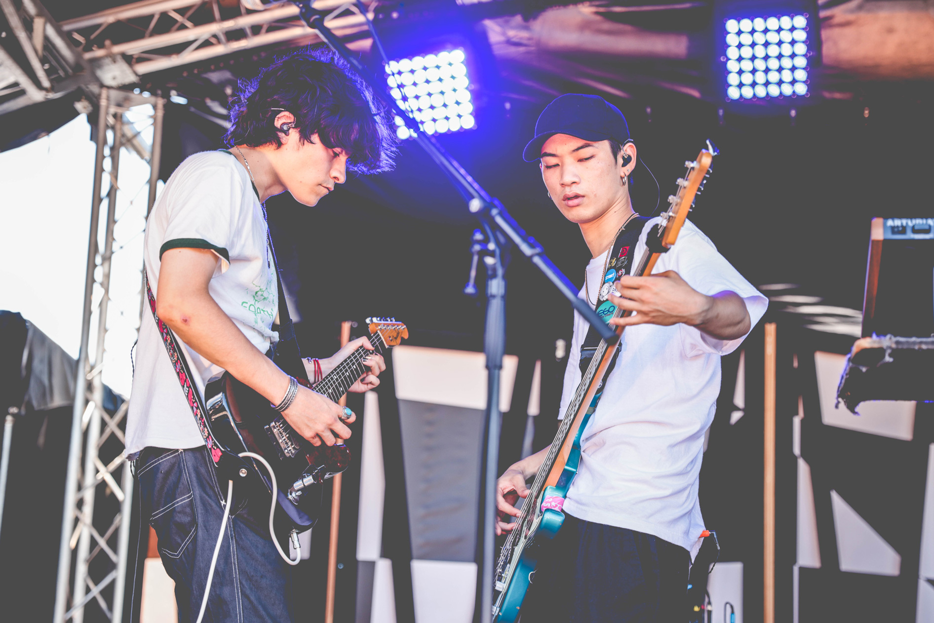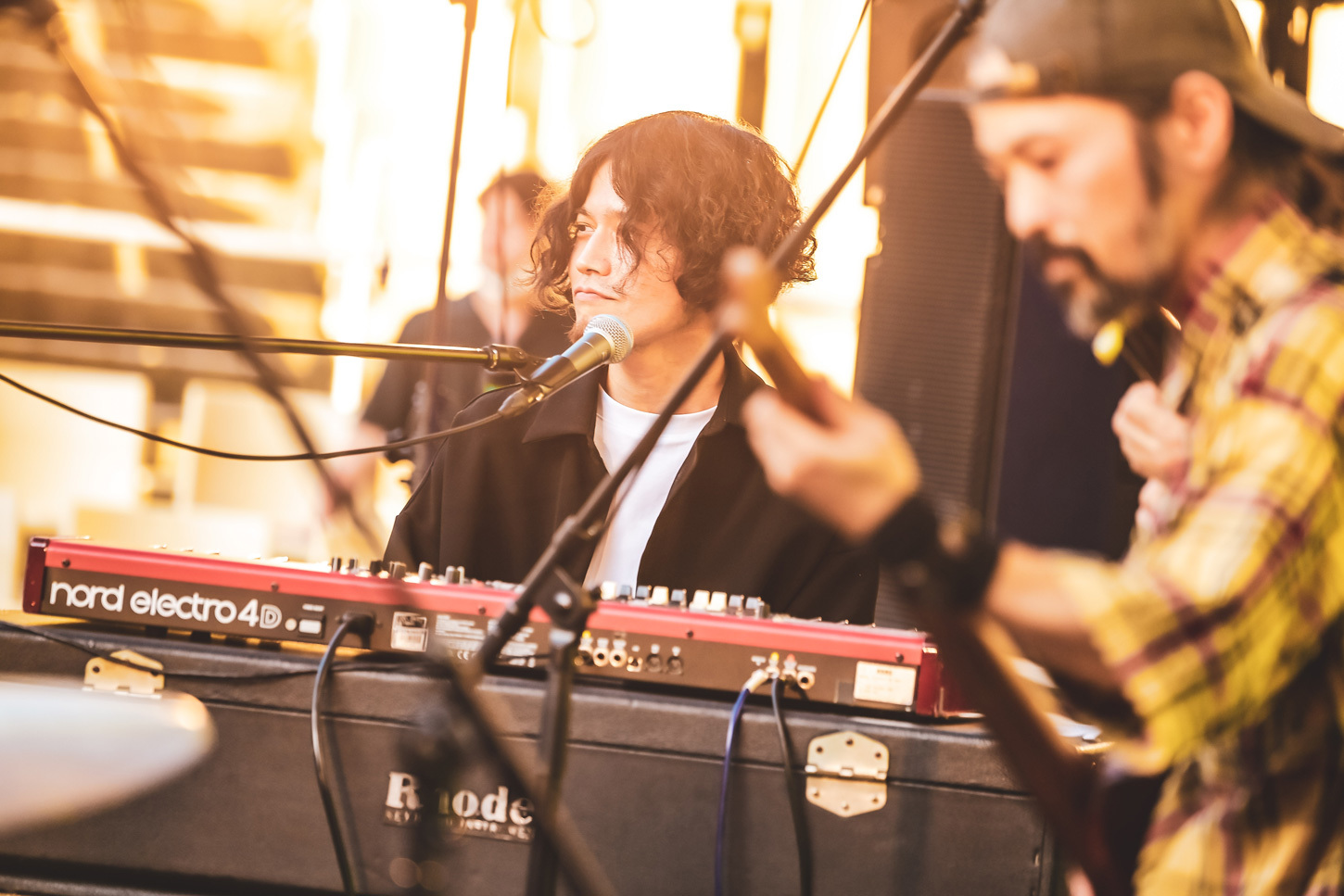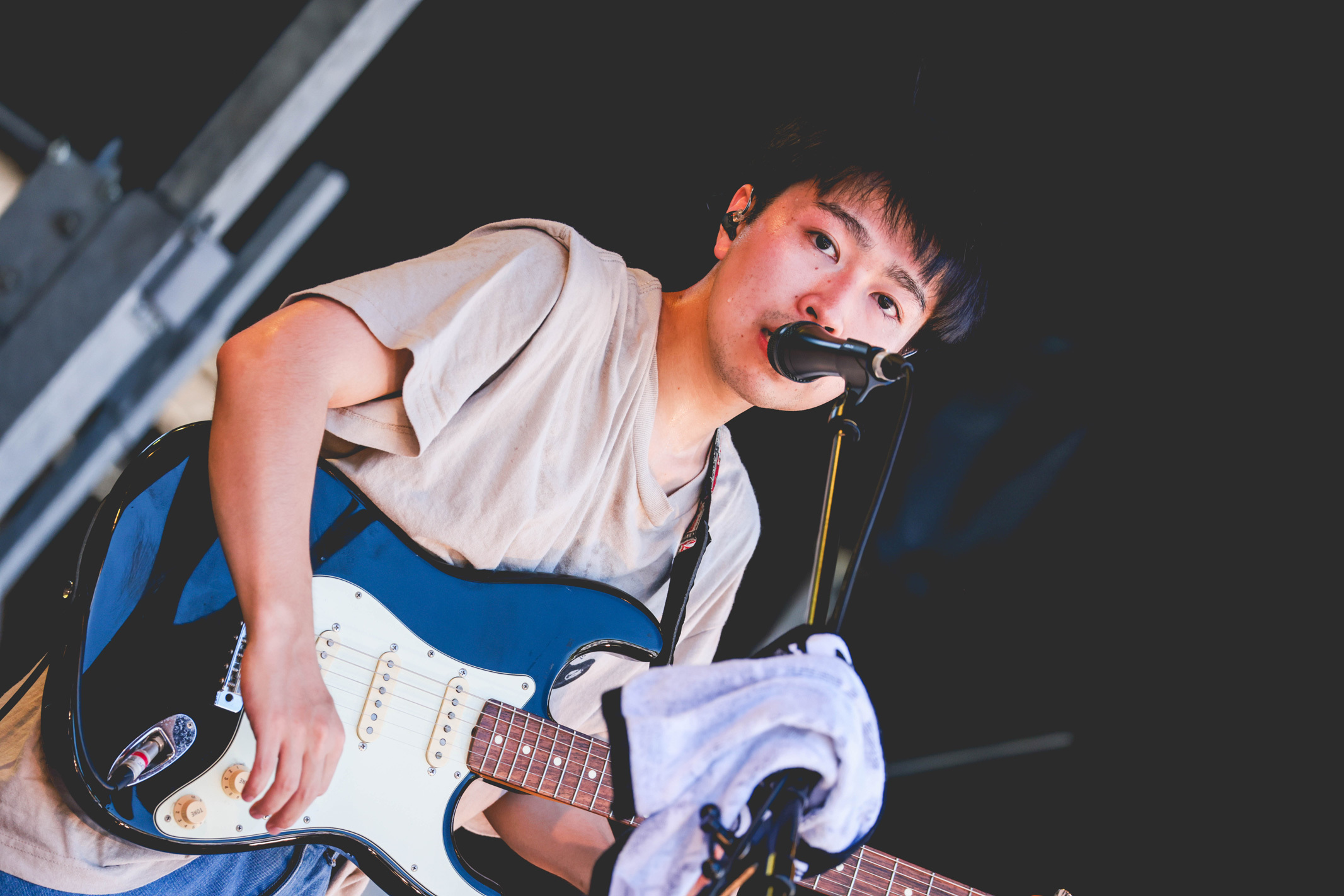 特設ステージでは、Kroiがファンキーにぶっとい音をぶちかまして踊らせる。内田怜央(Gt.Vo)は「外でこんなに美味しいもの食べて、最高に踊って気持ちよくかえってください。こんな天気に会う曲を」と投げかけ「熱海」で会場の熱気はぐんぐん上昇。今度は「あとラスト4曲……ラスト4曲って言うことなかなかないよね(笑)」と内田。