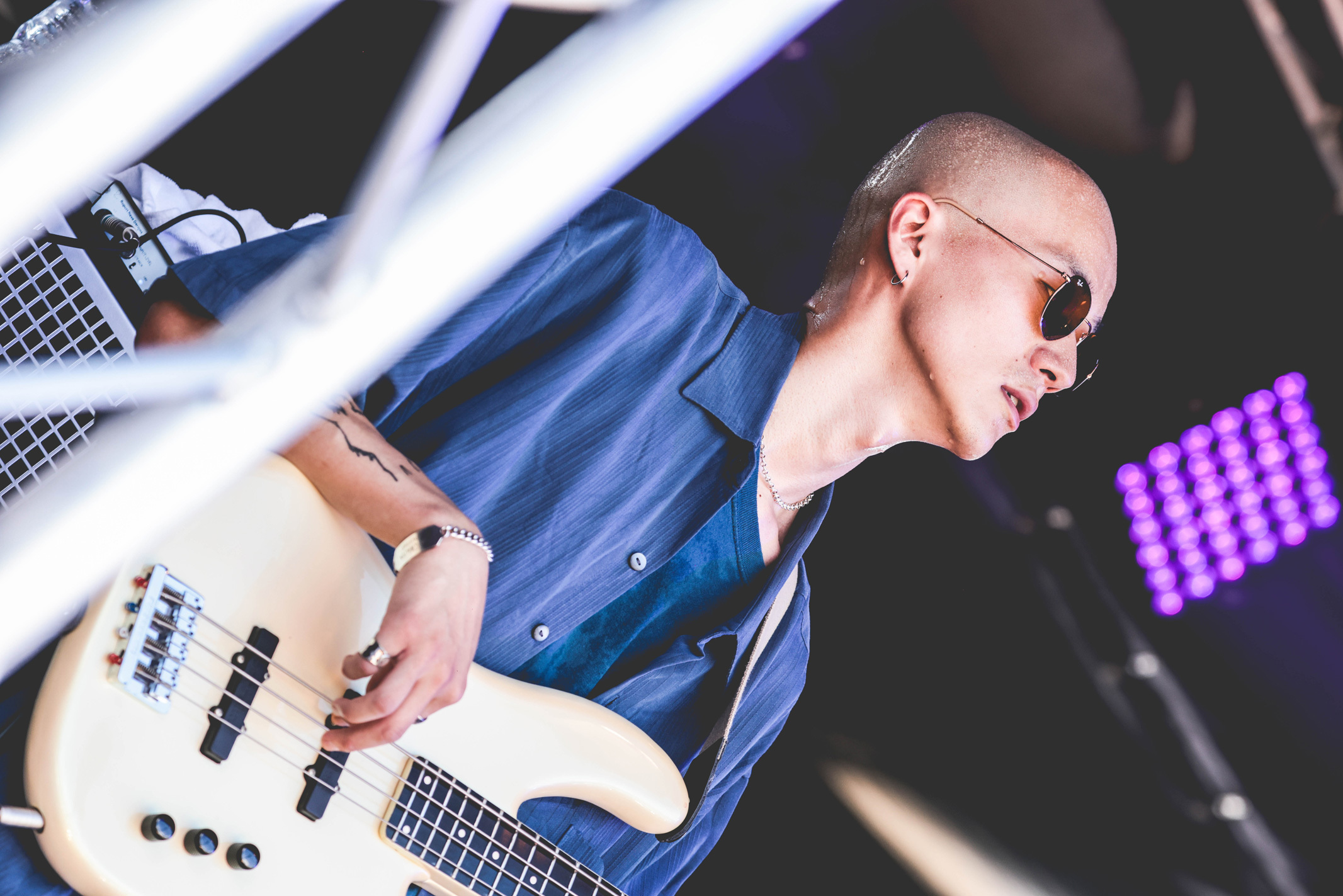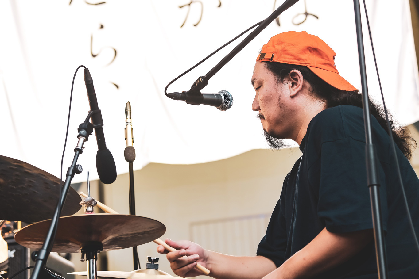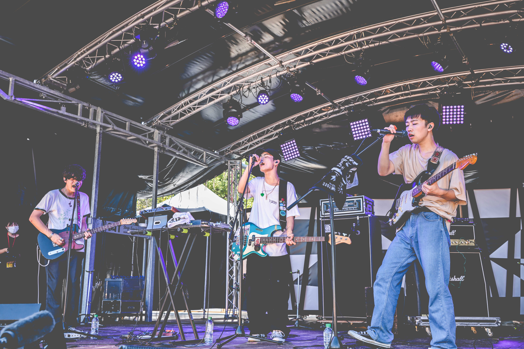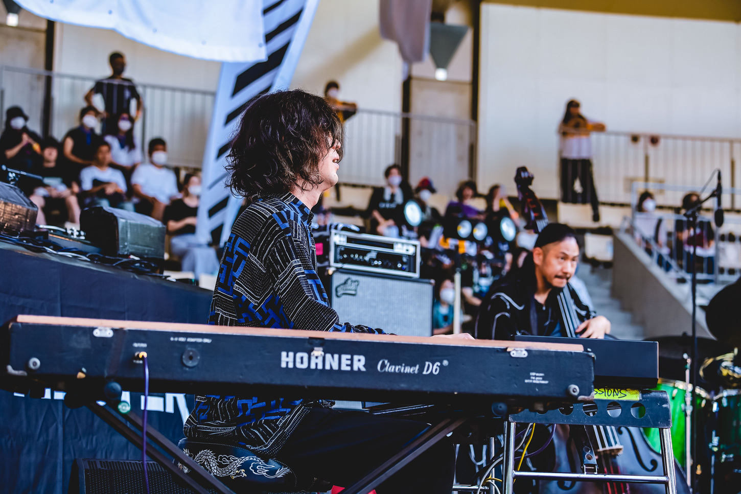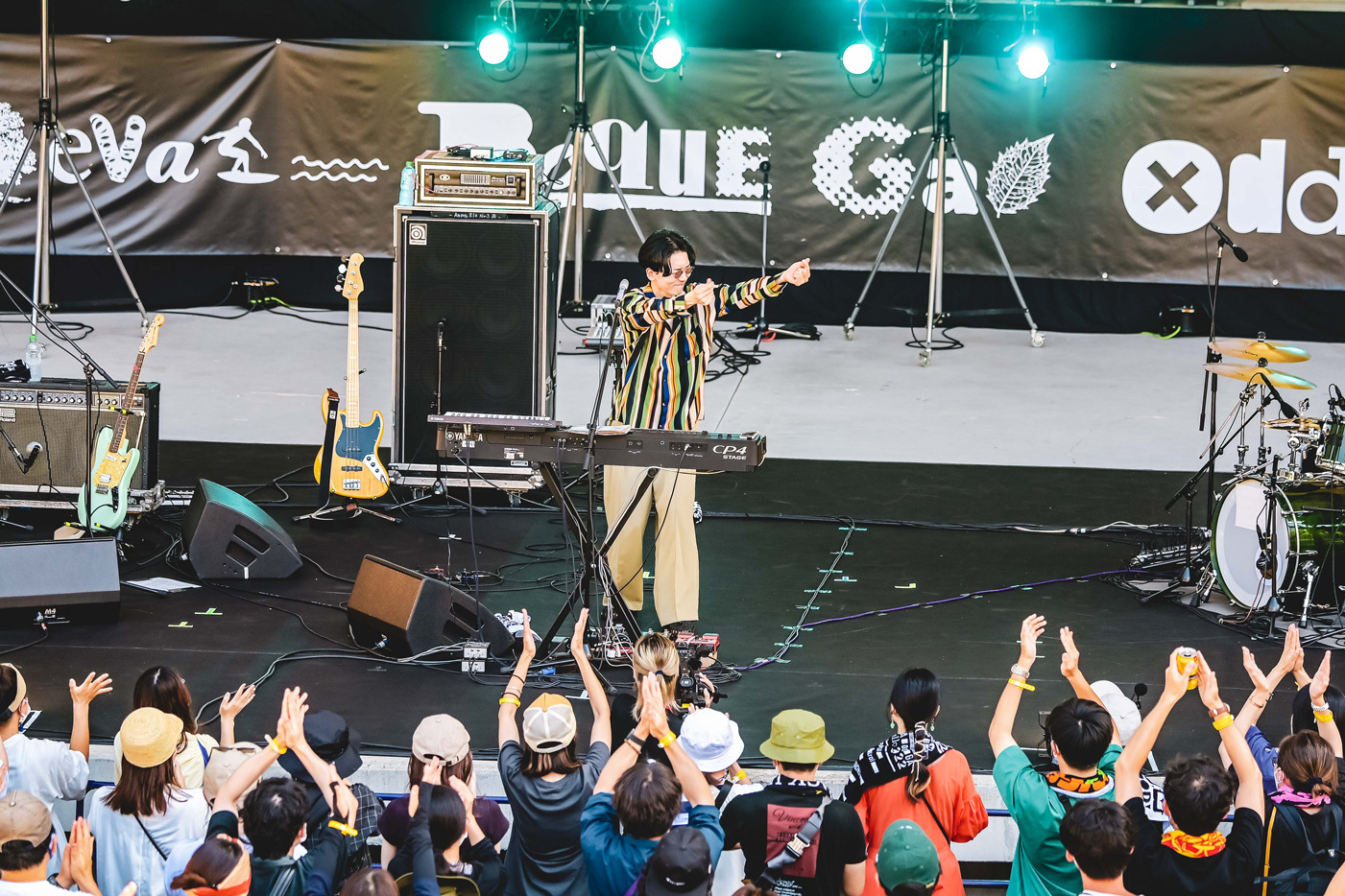 特設ステージでは、Kroiがファンキーにぶっとい音をぶちかまして踊らせる。内田怜央(Gt.Vo)は「外でこんなに美味しいもの食べて、最高に踊って気持ちよくかえってください。こんな天気に会う曲を」と投げかけ「熱海」で会場の熱気はぐんぐん上昇。今度は「あとラスト4曲……ラスト4曲って言うことなかなかないよね(笑)」と内田。