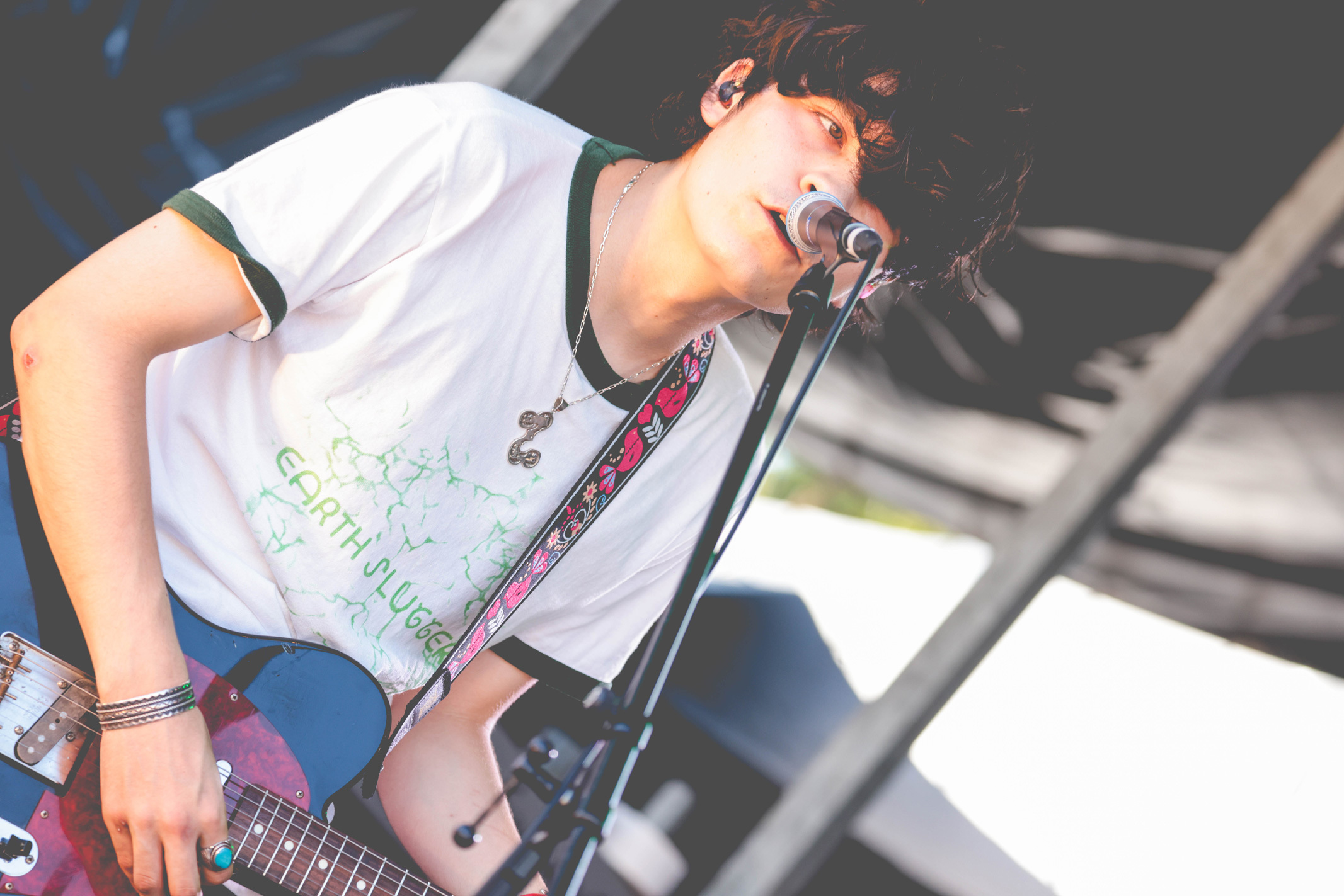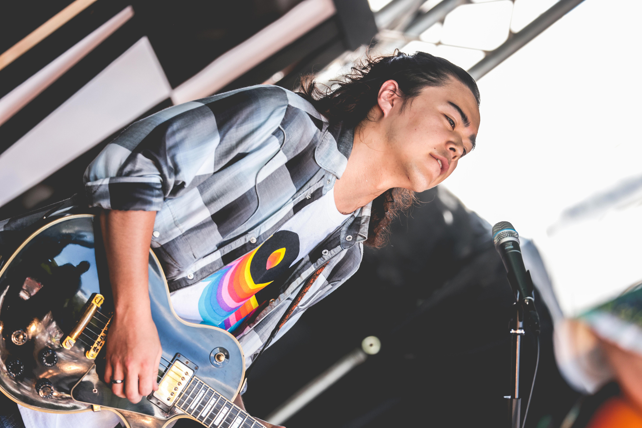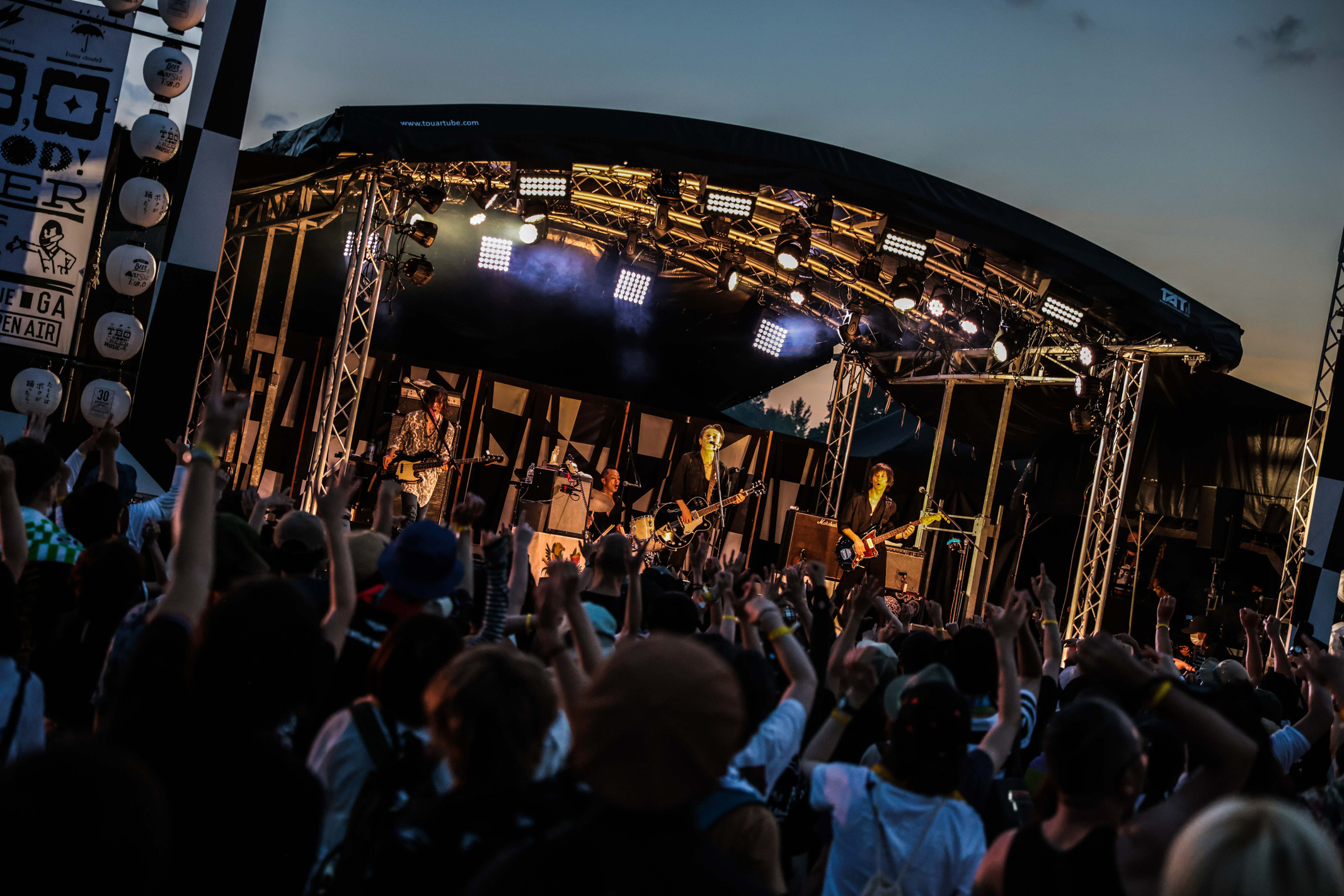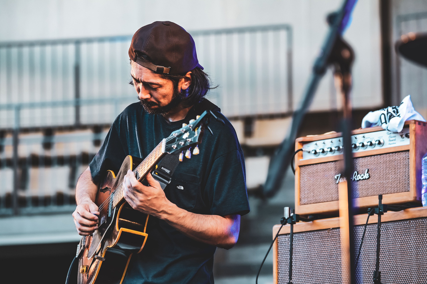 特設ステージでは、Kroiがファンキーにぶっとい音をぶちかまして踊らせる。内田怜央(Gt.Vo)は「外でこんなに美味しいもの食べて、最高に踊って気持ちよくかえってください。こんな天気に会う曲を」と投げかけ「熱海」で会場の熱気はぐんぐん上昇。今度は「あとラスト4曲……ラスト4曲って言うことなかなかないよね(笑)」と内田。