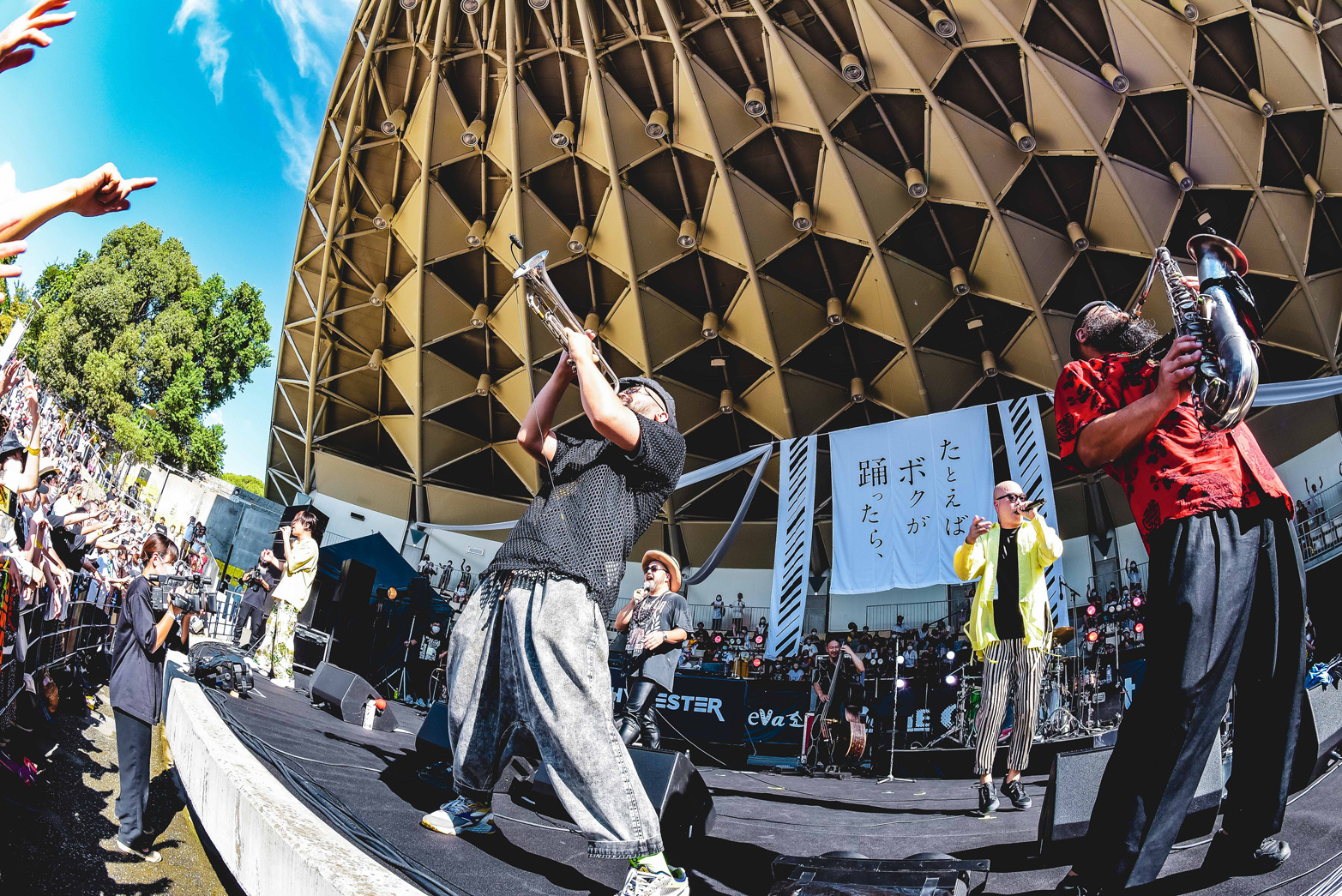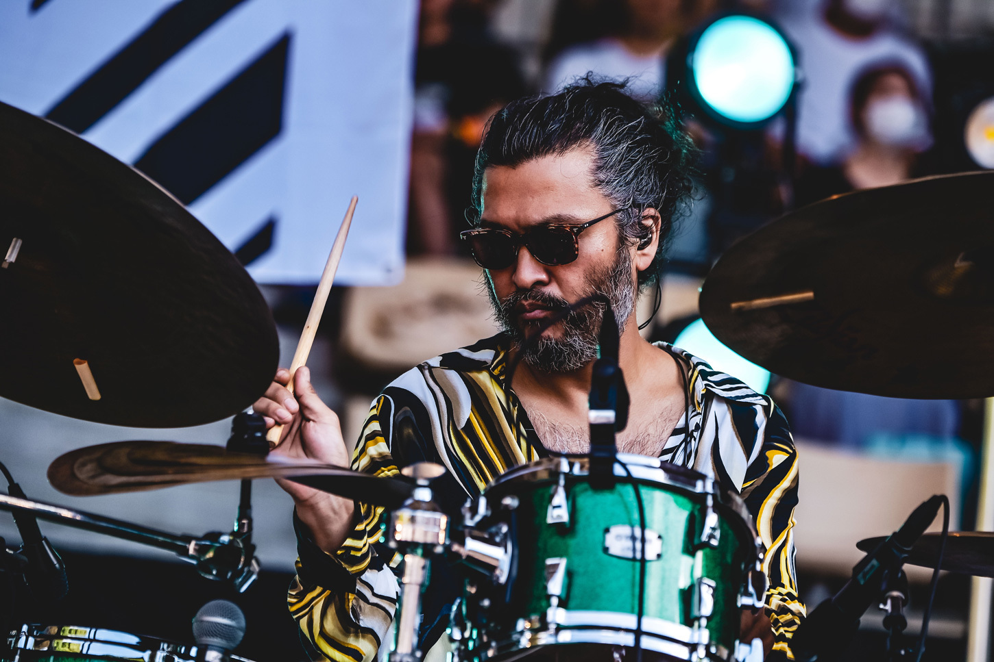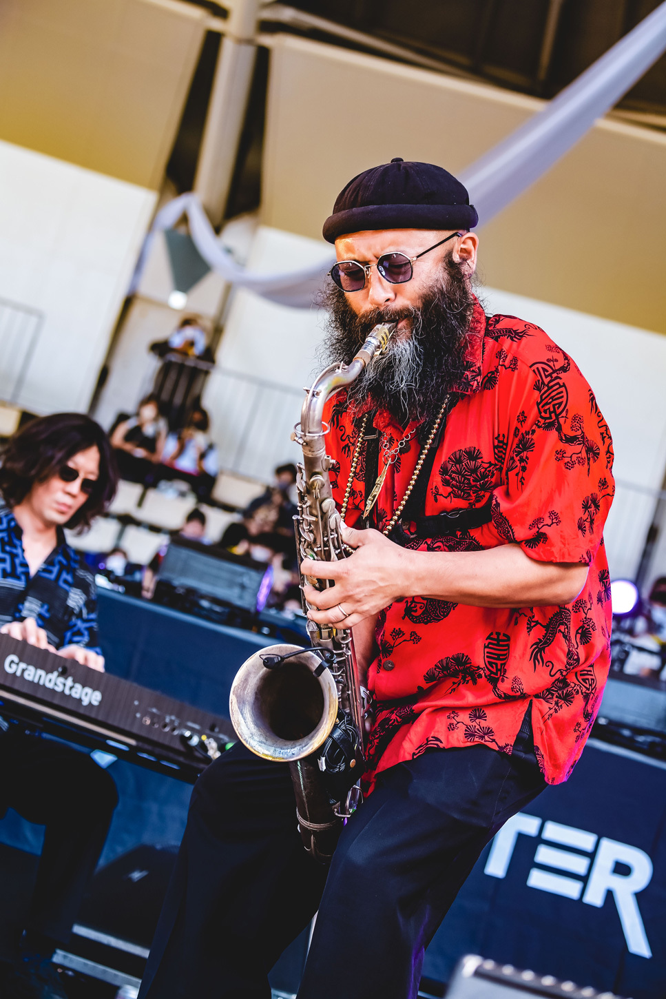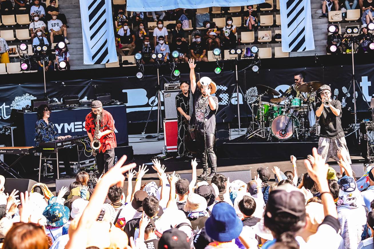 そして、続くSOIL&"PIMP"SESSION'S。社長(Agitator)が暑さから上着を脱ぎ捨てると「みんなも脱げるものは脱いでここに置いていこう!」と投げかけ、分厚いサウンドを放ちグルーヴを練り上げていく。タブゾンビ(Tp)、丈青(Pf)、秋田ゴールドマン(Ba)、みどりん(Dr)とそれぞれのスキルが際立つソロパートでこそ、会場が大いに湧きクラップが鳴り響く瞬間は痛快。シンプルに音を楽しみ、身を委ねる時間がとにかく心地いい。夏の曲をと「SUMMER GODDESS」で熱烈に締めくくり、「この組み合わせはまちがいない。何度となくこのステージでいろんな音を鳴らしてきたけど、今日もやるよ!」と呼び込まれてRHYMESTERが再登場。Mummy-Dも「楽しみで仕方なかったよ」と喜びをあらわに「Funky Pongi × 爆発的」でセッションスタート。
