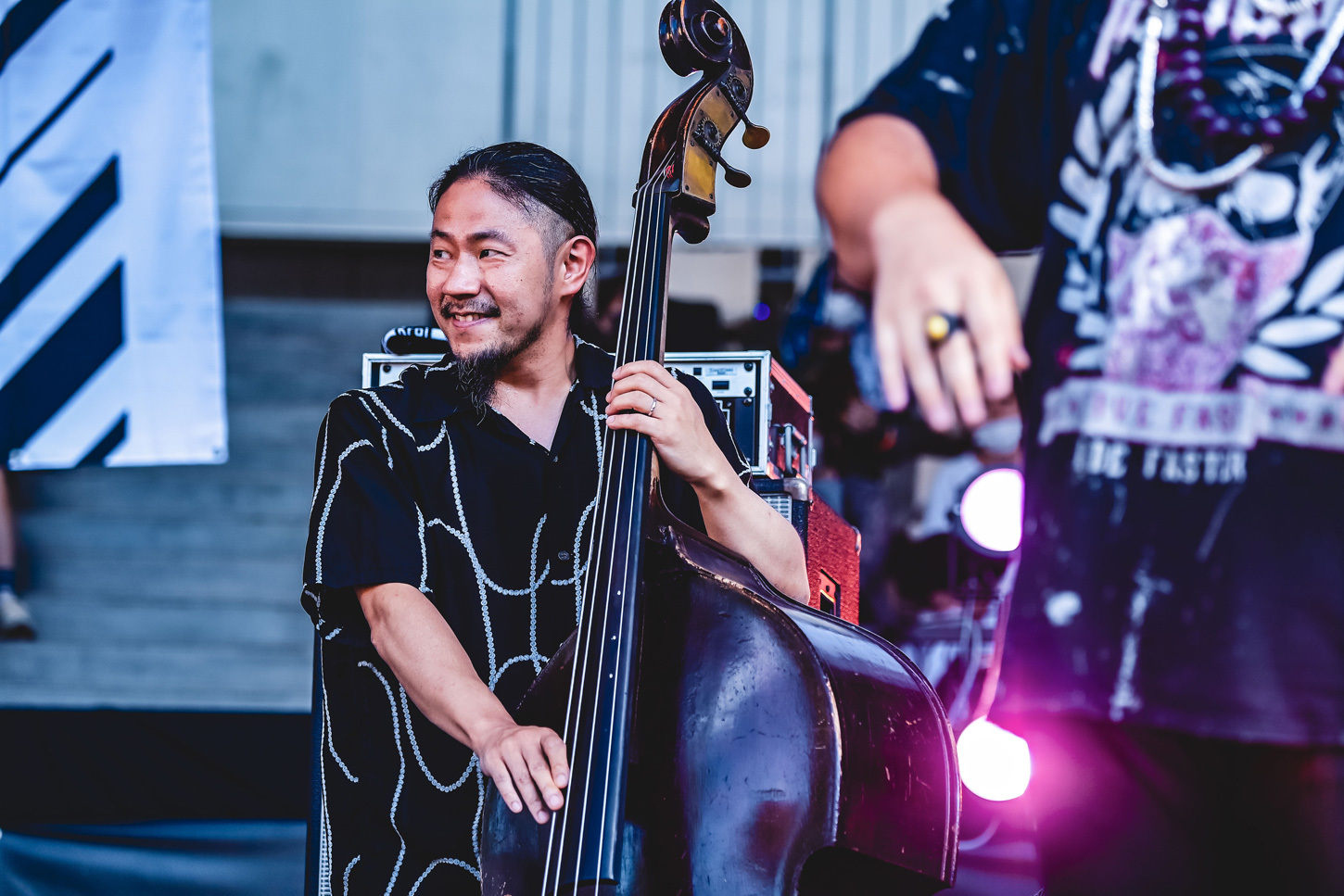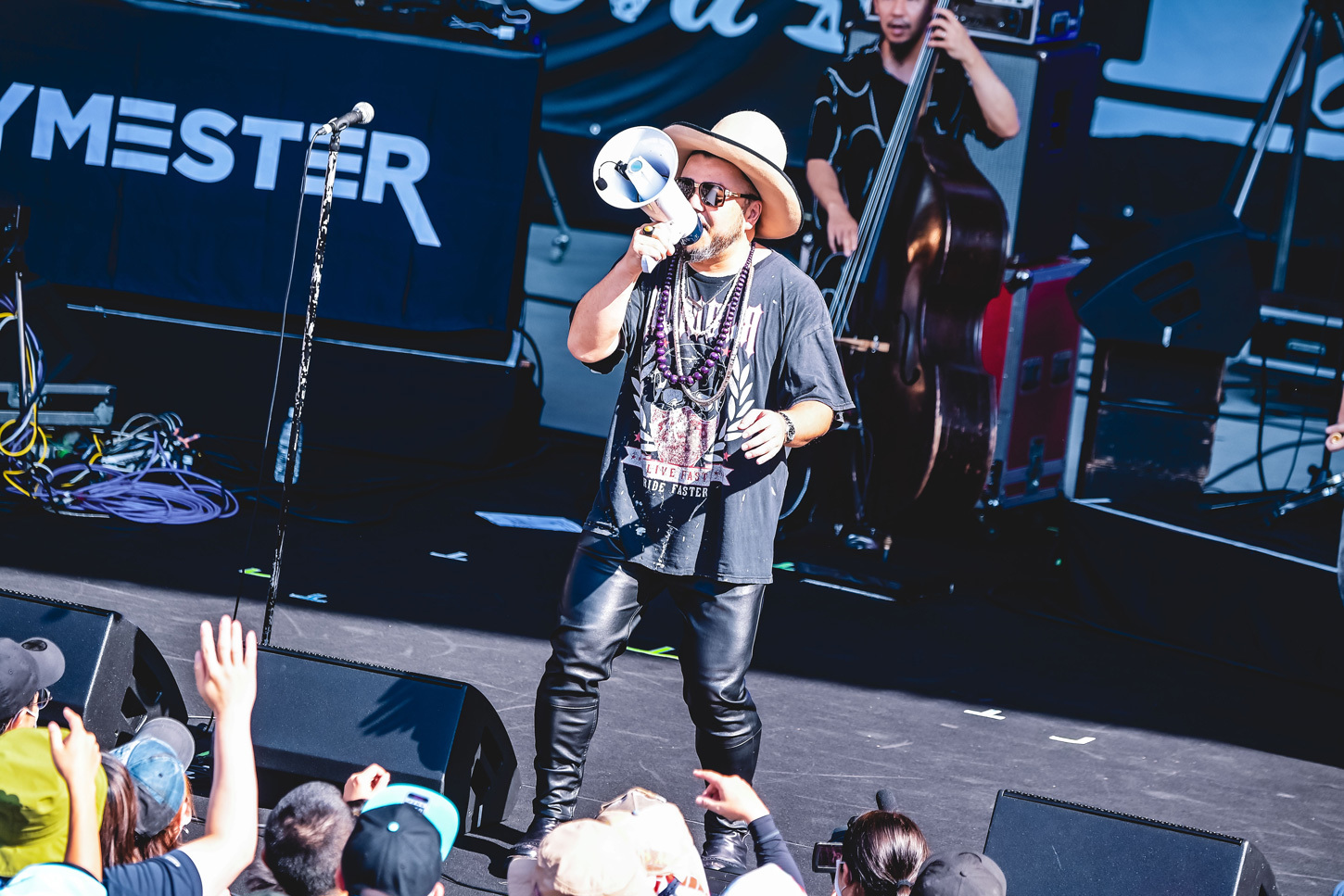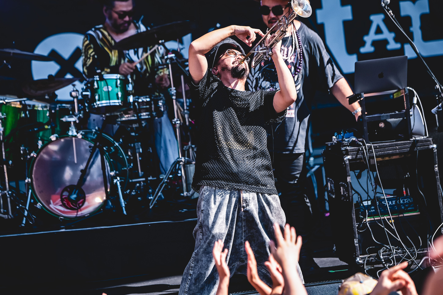 そして、続くSOIL&"PIMP"SESSION'S。社長(Agitator)が暑さから上着を脱ぎ捨てると「みんなも脱げるものは脱いでここに置いていこう!」と投げかけ、分厚いサウンドを放ちグルーヴを練り上げていく。タブゾンビ(Tp)、丈青(Pf)、秋田ゴールドマン(Ba)、みどりん(Dr)とそれぞれのスキルが際立つソロパートでこそ、会場が大いに湧きクラップが鳴り響く瞬間は痛快。シンプルに音を楽しみ、身を委ねる時間がとにかく心地いい。夏の曲をと「SUMMER GODDESS」で熱烈に締めくくり、「この組み合わせはまちがいない。何度となくこのステージでいろんな音を鳴らしてきたけど、今日もやるよ!」と呼び込まれてRHYMESTERが再登場。Mummy-Dも「楽しみで仕方なかったよ」と喜びをあらわに「Funky Pongi × 爆発的」でセッションスタート。