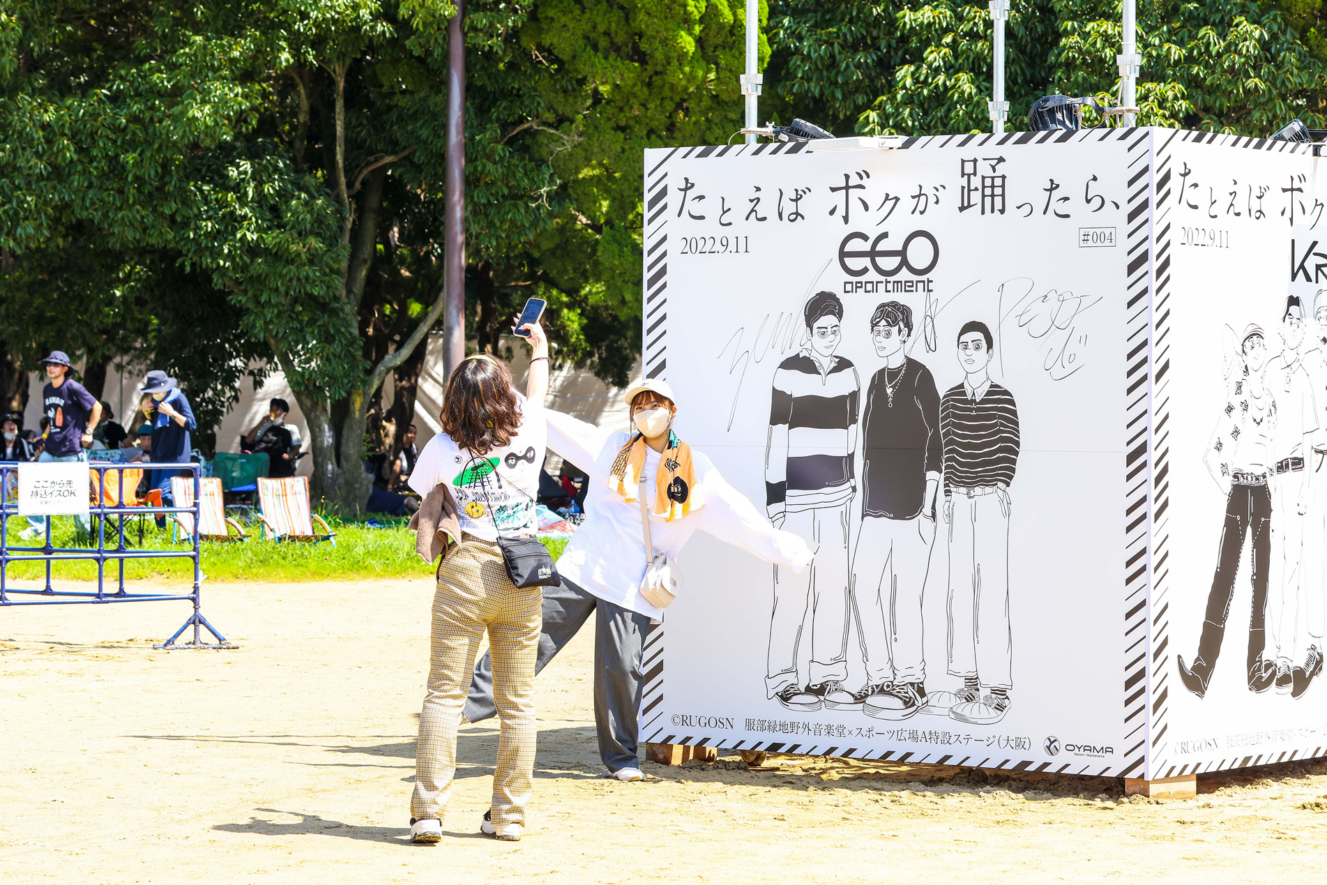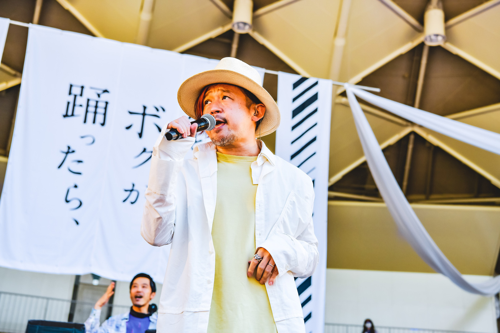 朝早い時間から多くの観客がつめかけ、アウトドアチェアを設置したり最前で待機したり、それぞれの楽しみ方で開演を待ち侘びる中、『ボク踊』のこれまでを見届けてきたFM802・DJの加藤真樹子がMCで登場。開催できた喜びをあらわに、「気持ちよく踊りましょう!」と呼びかけから、ステージに登場したウェルカムアクト、ego apartmentのライブで開幕。