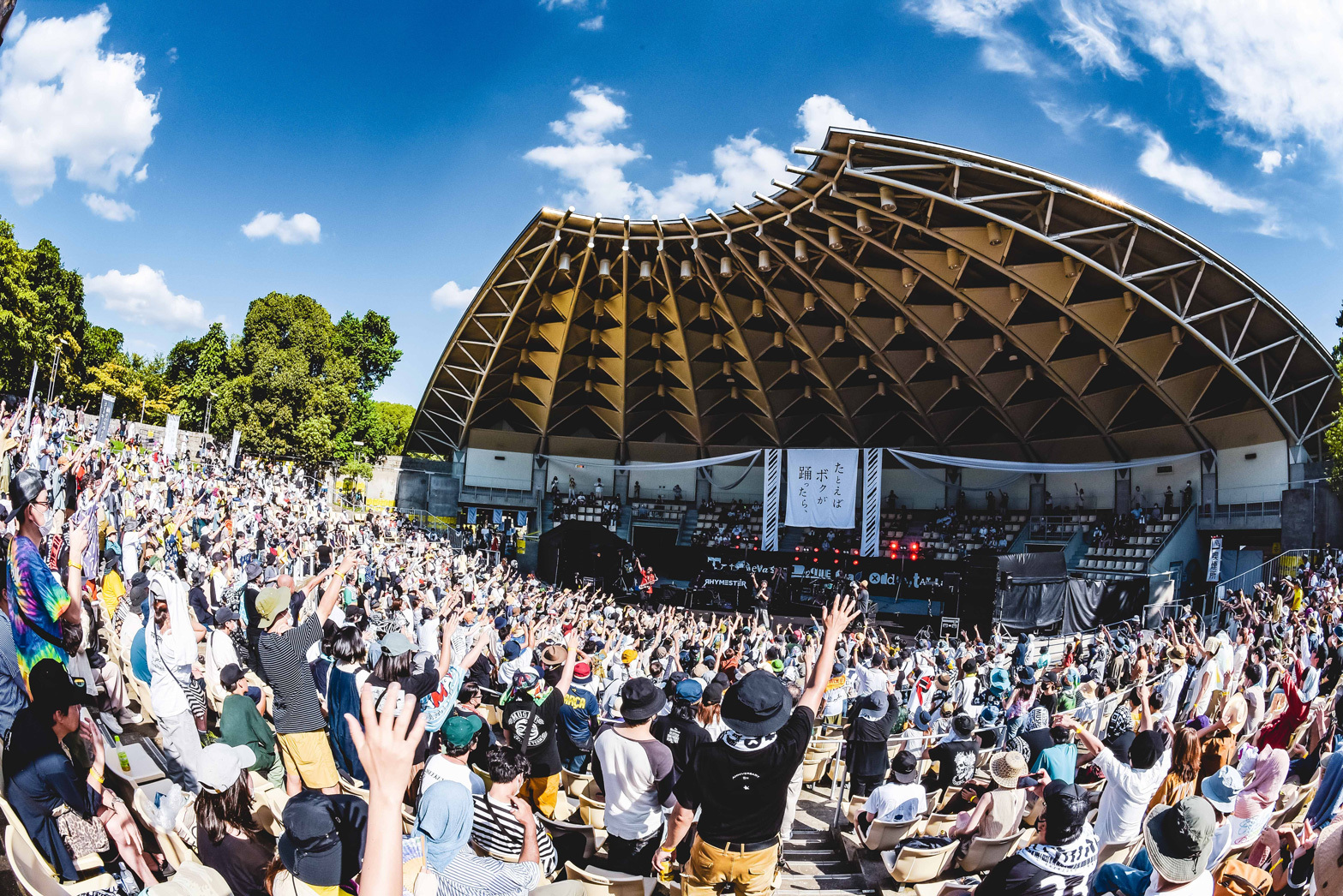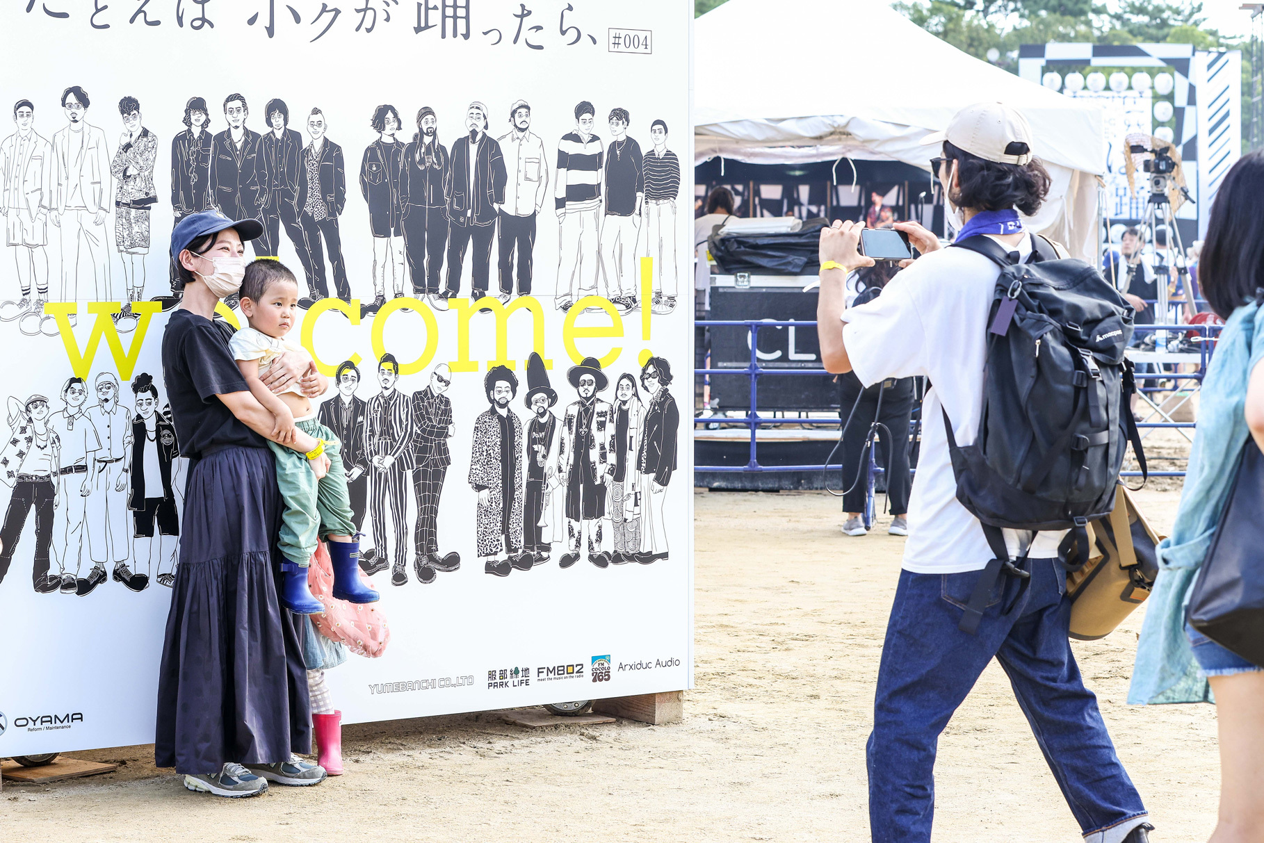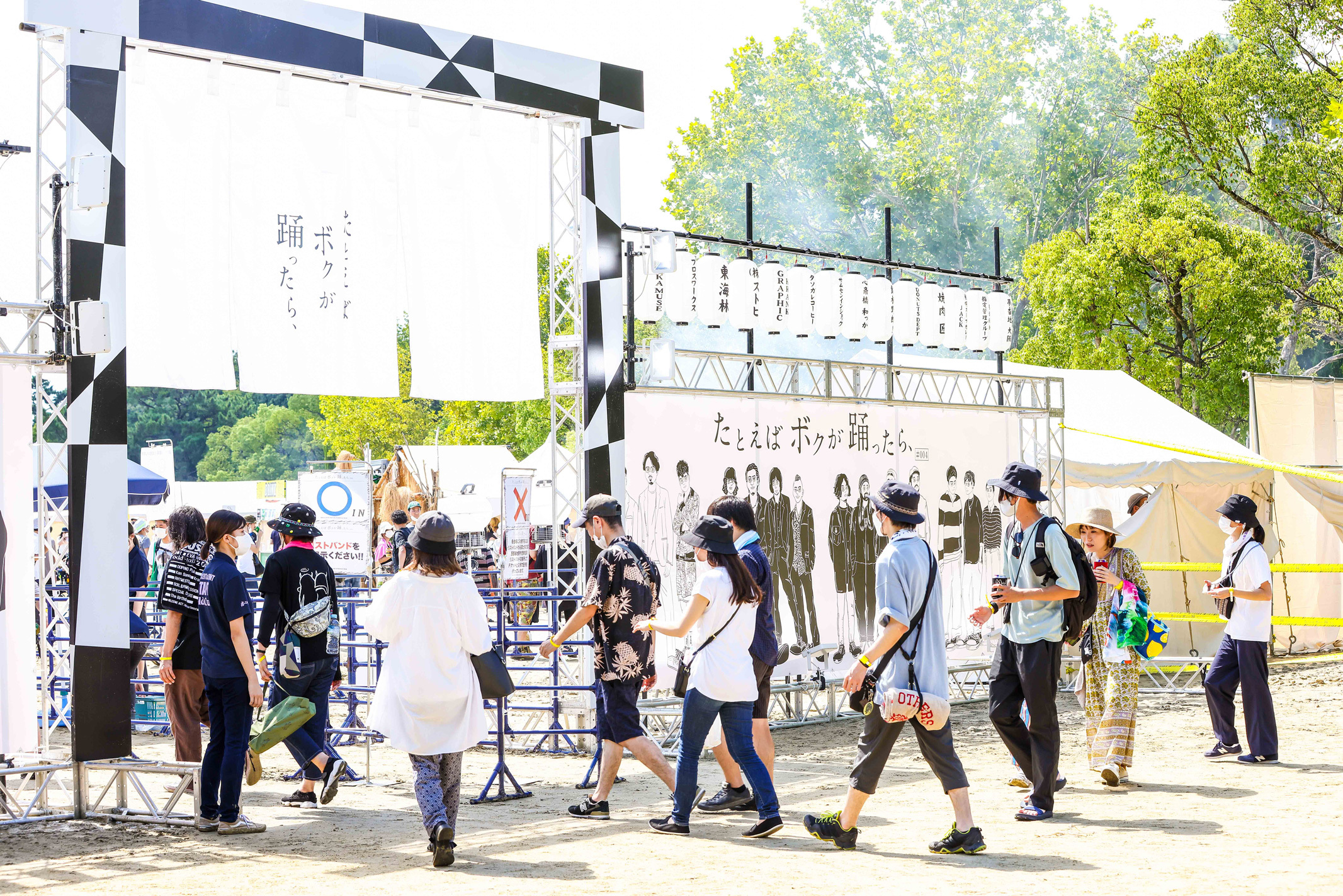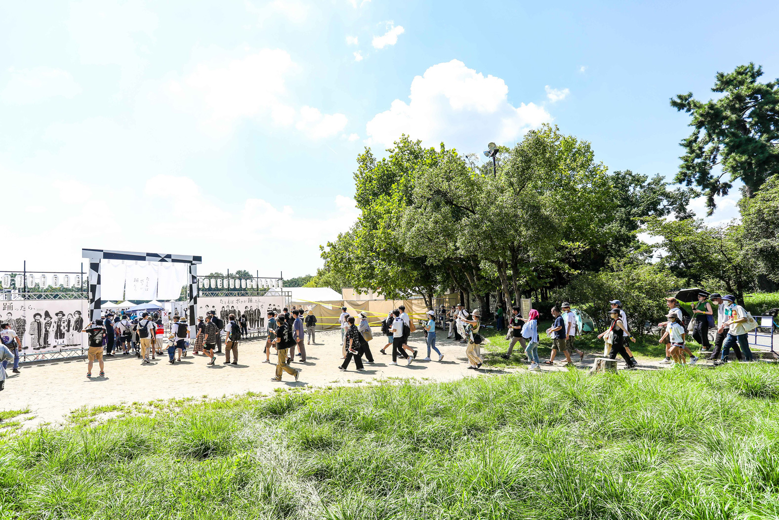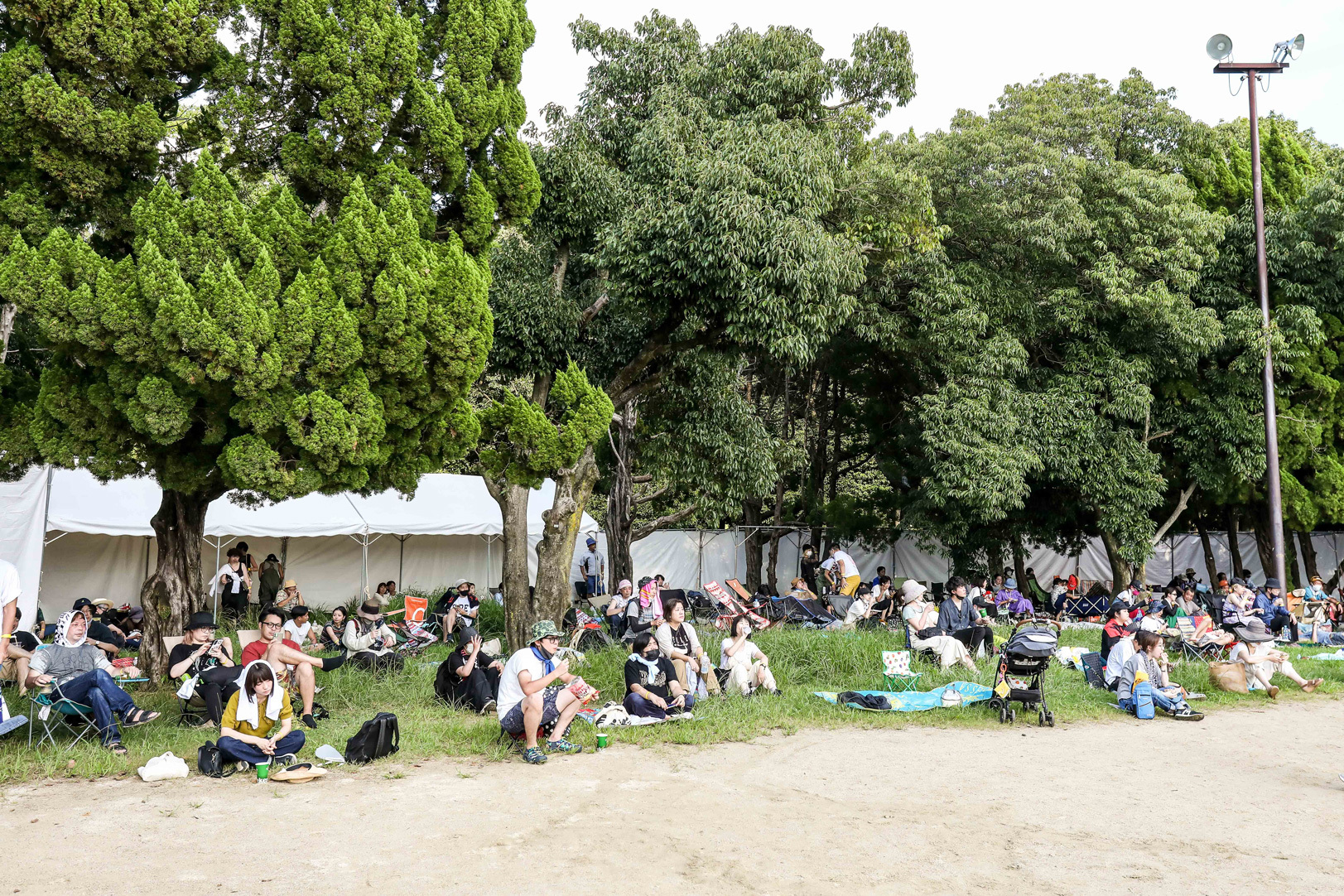 前置きが長くなったが、だからこそ今年のうなだれるほど暑い晴天も喜びとなり、開催できた安堵がなによりまず大きかった人も多いはず。(ちなみに今年も直前に大雨が降り、前日のゲリラ豪雨で運営スタッフの心が折れた場面もあった)。さて、そういった歴史を踏まえると、最寄りの緑地公園駅から会場まで続く道にずらりとポスターが貼られた光景だけで込み上げてくるものがある。ここで『ボク踊』を語る上でかかせないロケーションについても触れておくと、東京からでも日帰り可能なほどアクセス良好な立地にあり、緑豊かな公園内にある2つのステージでライブが楽しめる。徒歩10分ほどの両ステージ間はもちろん、公園内に案内板などほとんどなく最低限にとどめられている。禁止行為や過剰な案内板を掲げなくとも、『ボク踊』に足を運んだ人たちなら大丈夫、という信頼の証のようにも感じた。また休日のおでかけで訪れたファミリーやランニングしている人たちなど日常的に公園を利用している人も多いため、そういった一般利用者と共存しているのもほかにはない風景のように思う。