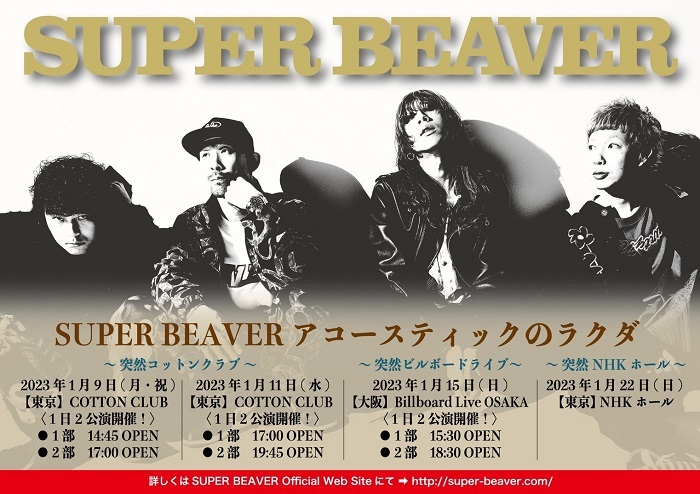 今回のツアータイトルは、『SUPER BEAVER アコースティックのラクダ』と名付けられており、サブタイトルの部分に”突然”会場名と銘打っている。ツアータイトルからも読み取れるように、アコースティック編成でのライブが実施される予定だ。