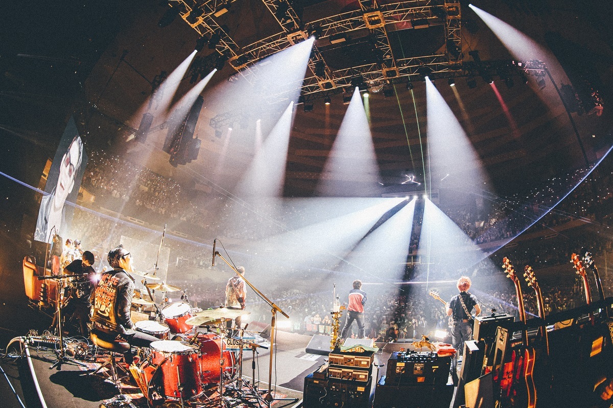7人編成で「エマ」、「平成ペイン」を思いっきり鳴らしたあと、本編ラストのMC。「何が楽しいかってさ、やっぱり自分が“好きやな、この人”って思う人と音楽が一緒にできることで」と切り出した牧が語ったのは、この4人でずっとやってきたからこそ、4人で鳴らす音楽を完全なものだと心のどこかで思っていたし、それ以外を排除しようという気持ちが若い頃はあったということ。その気持ちのまま、2年前に武道館に立ち、どこまでも行けそうなほど自分たちの音楽を信じられたこと。その後、『LIFE IS BEAUTIFUL』制作時、頭の中で鳴っていた音を実現させるために、今一緒にライブをしている井上、手島、ファンファンに出会ったこと。