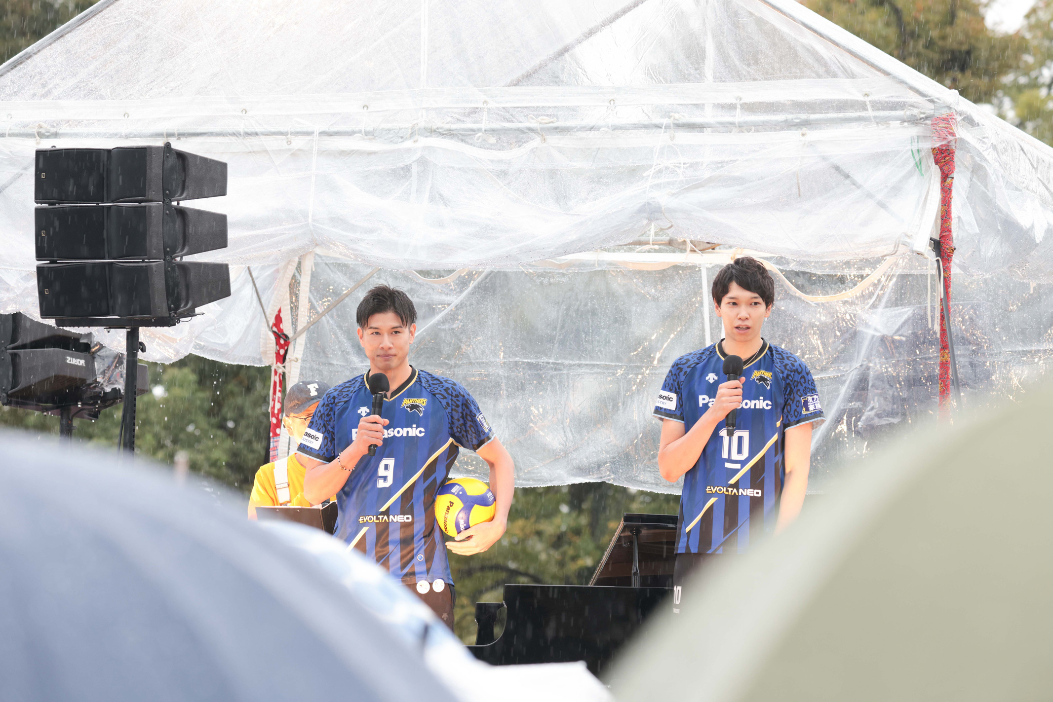 ここで、大阪府内にホームタウンを持つ16のトップスポーツチームで構成する「大阪スポーツプロジェクト」から、大阪府枚方市を本拠地とする男子バレーボールチーム・パナソニックパンサーズのPRタイム。山内晶大選手と今村貴彦選手が登場し、陽気に挨拶。193cmと2m4cmという身長には客席からどよめきが起こった。FM802 DJ・中島ヒロトとの掛け合いも楽しく、Vリーグ4年ぶりの優勝に向けての意気込みを力強く語った。