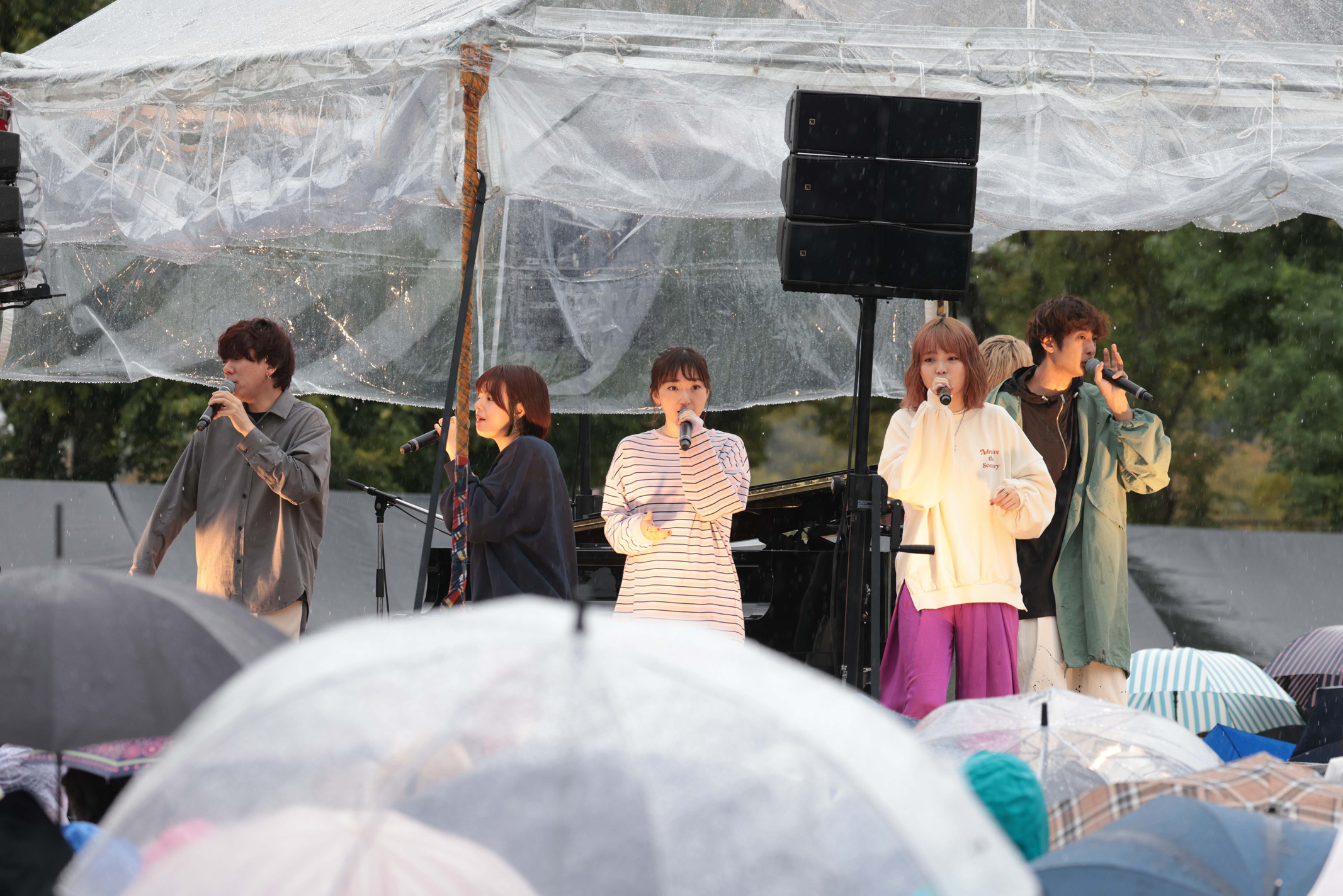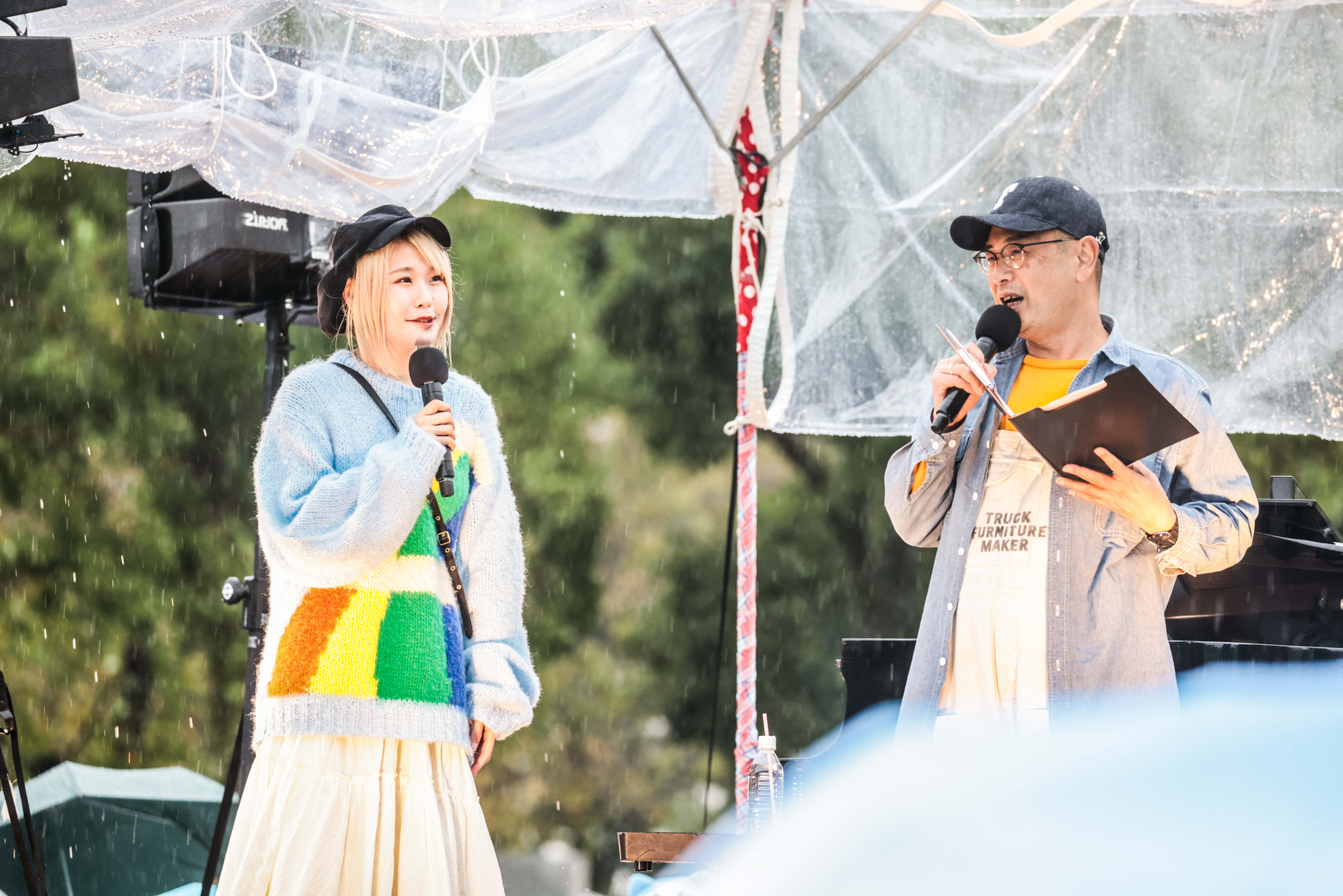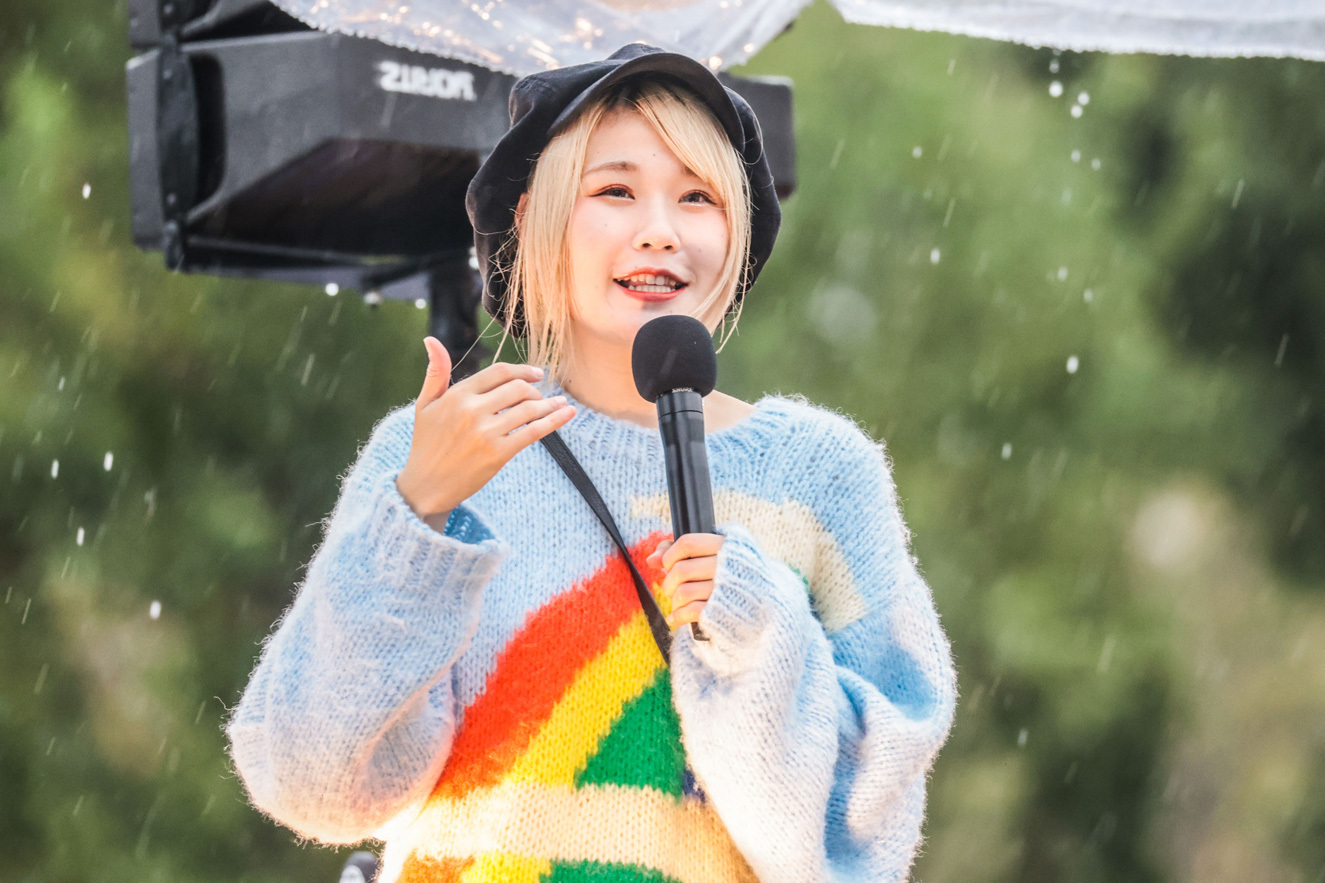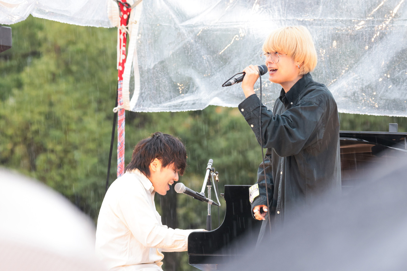 スペシャルフリーライブの前には、オープニングステージで。声にならないよとNagie Laneの2組が登場。トップバッターの声にならないよは、「あなたの声にならない思いを歌う」をコンセプトに2020年から活動を行っている、若宮めめ(Vo.)とHiRo(Pf.)による2人組バンド。若宮は「ハラミちゃんさんの前ということで緊張しますね(笑)」と言いつつも、HiRoの伴奏で透明感と安定感のある歌声を響かせ、情緒豊かに「いつかの話」などを歌い上げた。グリーンの森をバックに響いた、しっとりとしたピアノの音と美しいハーモニーは、降り続ける雨も効果的なエッセンスにしてしまう。それが野外ステージの良さだと感じられる、清涼感のあるライブだった。