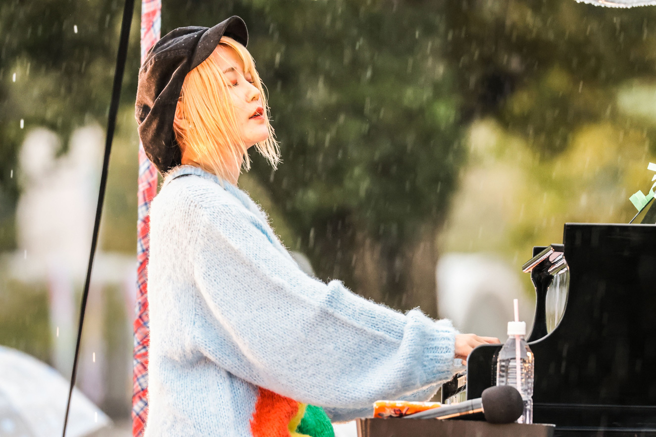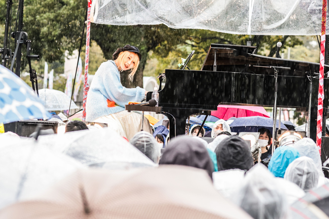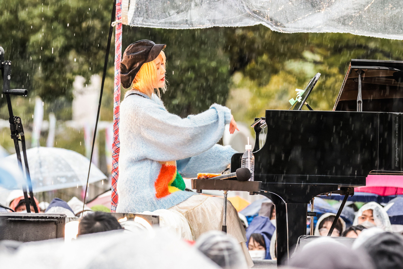 雨が激しくなる中、いよいよハラミちゃんのスペシャルステージがスタート。登場したハラミちゃんは「こんにちはー! ハラミちゃんでーす! めっちゃ雨だね。ごめんね、ありがとう。風邪引かないでね!」と観客を気遣いながら、「こんな土砂降りの中弾くことは初めてなので、湿気がものすごい中、どんな音が鳴るのか逆に楽しみになってきました」と、オリジナル曲「ファンファーレ」を披露。繊細な音から壮大な音に高まるメロディアスな旋律が、ハラミちゃんの世界観を作り上げる。続いてはOfficial髭男dismの「ミックスナッツ」を疾走感をもって駆け抜ける。この寒さの中、指が高速で動くのは単純にすごい。クラップも自然発生し、観客はすっかり釘付けの様子だった。
