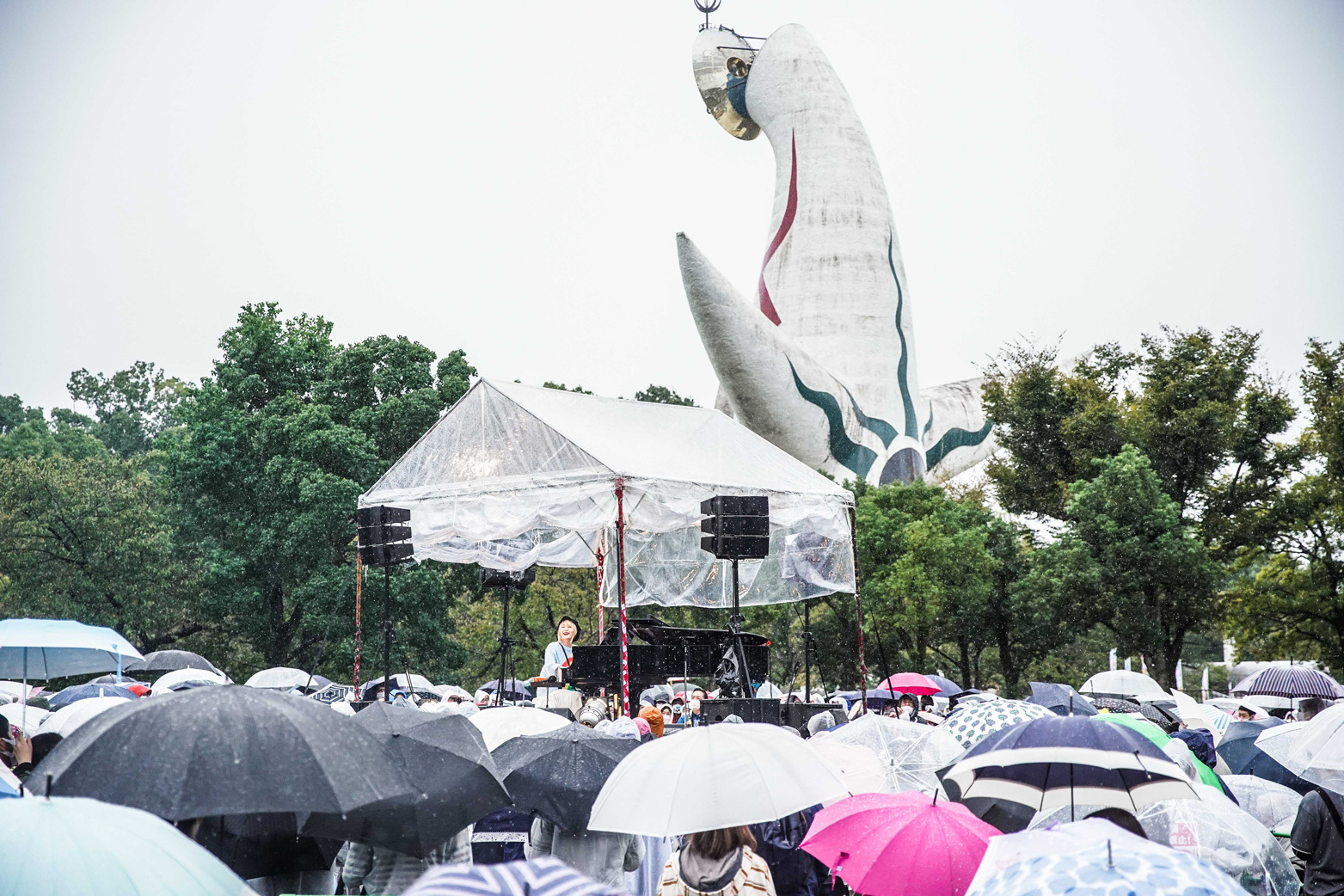 そして広場の西側にはライブスペースが。この日のステージは360°観客が囲むことのできる形状になっていた。正方形のステージの中央にはグランドピアノが置かれている。優先観覧エリアはもちろん、フリーエリアでも、観客は皆カッパを着たり傘をさして今か今かとスタートを待ちわびていた。