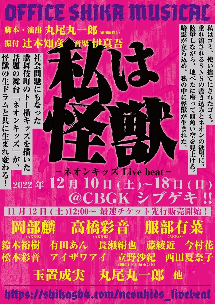 2022年12月10日(土)〜18日(日)CBGKシブゲキ!!にて、OFFICE SHIKA MUSICAL『私は怪獣-ネオンキッズ Live beat-』が上演されることが決定した。