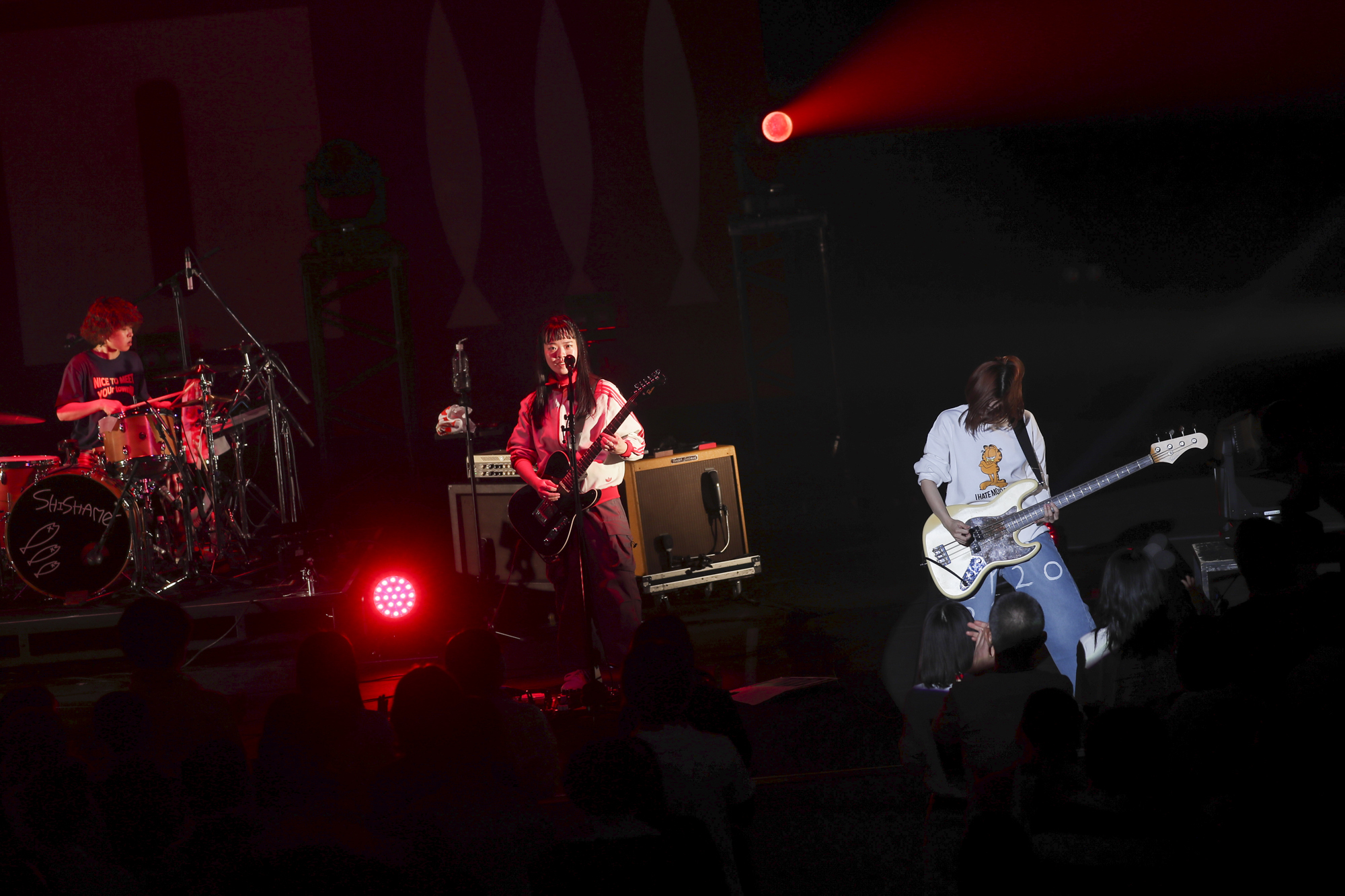 宮崎朝子(Gt.Vo)、松岡彩(Ba)、吉川美冴貴(Dr)が登場した瞬間の拍手が温かい。“自分たちの街に会いに来てくれた”という感謝の念や喜びが、拍手にも込められていたのだろう。バンドの演奏が始まった瞬間に、観客のハンドクラップが起こった。そのクラップの音色も温かい。ウェルカムの音色と表現したくなった。SHISHAMOも、初めての街だからと言って、“よそゆき”の演奏をするのでなくて、普段どおりの気合いの入った演奏を展開した。フレンドリーな歌がダイレクトに届いてくる。ステージと客席との心理的な距離が一気に縮まっていくのがわかる。