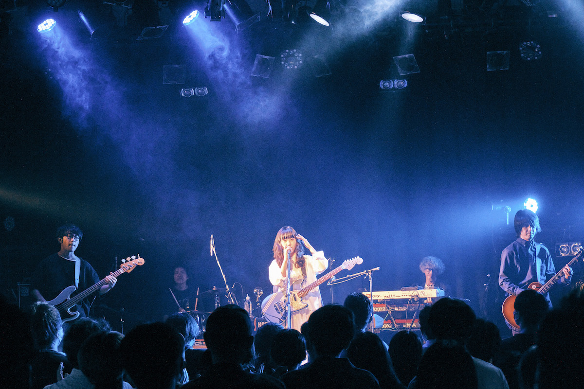 『星屑ドライブ – ep』のリリース時のインタビューで、Karin.は1stツアーの反省も踏まえて「次のツアーではバンドのグルーヴに対応したい」と語っていたけれど、この日の「永遠が続くのは」や「星屑ドライブ」の演奏で感じたのはむしろ彼女のグルーヴがバンド化されているということ。まず彼女の歌があり、そして彼女の歌いたい気持ちがあり、それに共振してバンドのアンサンブルがドライブしていく。どちらの曲も決してアップなナンバーではないけれど、“ドライブ”という言葉を使いたくなるような駆動力で、その歌自体の物語を前に進め、そしてオーディエンスの気持ちを引っ張っていった。