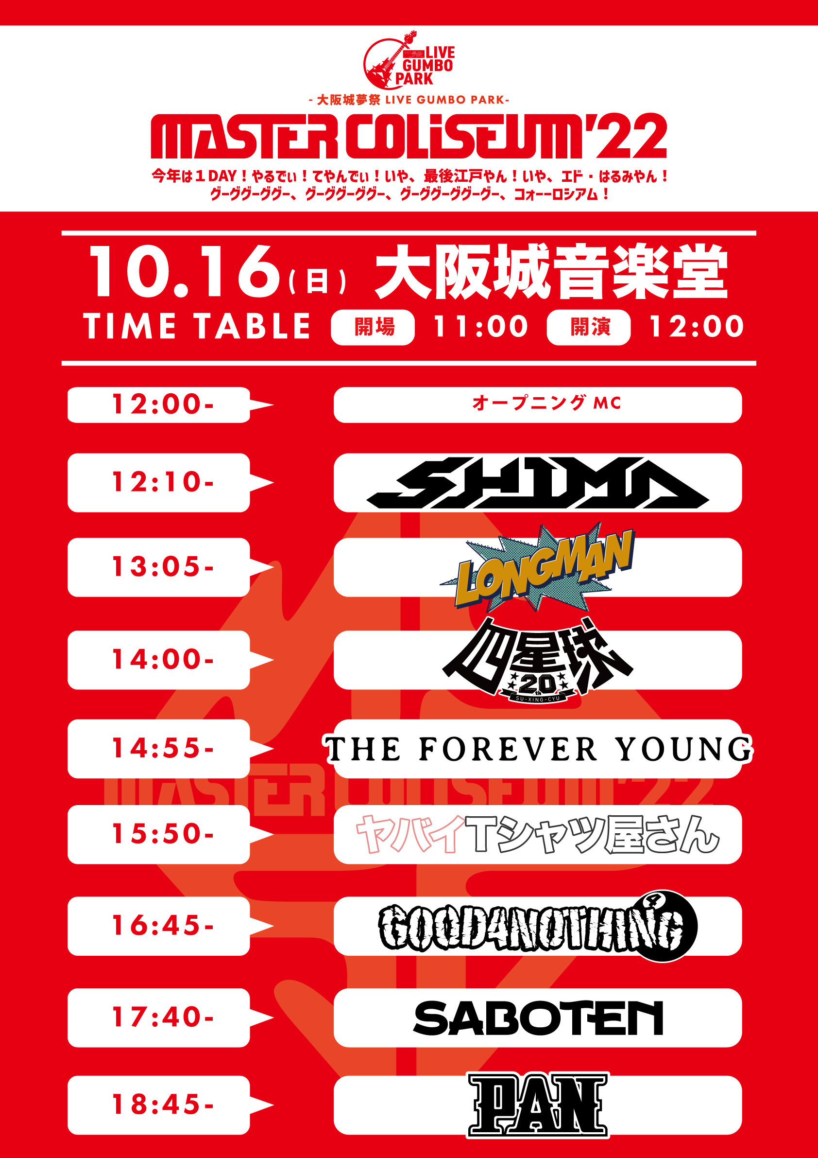 10月16日(日)に大阪・大阪城音楽堂で開催される『MASTER COLISEUM ’22』のタイムテーブルが発表された。