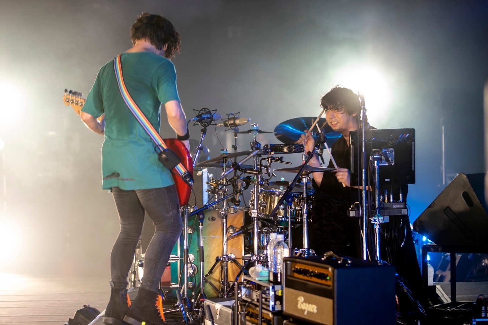 斎藤の挨拶はたったひとこと。田淵智也のいかした4ビートがリードするロカビリー調の「CAPACITY超える」から、明朗快活な「Silent Libre Mirage」へ、そして斎藤の歪み切ったグランジなギターリフが炸裂する「Own Civilization(nano-mile met)」へ。完全に限界を超えていたのが「ラディアルナイトチェイサー」から「fake town baby」への流れで、常軌を逸したスピードと急カーブの連続に、振り落とされずにいるだけで精いっぱい。貴雄の両手は一体どこを叩いているのか、速すぎてまったくわからない。田淵はステージをうろうろしているように見せて、一ミリたりとも音を外さない。斎藤のギターからは3人ぶんくらいの音が聴こえてくるがどう見ても一人だ。音の切れ目にぴたりと合わせてスポットが3人をとらえ、スモークが吹きあがる。スタッフワークも完璧だ。