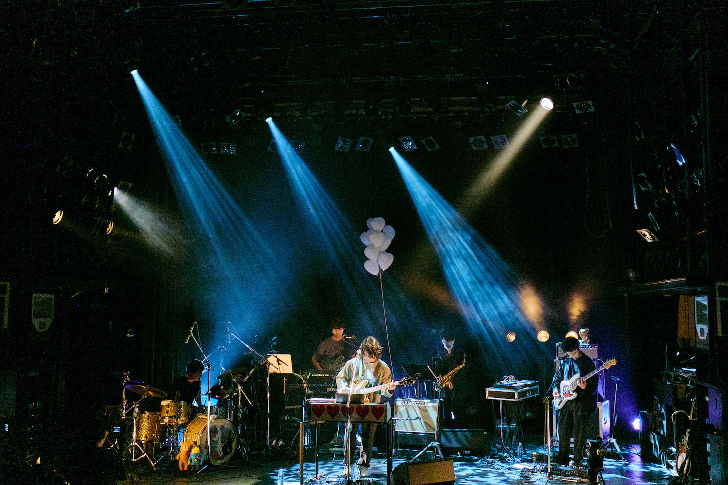 会場全体が高い集中力を見せたブロックの後は「次の曲は楽しく行きましょう。すごく歌が早口でドキドキの曲なんですが、やります」と、90年代のJ-POPを換骨奪胎し、雄貴のトーキングボーカルでアップデートした感のある「気球だよ」を披露。歌メロで牽引して行き、エンディングでは思わず歓声が上がった。さらにアルバムの中でも最も柔らかな印象を残す「花びらのかたち」が音源よりAORフレーバーを増して演奏される。それでも特定の時代感を飛び越えて、今この時でしかない音像へと融合されるのは尾崎雄貴という人にしか書けないメロディのなせる技だろう。絶妙な抜き差しを聴かせてきた5人がロックバンド然としたプレイを聴かせた「やりたいこと」には、そのサウンドが必然だったように、無謀さや無邪気さを持っていたあの頃に見つけた“やりたいこと”の答えがあったように感じられたのは自分だけだろうか。率直にいうと、バンドということなのだが、痛快とか根拠なしとか、誰のためでもなく自分が楽しいと思えることは全て“やりたいこと”なのだろうと思う。フロアに正対して歌い続けてきた雄貴の堂々たる振る舞いに加えて、楽しそうな表情にこちらもつられてしまう。