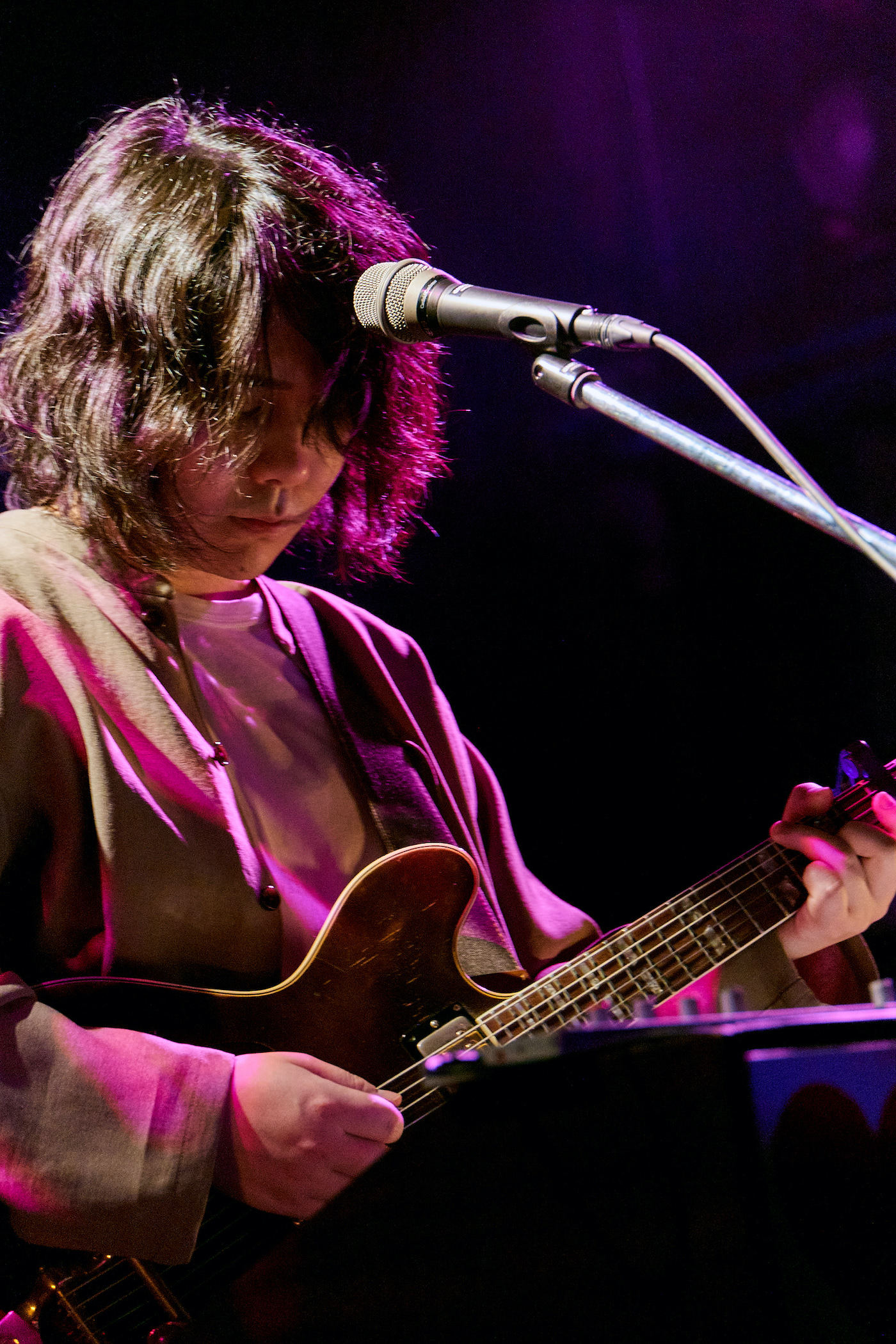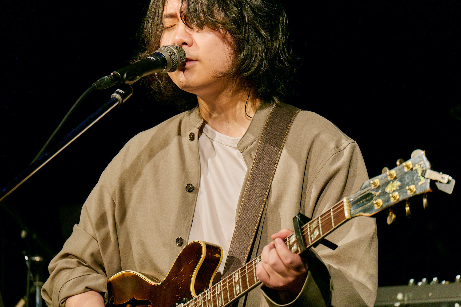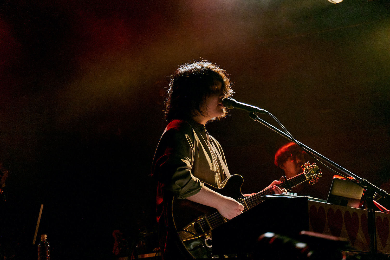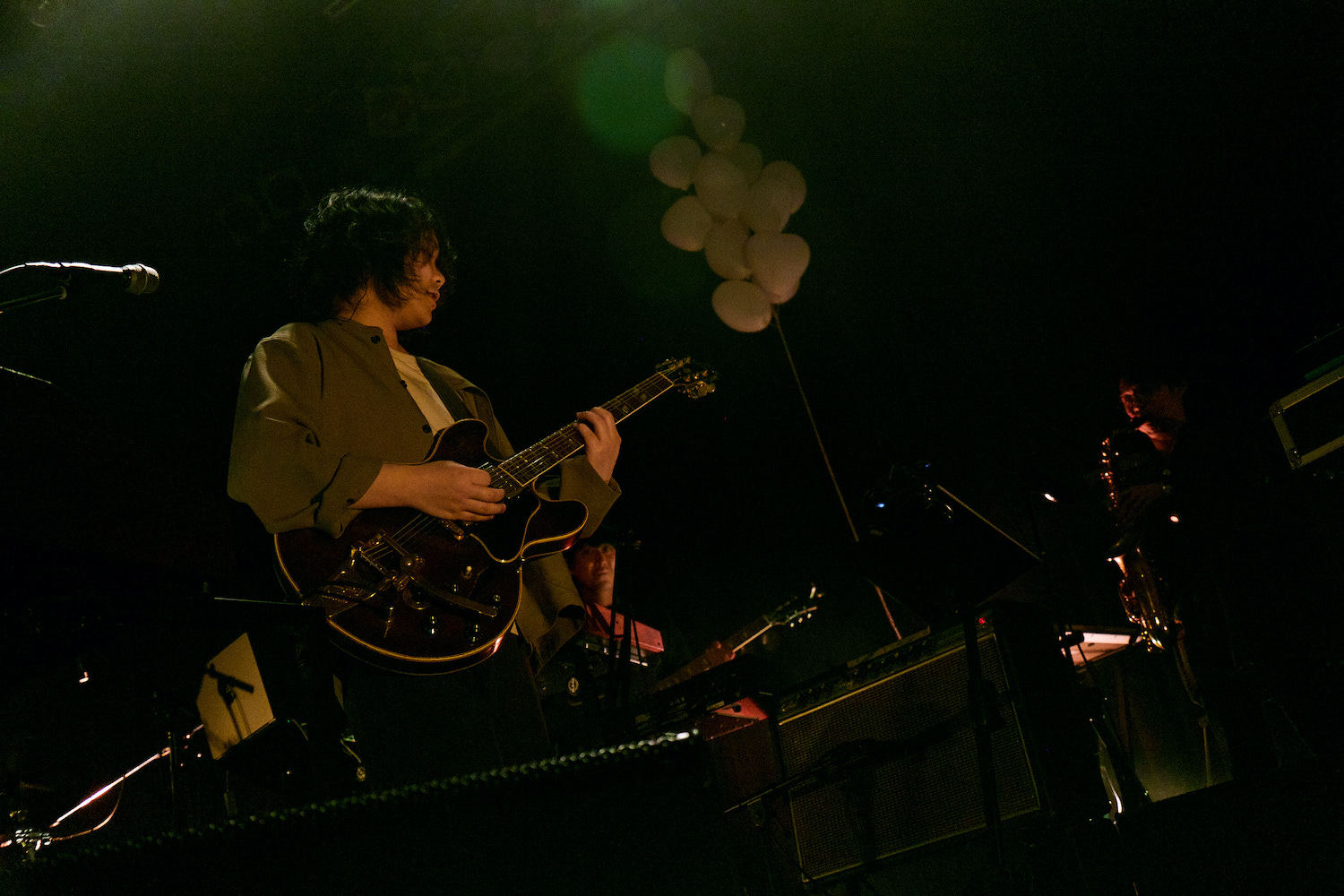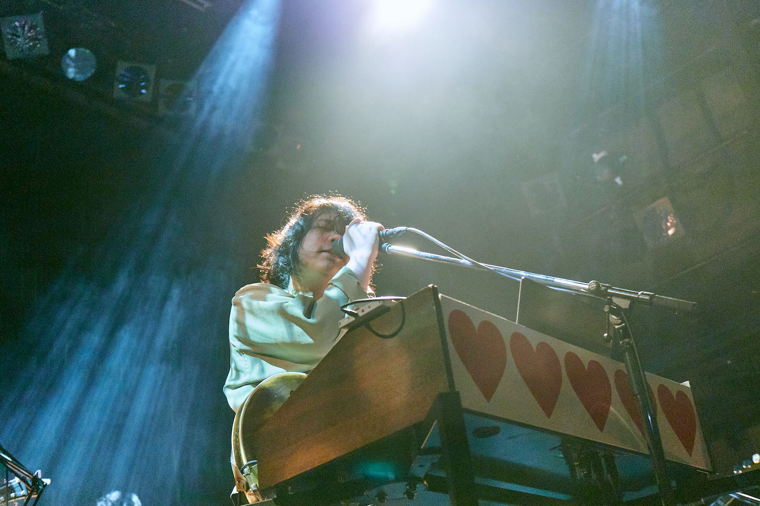 この後、和樹に促され予定していなかったMCをした雄貴。『Patch』が「Ouchi Daisuki Club Records」からの初リリースであること、コロナ禍もあり、自分は何も好きじゃないかもしれない気持ちに落ち込んだこと、そんな中で心に絆創膏を貼るみたいだなと思いながら、曲を書き溜めてまとめたことなどを話す。「音楽は物理的には治してくれないかもしれないけど、治癒力はあると思っているので、今日この風景を心に留めて、優しさを持って楽しみましょう」と述べ、大きな拍手が起きた。この語りから、USのキャリアの長いシンガーソングライターを思わせる神聖さに、シンセやサックスも自然と融合する「バブルガム」へ。続く「1991」での詩人の独白のような胸に迫る歌を聴いていると、前にも後ろにも動けないライブハウスにいることを一瞬忘れて、暗く広い空間で一人で聴いているような透徹した気持ちになる。これは尾崎雄貴の歌の中でもやはりwarbearならではの感覚で、ルーツミュージックに通じる音像がこんなにもパーソナルに響くこと自体が稀有なのだ。8ビートとコードストロークが加わり重層的になる中盤から、大人になることの痛みを吐き出すように歌ったあとはそれらが深海に沈んでいくようにシンセの音が揺蕩う。同世代に対する思いは次の「27」につながっていく。