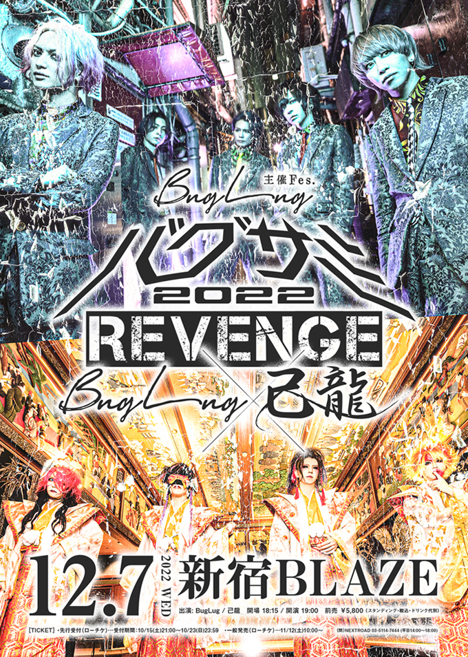 BugLugと己龍の2マンライブ『バグサミ 2022 -REVENGE-』が、12月7日(水)に新宿BLAZEで開催されることが発表された。