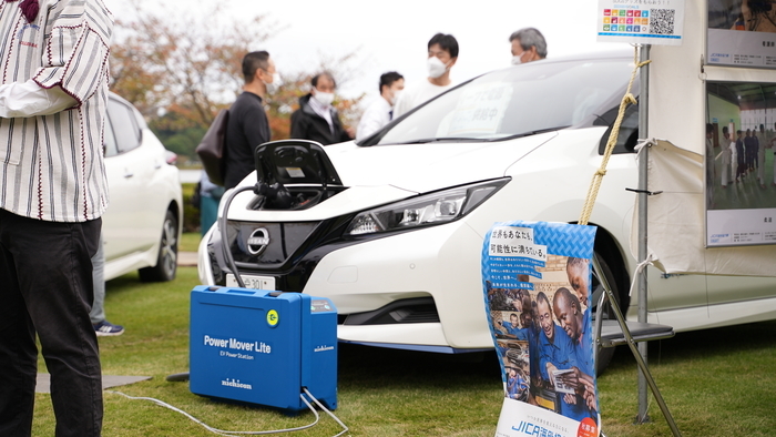 このイベントでは、各所のゾーンの一部の電力供給にEVが使われ、日産の「アリア」、「リーフ」、「サクラ」の3車種が様々なエリアに点在して電力を供給していた。