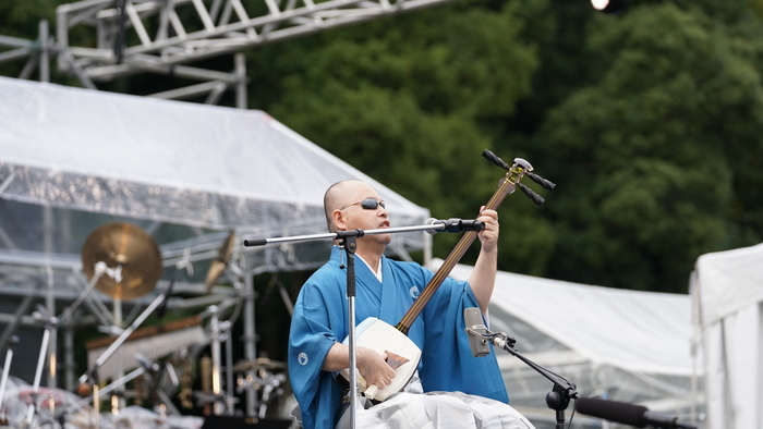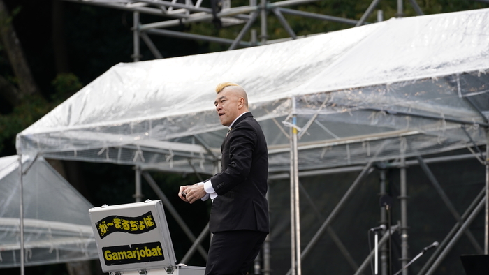 米米CLUBの“シュークリームシュ”率いるよさこいチーム「チーム朱舞」のダンスパフォーマンスから始まった15日のステージ。その後、地元「大成女子高等学校吹奏楽部」、津軽三味線第一人者の「踊正太郎」の演奏、「が~まるちょば」はステージを降りて来場者を巻き込んでのパントマイムパフォーーマンス、お笑い芸人「カミナリ」による漫才ライブと続いた後、昨日までの雨を引きずるような曇天からようやく太陽が顔をのぞかせ始めた。