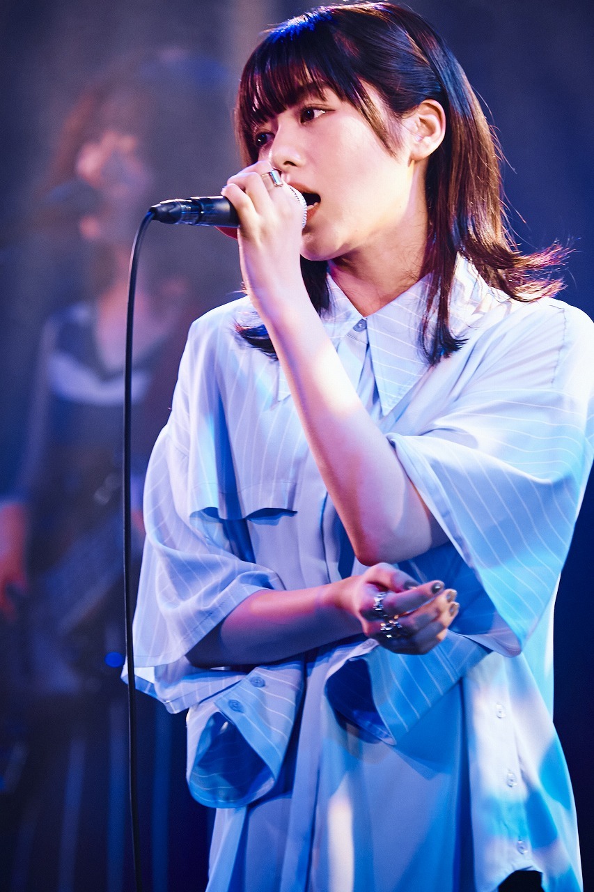 今年4月にリリースされた1st EP『水気を謳う』のオープニングを飾っていた「お茶でも飲んで」では、笑顔で<お話にならないよ>と自問自答を繰り返し、同作に収録されたシティポップ「海が乾く頃」では、会いたくても会えない人への思いが詰まった感情をSEとして流れる波の音に紛らわすように表現。MCでは、「先月、初めてワンマンライブをして。今日は他のアーティストさんとライブをするのが初めてで緊張しています」と正直な気持ちを吐露し、TVアニメ『魔法科高校の劣等生 追憶編』の主題歌に起用されたデビュー曲「Ripe Aster」で、強い信念を持って生きていく姿勢を歌声で示すと、彼女の清く凛とした佇まいに観客の目は釘付けになった。