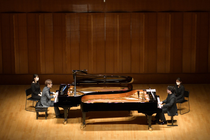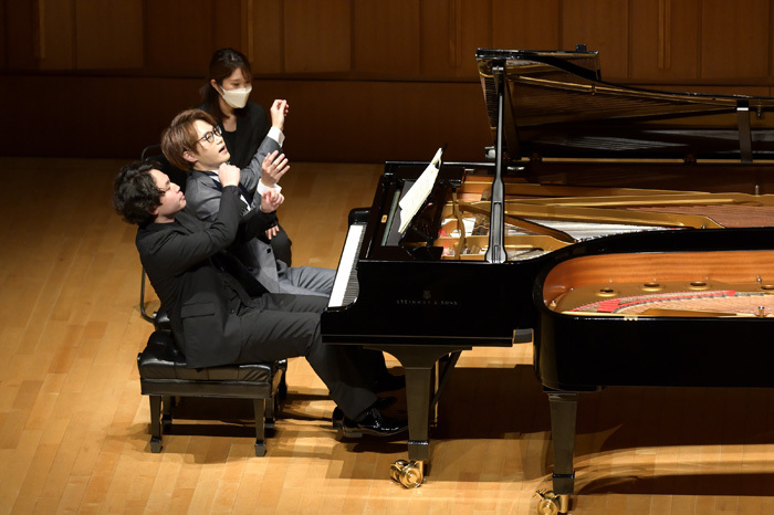 次第にそのリズムは大胆なアクセントをともなってさらに発展してゆく。特にフィナーレでの大団円は鮮やかなグリッサンドの技法なども存分に聴かせ、そのダイナミズムを各人が鮮やかな技巧で表現。スピード感、ダイナミクス、そしてスリリング感という点でも、あますところなく二台ピアノのピアニズムの醍醐味を聴かせてくれた。