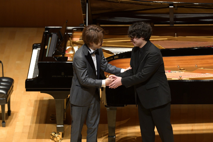 アンコールはブラームスの「ハンガリー舞曲 第5番」。鳴りやまぬ拍手に「雷鳴と稲妻」をもう一度。さらに乗りに乗った二人のスリリング感あふれる演奏に会場からは大喝采。冷めやらぬ会場からのエールに髙木と石井も思わず固い握手を交わし、会場のファンのあたたかいメッセージに応えていた。