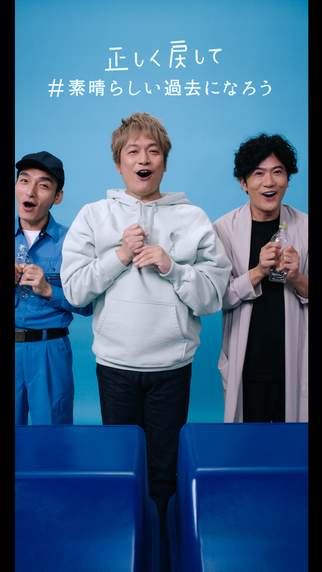 10月20日(木)「リサイクルの日」を記念して公開された動画「みんなで #素晴らしい過去になろう」では、CMシリーズのテーマソング「また逢う日まで」のメロディーに乗せ、稲垣・草彅・香取が、使用済みペットボトルの正しい分別を振り付けに取り入れたダンスを披露し、「正しく分別すれば、何度でも何度でもよみがえる」ことの大切さを伝えている。