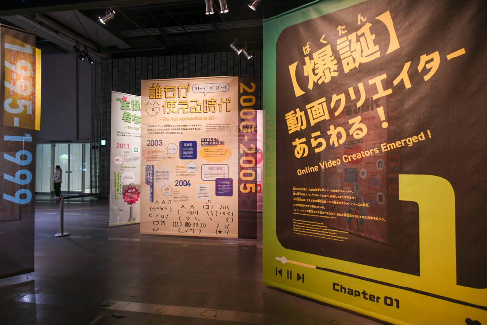 「爆誕」「傑作」「体験」「未来」の4章で構成されている本展。導入の「爆誕」では、90年代中盤から始まったインターネットの普及を経て、どのように「動画クリエイター」なる存在が生まれていったかという流れを時系列で紹介している。