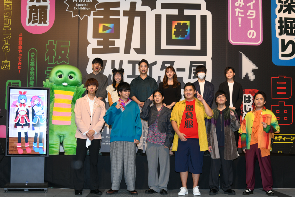 内覧会に合わせて開催された式典では、リモート出演となったおめがシスターズ以外の8組が会場に集結。単純に計算すると9組合計でチャンネル登録者数がほぼ3千万人というスタークリエイターたち。本展の展覧会サポーターを務めるガチャピンも特別ゲストとして加わって、全員が揃った壮観な風景は煌めきがハンパない!