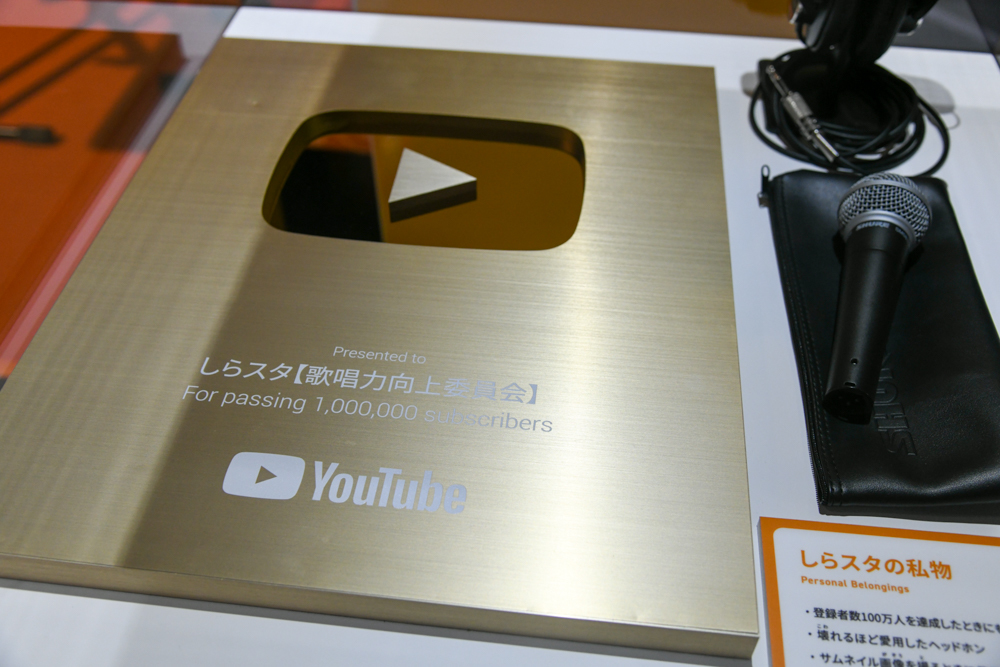 一方で、歌うことの楽しさを伝えてくれる「しらスタ【歌唱力向上委員会】」でおなじみ・しらスタの私物は、なんと、あのYouTubeチャンネル登録者数100万人を超えたクリエイターに与えられる、あの「金の盾」。トップクリエイターたちの「金の盾、届きました」系の動画でお目にかかることはあっても実物を直接見るのは初めて。YouTubeフリークならば、これを見に来るだけでも本展を訪れる価値が十分あるといえるだろう。