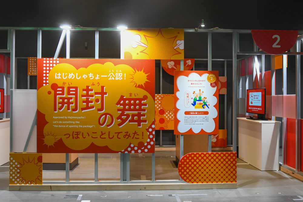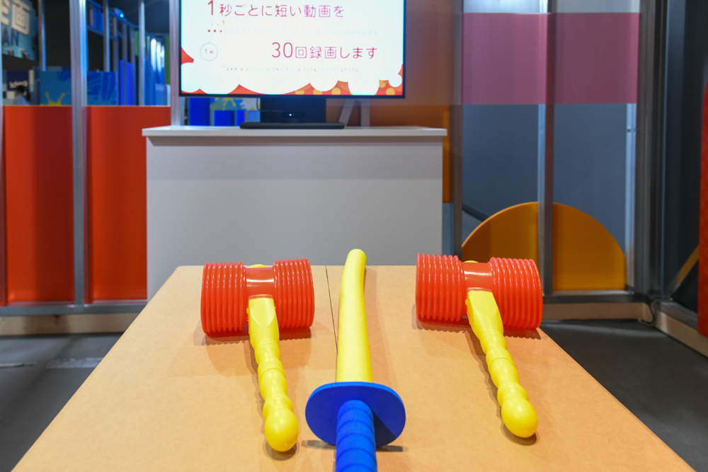 7種類ある体験のうち、はじめしゃちょーとコラボしたブースでは、何とあの「開封の舞」の撮影体験ができる。「(激しく開けようとすると)中の商品に傷つけてしまうことがあるので絶妙な塩梅が必要。中身を傷つけてしまうと作っている会社の人に怒られてしまうので、もし傷付けてしまっても、そこをうまくごまかすのも編集の技術」と式典の中で裏話を語ってくれた、はじめしゃちょー。おもちゃの刀やハンマーを持ち、段ボールを模したオブジェの周りを30秒動き回ると、あっという間に自分出演の「開封の舞」が完成。はじめしゃちょーのように思いきりやるのが、面白くなるポイントだ。