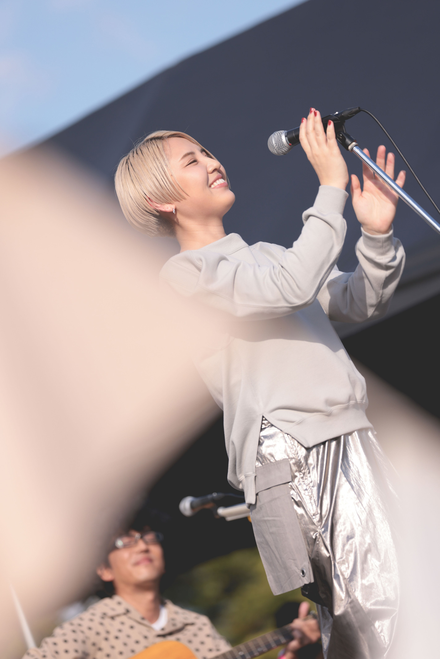 MCではちびっ子の掛け声に満面の笑みで応えたり、ステージの合間には歌唱に熱が入ってか腕まくりする姿も見えて、この日のステージに懸ける彼女の強い思いがうかがえる。ライブ後半にはアコースティックセットでのライブながら、「まだまだいきますよ!」と「TRUE BLUE」からアッパーなライブパフォーマンスを展開。最終曲の前には「これからも自分の可能性を信じて、音楽を奏で、届けていきたい」と、熱い思いを語り「レインボーローズ」まで全8曲を駆け抜けた。